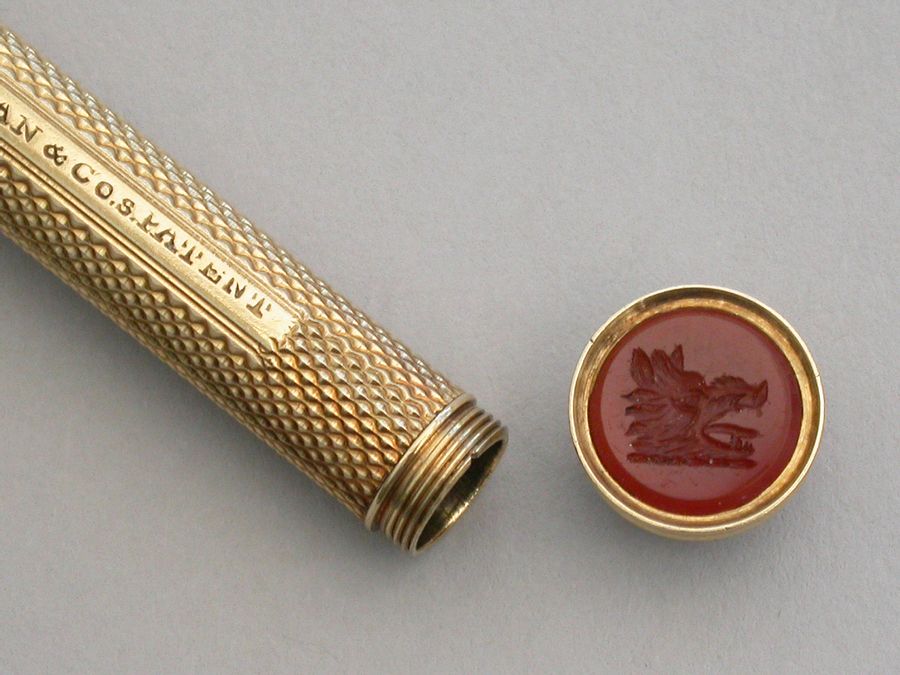 An extremely rare and early George IV 15 carat gold (tested) sliding Propelling Pencil with engine turned barrel, the terminal set with an agate seal stone engraved with a crest of a boar's head and unscrewing to reveal a lead reservoir.