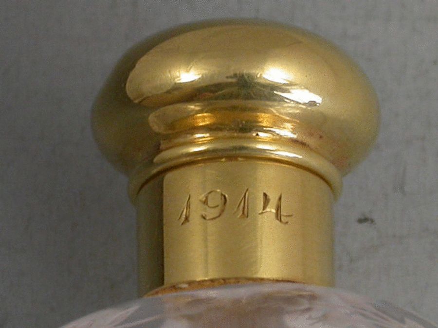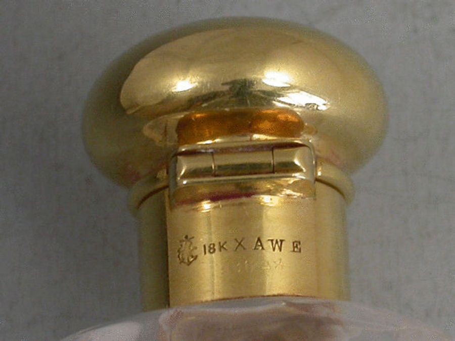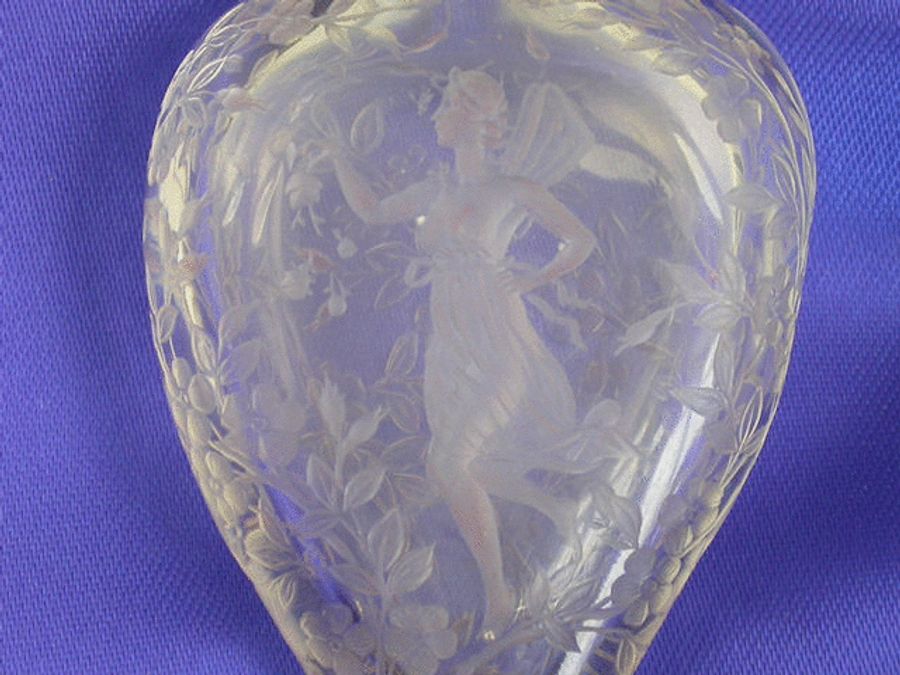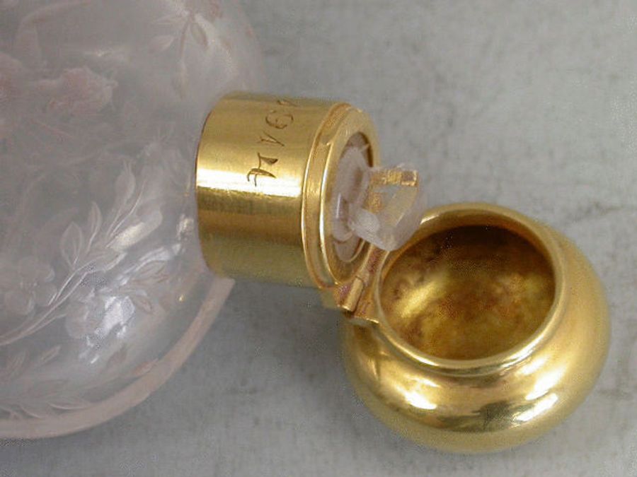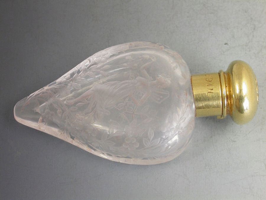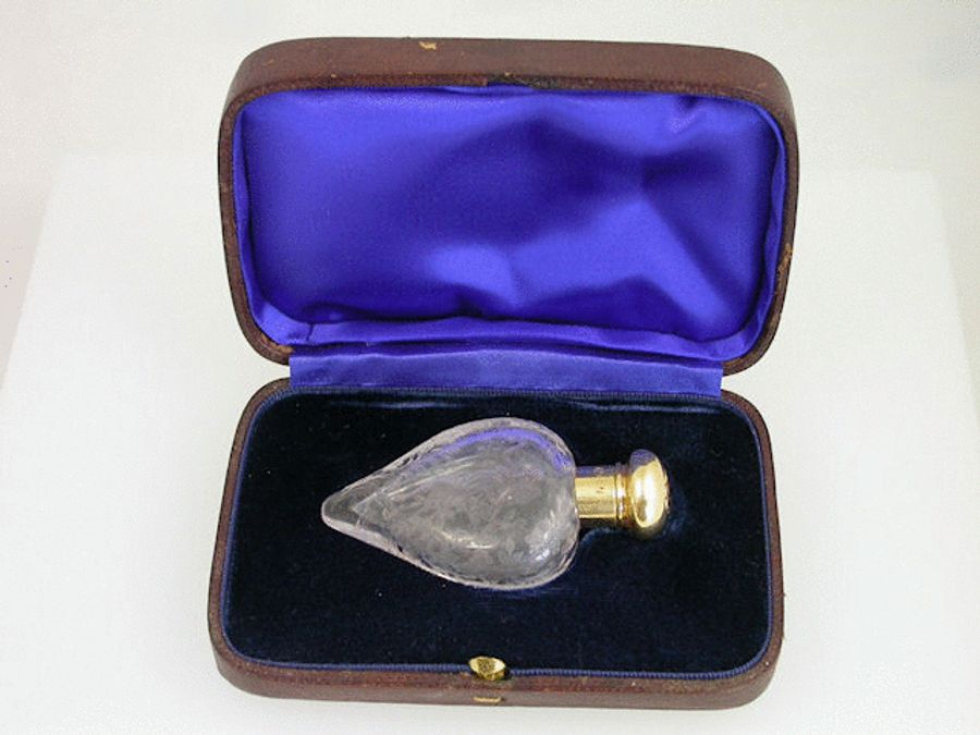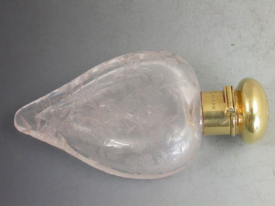 A very fine quality late 19th / early 20th century American glass Scent Bottle of heart shape form with 18 carat gold mount and lid, glass stopper. The superb intaglio cut glass body depicting a fairy picking flowers from a floral garland and the reverse with similar intersecting floral branches. The hinged gold top engraved with initials and the date 1914. Complete with associated fitted case.