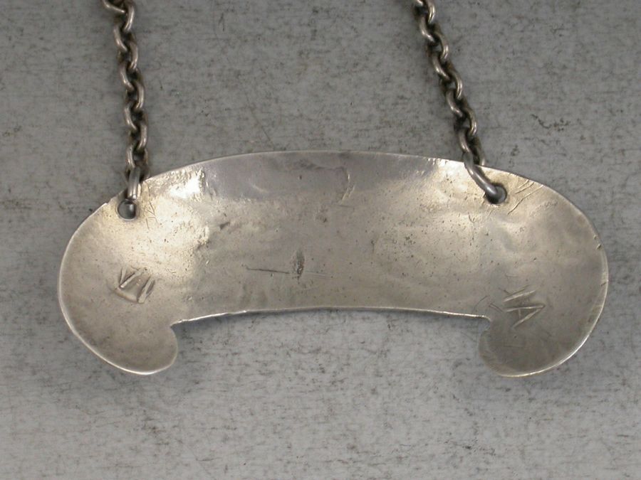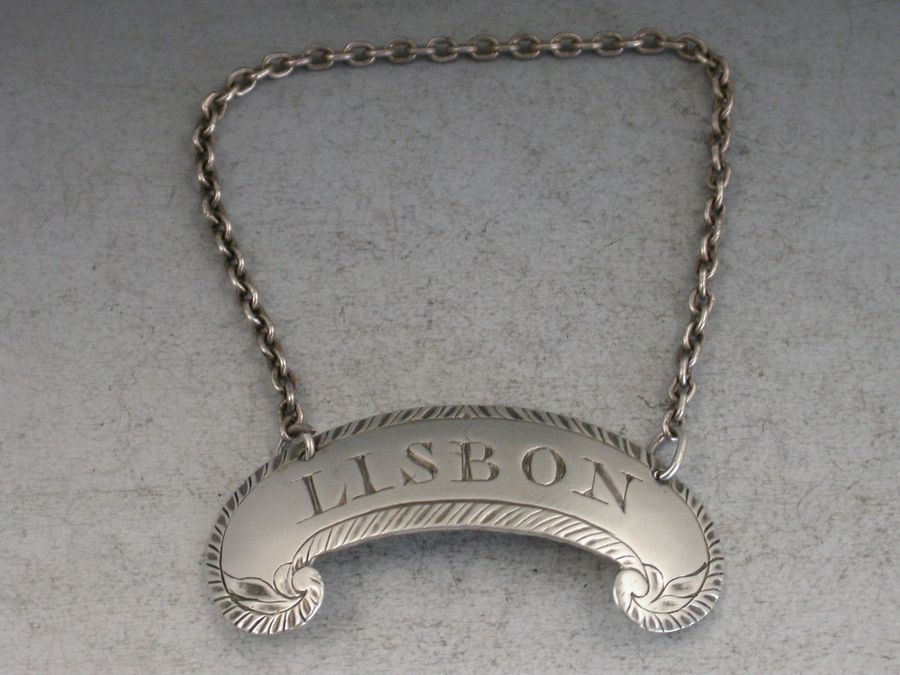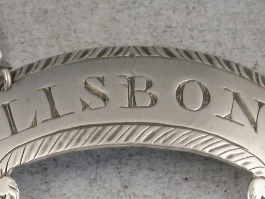 A rare antique silver Wine Label of down turned crescent form with feather edge border, incised for Lisbon.