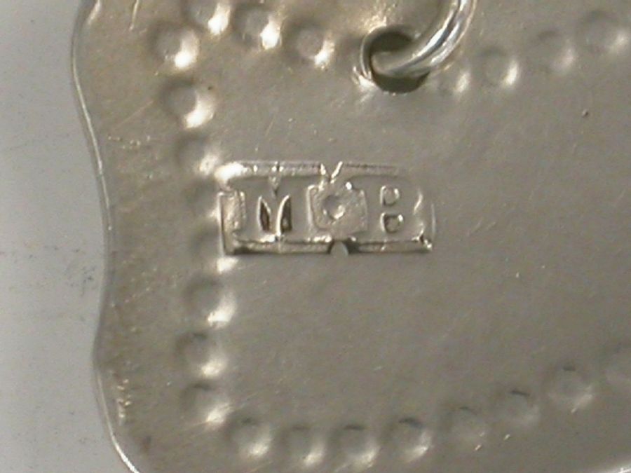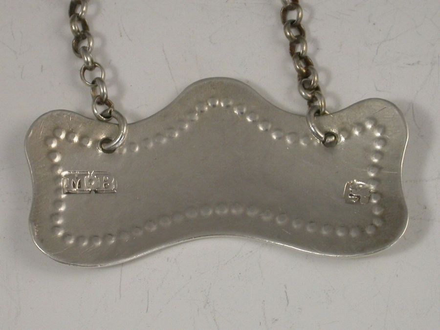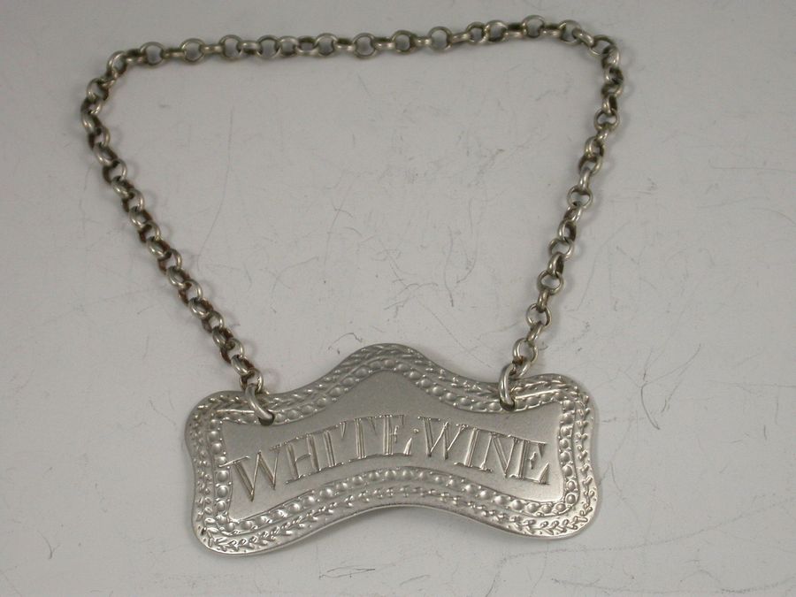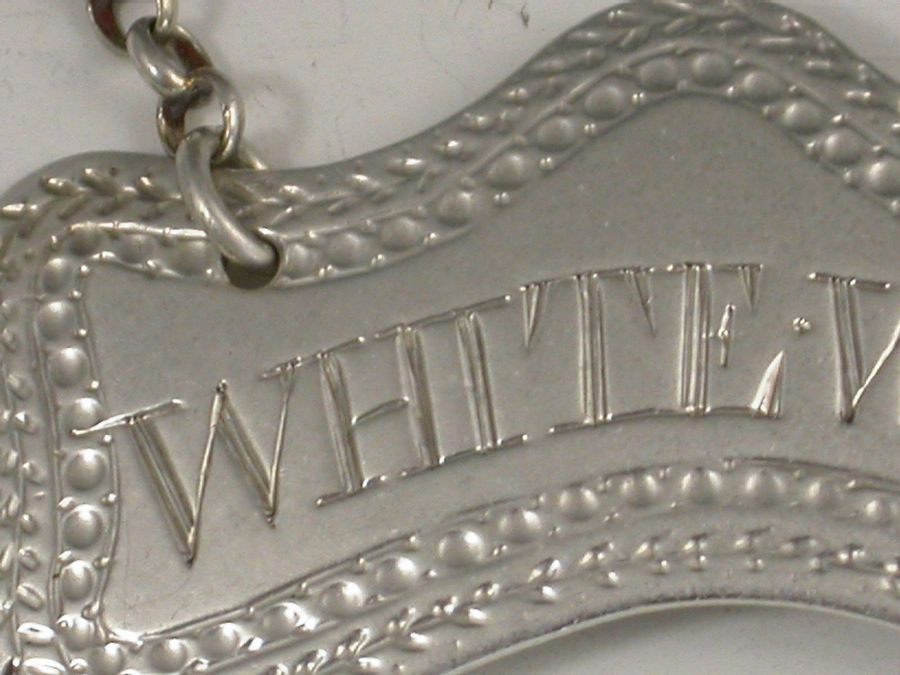 A good 18th century George III silver Wine Label of cushion shape with an unusual stamped and chased hob-nail type border, incised for White Wine.