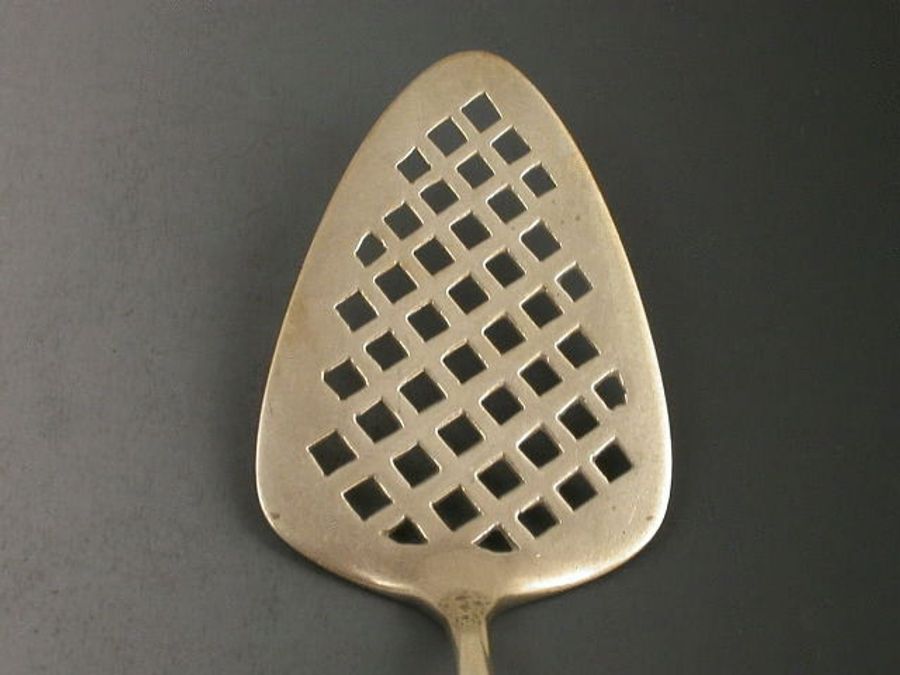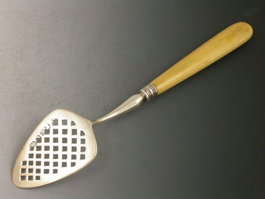 A good quality little 18th century silver pierced Butter Spade with plain bone handle, the spade shaped blade with lattice work piercing.