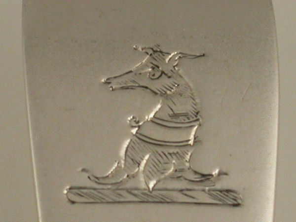 A good George III 18th century silver Soup Ladle of plain Old English pattern with fluted shell shaped bowl. The handle engraved with a crest of a collared greyhound.