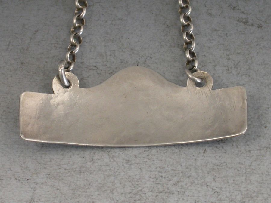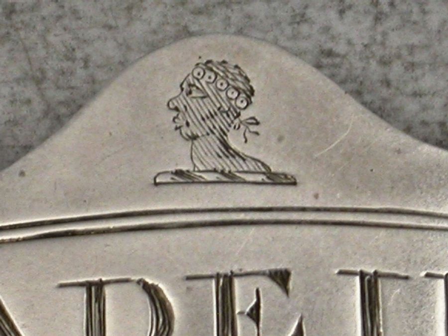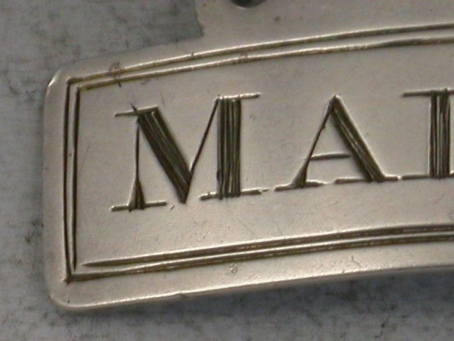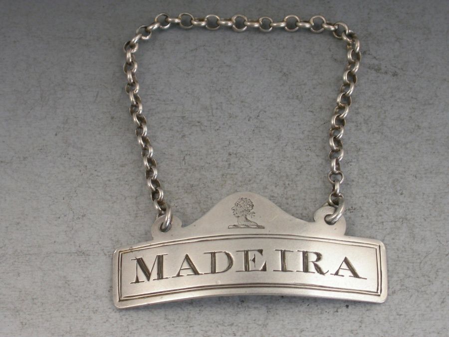 A rare unmarked 18th century silver Wine Label of narrow rectangular form with domed surmount, raised eyelets and double reeded border, incised for Madeira. The dome engraved with a crest depicting a Blackamoor’s head couped, (used by many families).