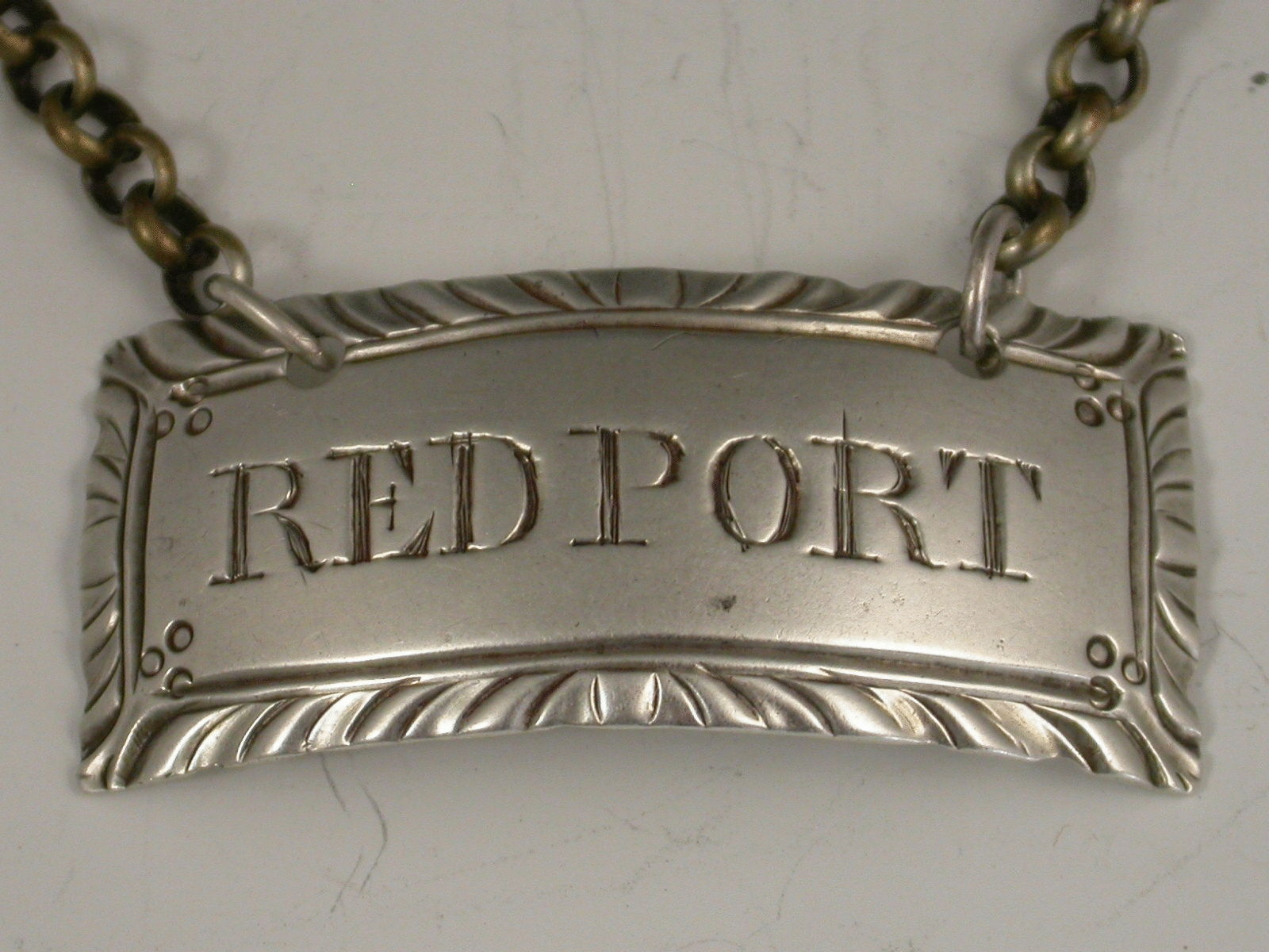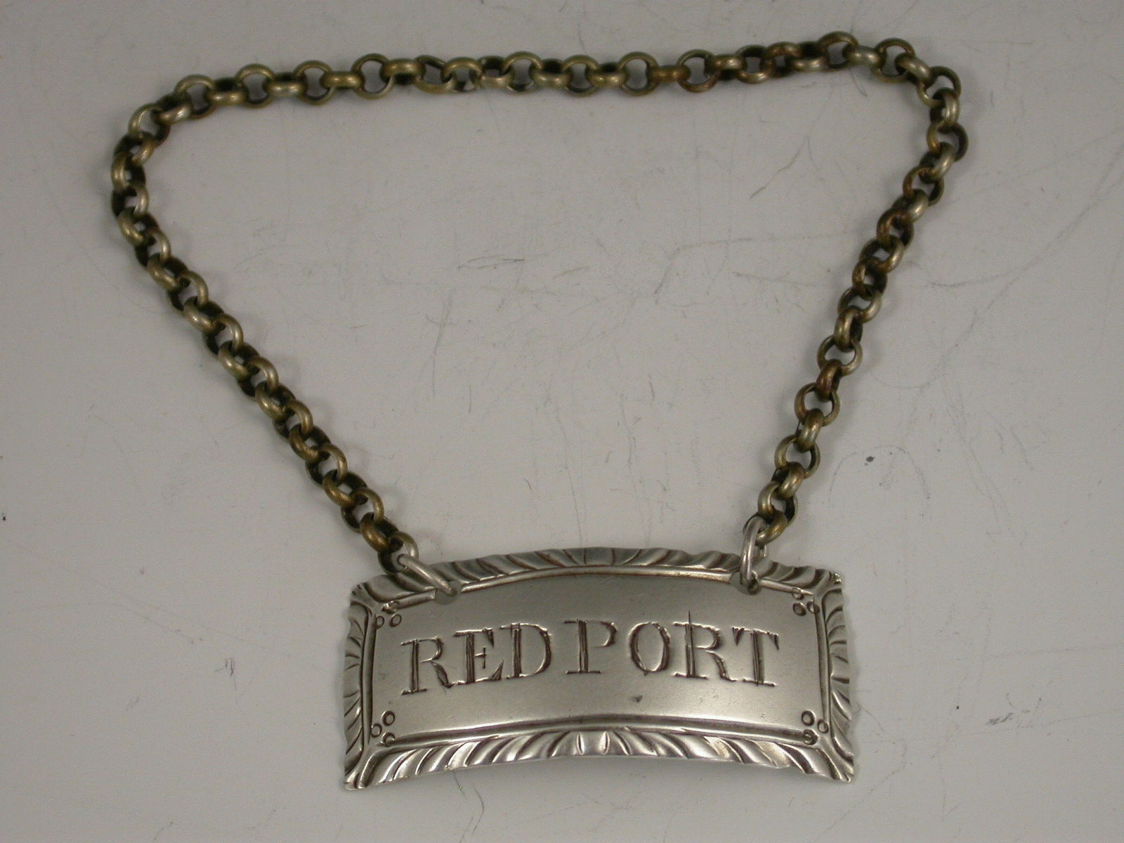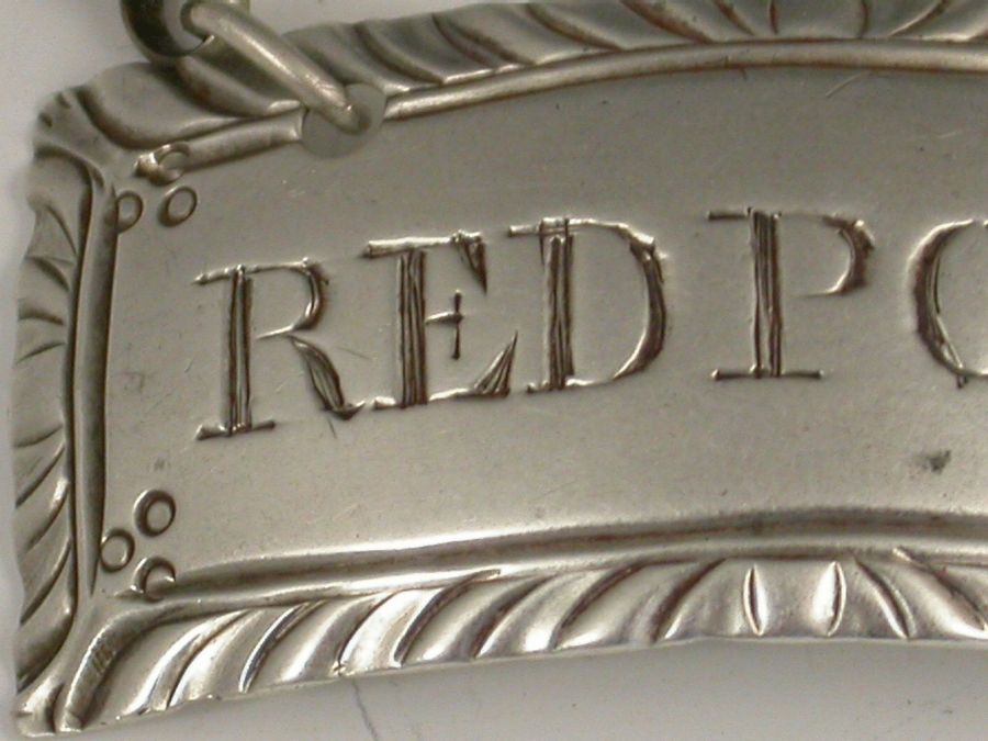 A good George III 18th century silver Wine Label of rectangular form with gadrooned border, incised for Red Port.