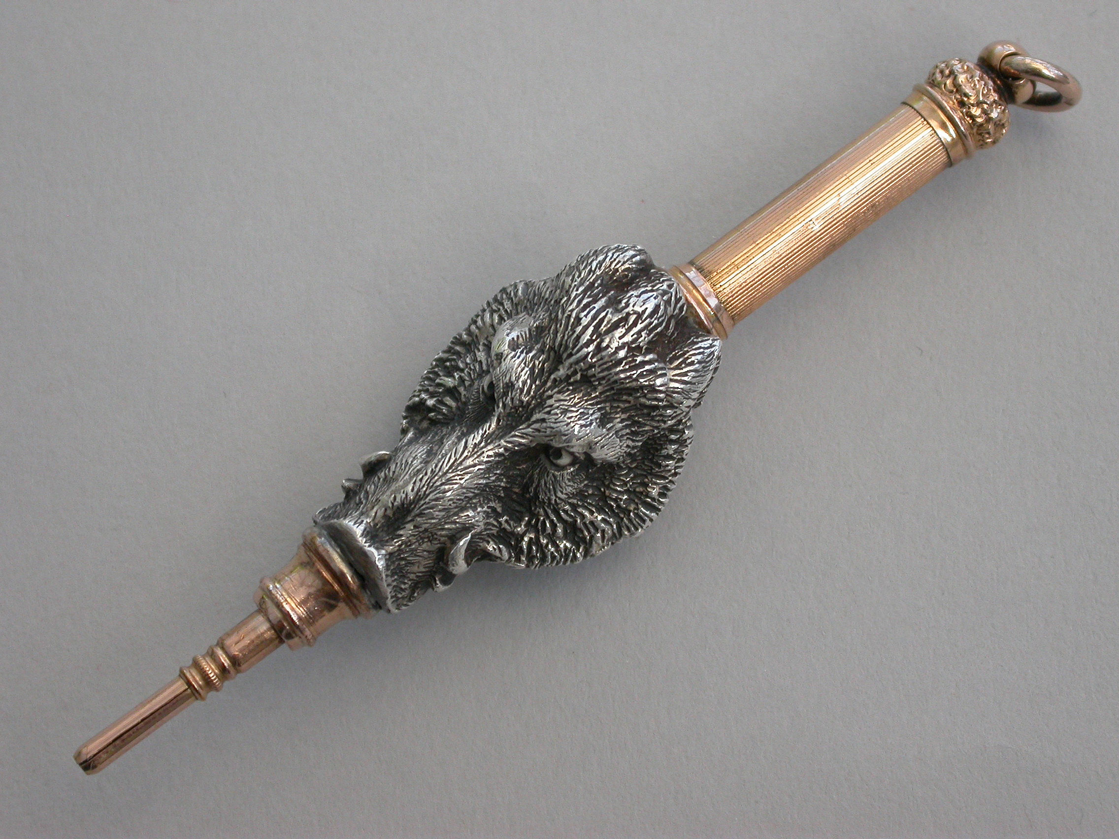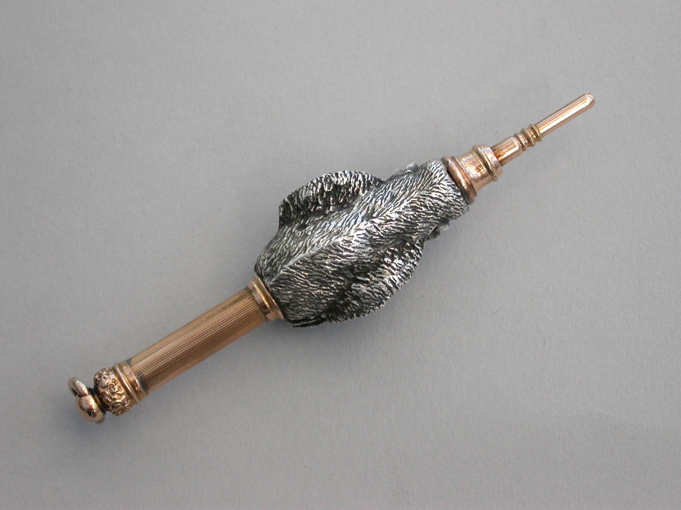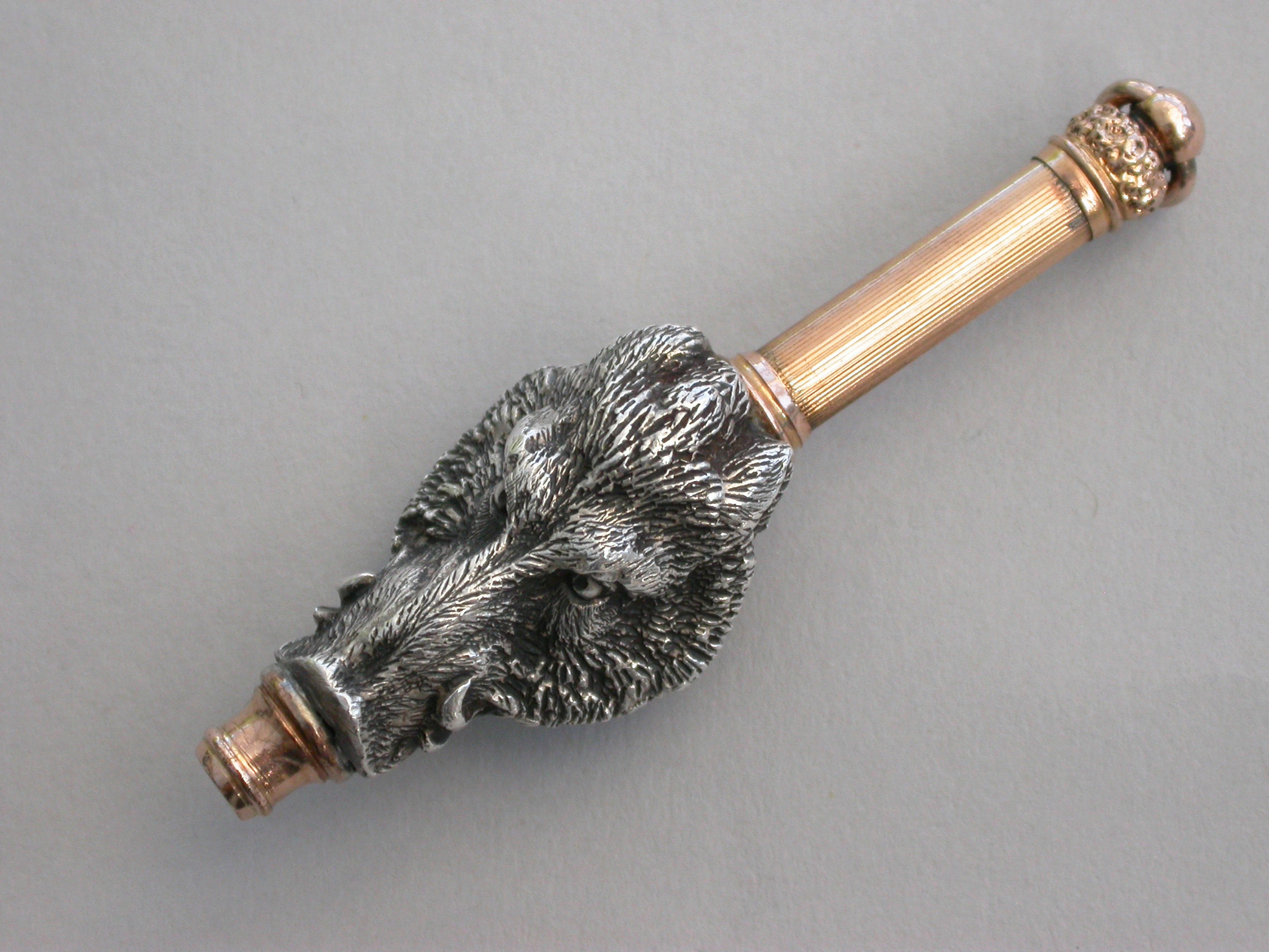 An extremely fine quality heavy cast silver and gold novelty telescopic Propelling Pencil made in the form of a wild Boar's head. The pencil with dual opening mechanisms, the handle pulling out and then twisting to extend the pencil itself.