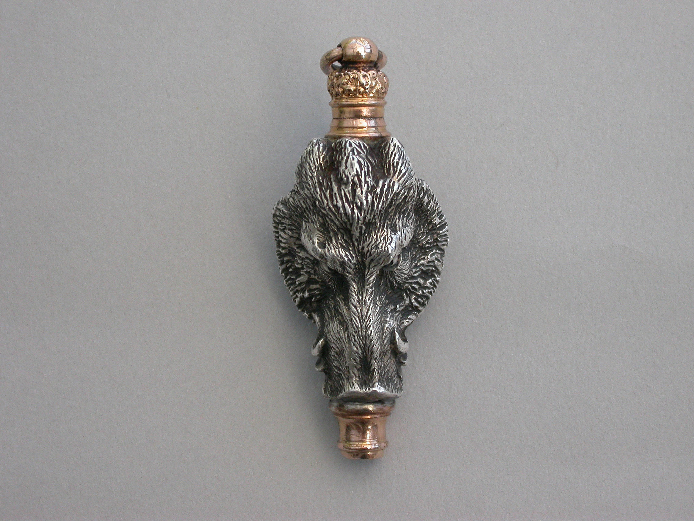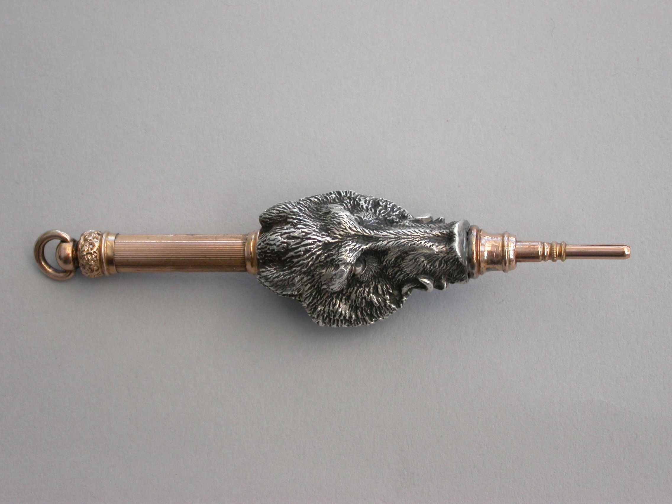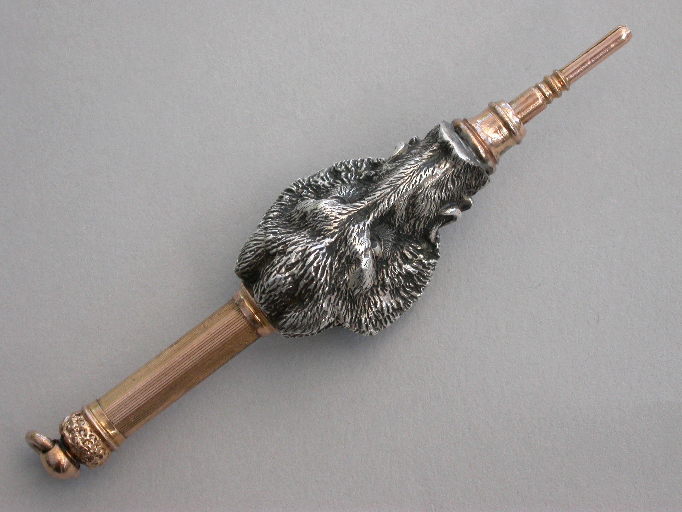 An extremely fine quality heavy cast silver and gold novelty telescopic Propelling Pencil made in the form of a wild Boar's head. The pencil with dual opening mechanisms, the handle pulling out and then twisting to extend the pencil itself.