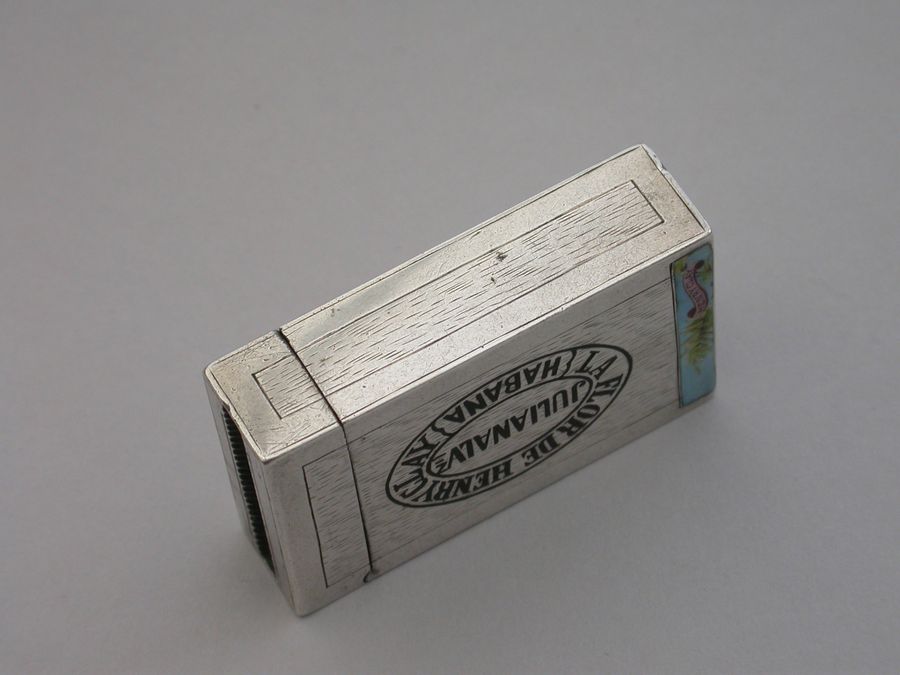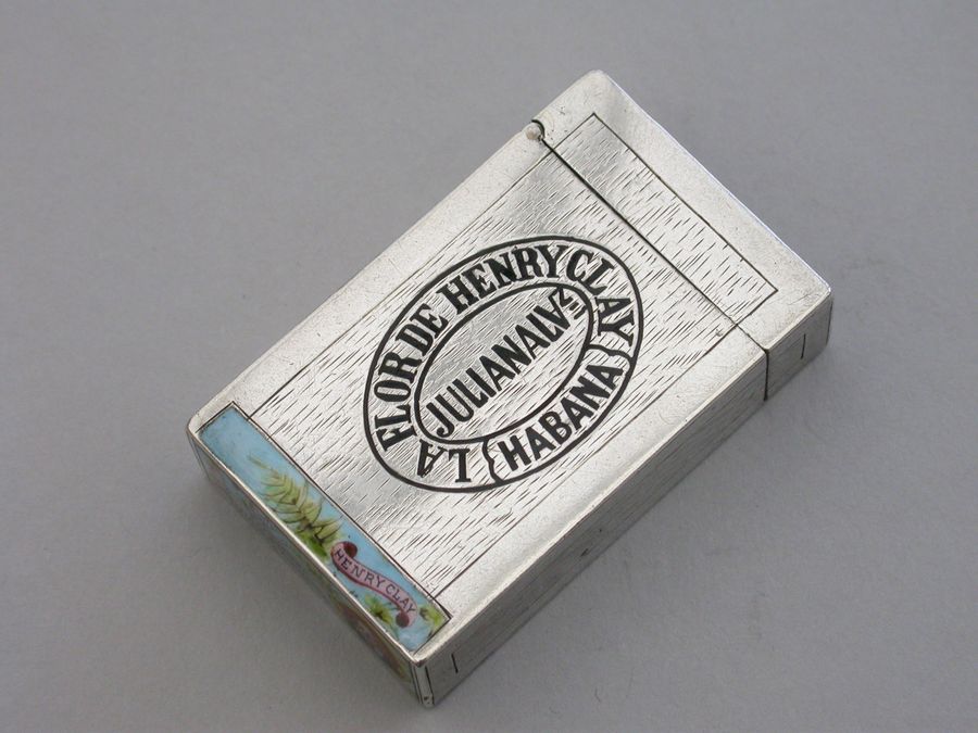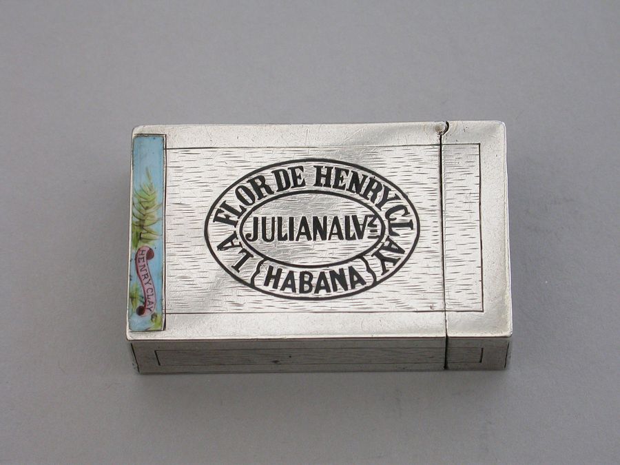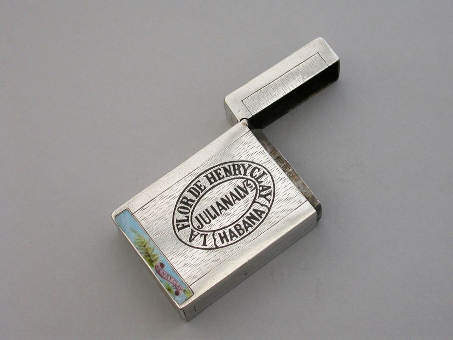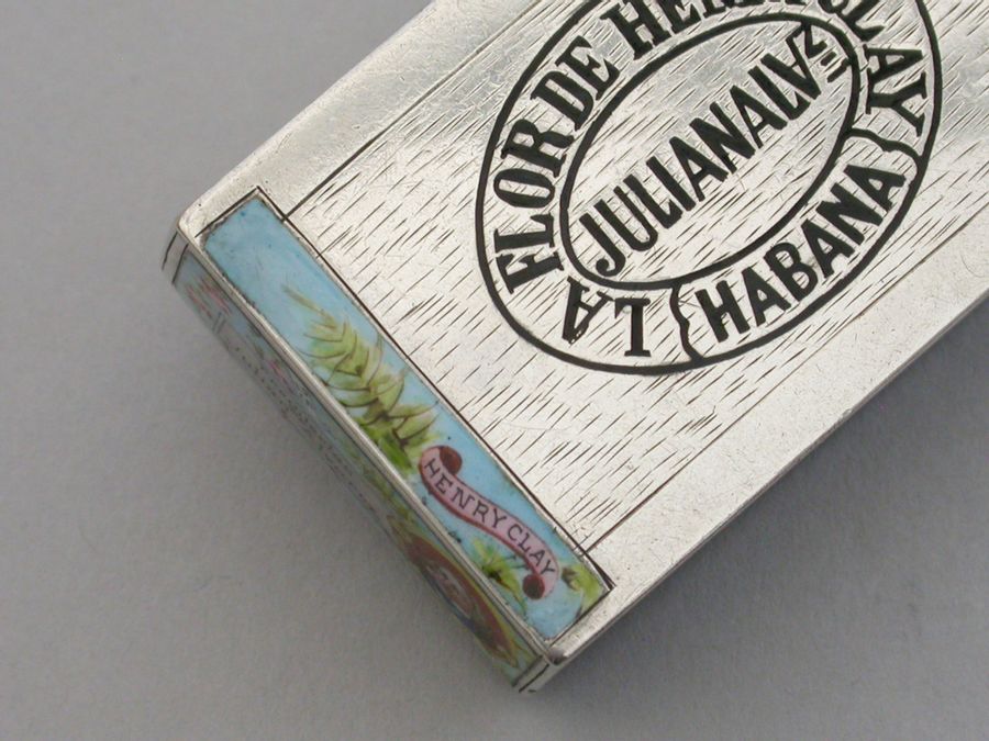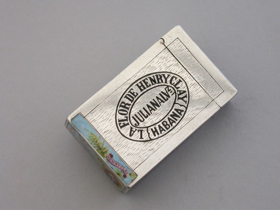 A rare late 19th century German silver and enamel Vesta Case made in the form of a wooden Cuban Cigar Box - La Flor De Henry Clay. The sprung hinged lid set with a striker and one end decorated with a brightly coloured enamel label.