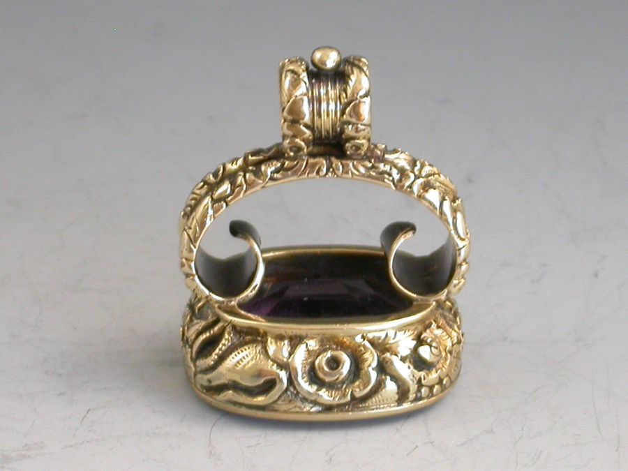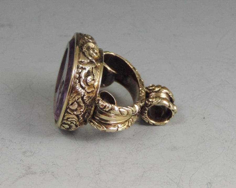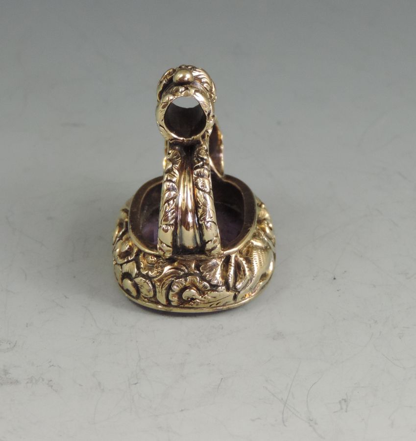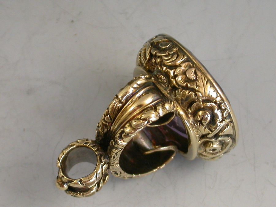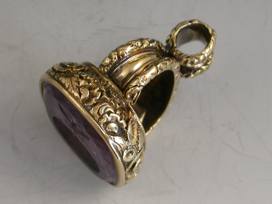 A good mid 19th century gold Fob Seal of stirrup form chased with flower heads and sea shells, set with an Amethyst matrix engraved with a crest of a double-headed eagle above a cartouche with the initials 'IH'.