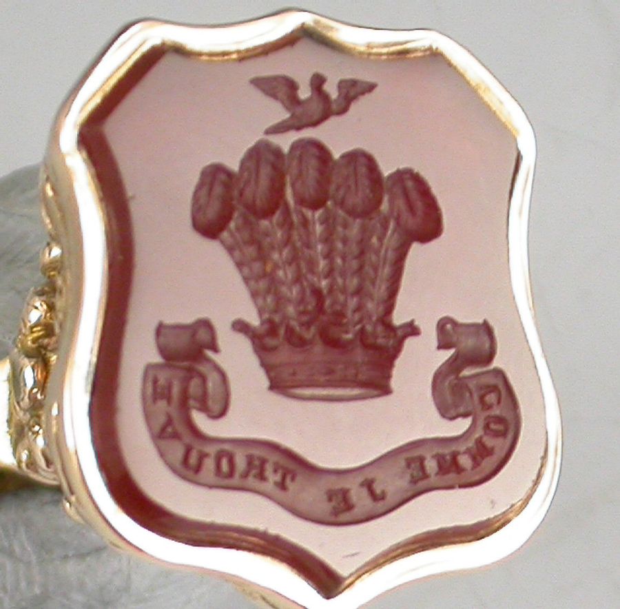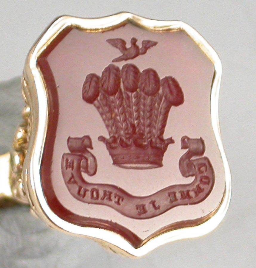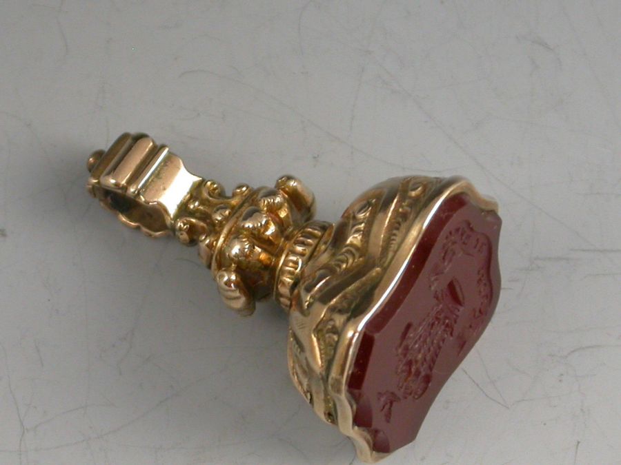 A mid Victorian gold cased Fob Seal, the shield shaped Carnelian matrix engraved with the motto 'Comme Je Trouve' (as I find) and a crest of a falcon above a plume of five Ostrich feathers issuing out of a ducal coronet, probably for Butler of Ireland.