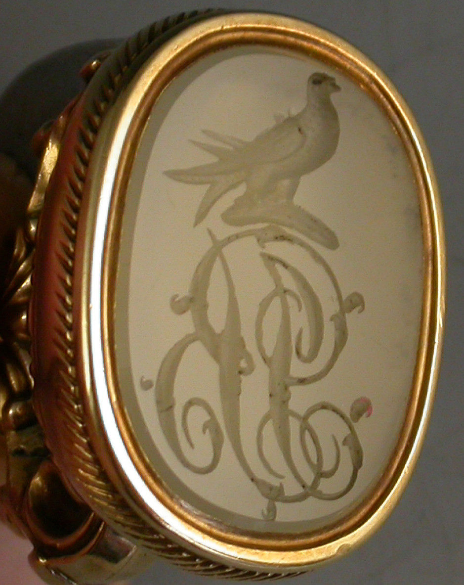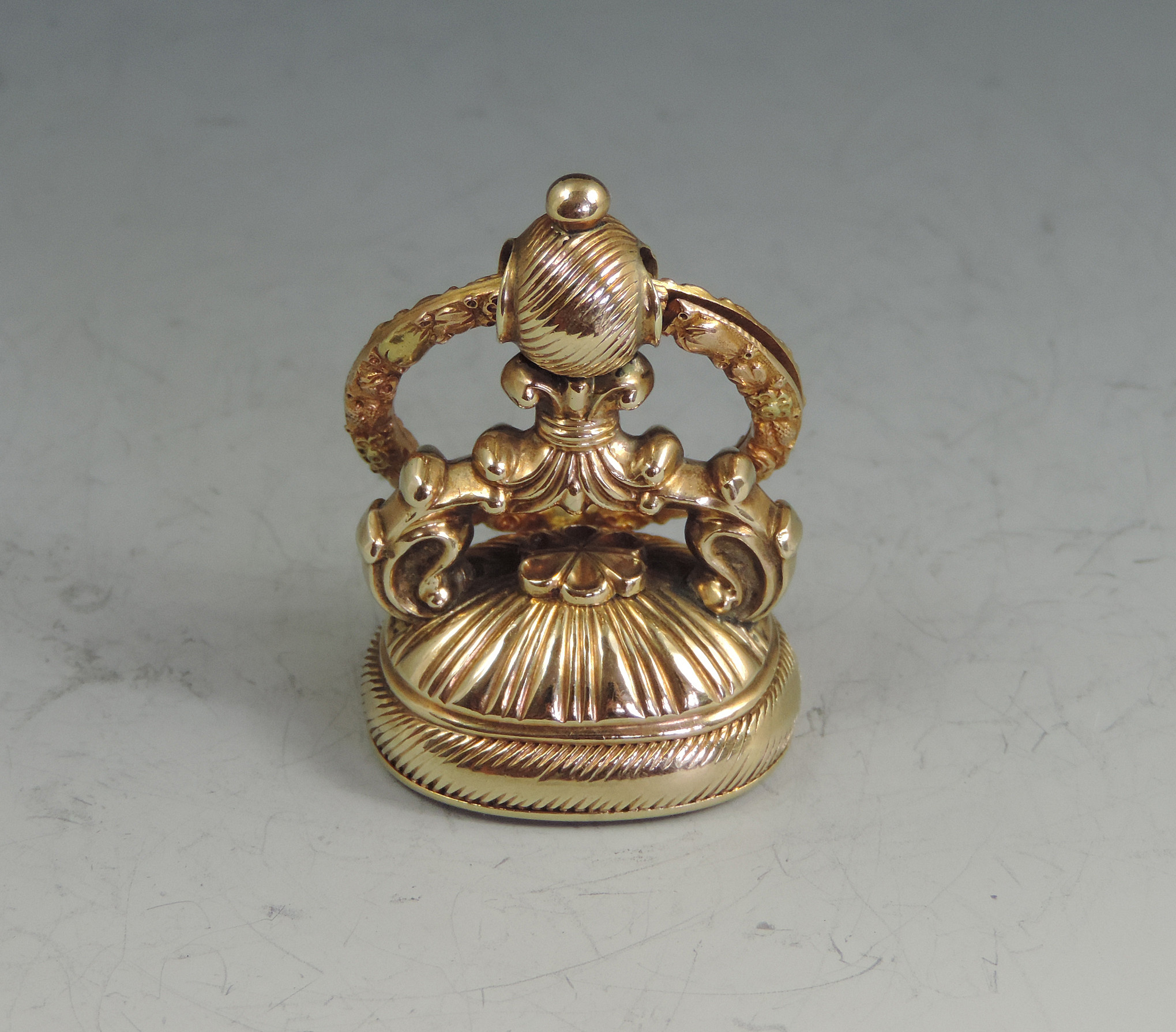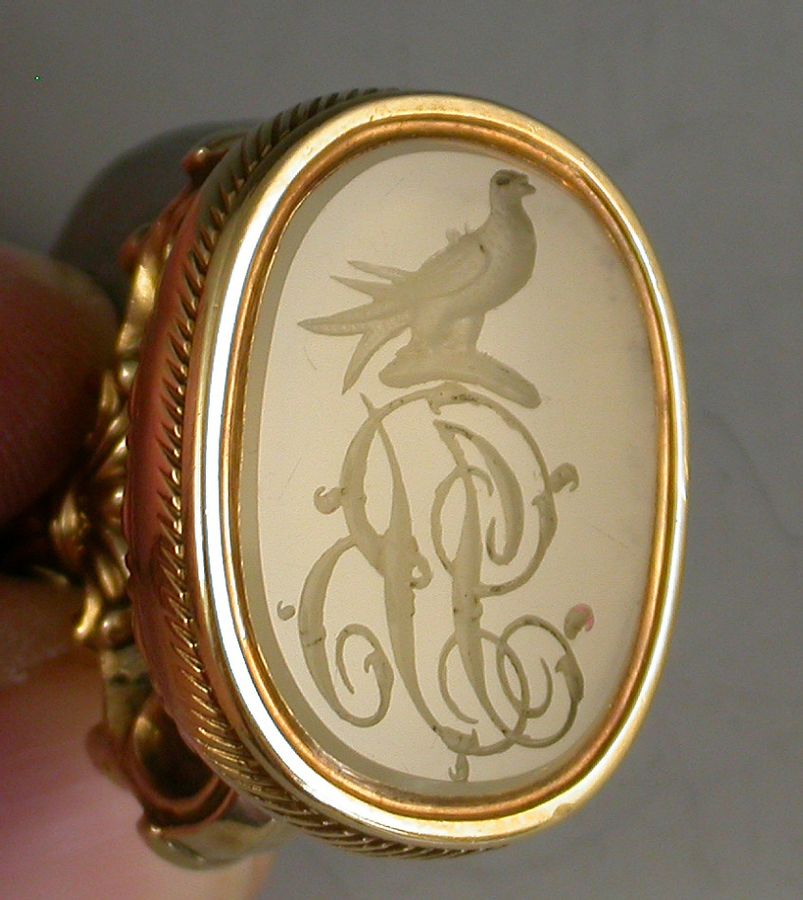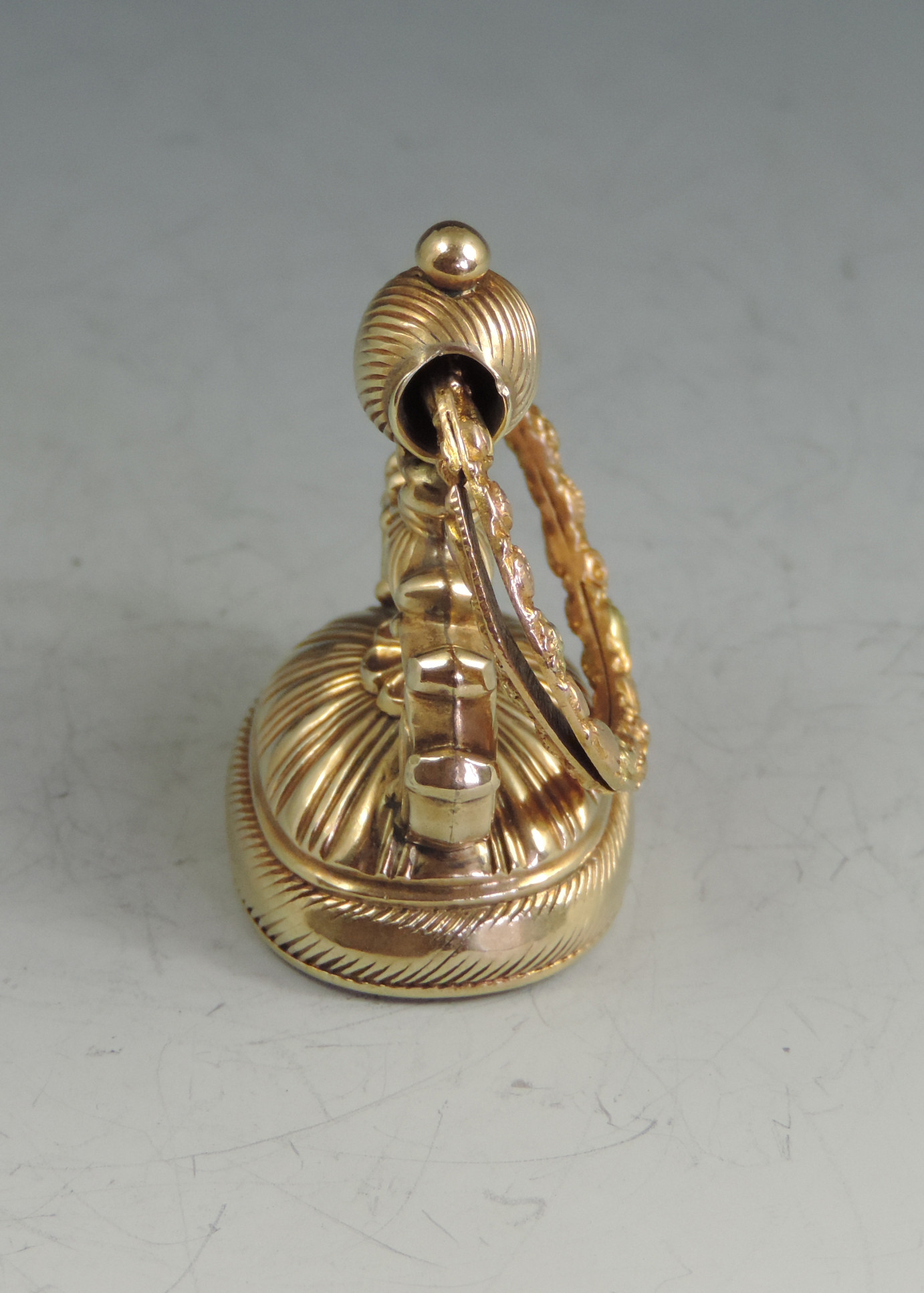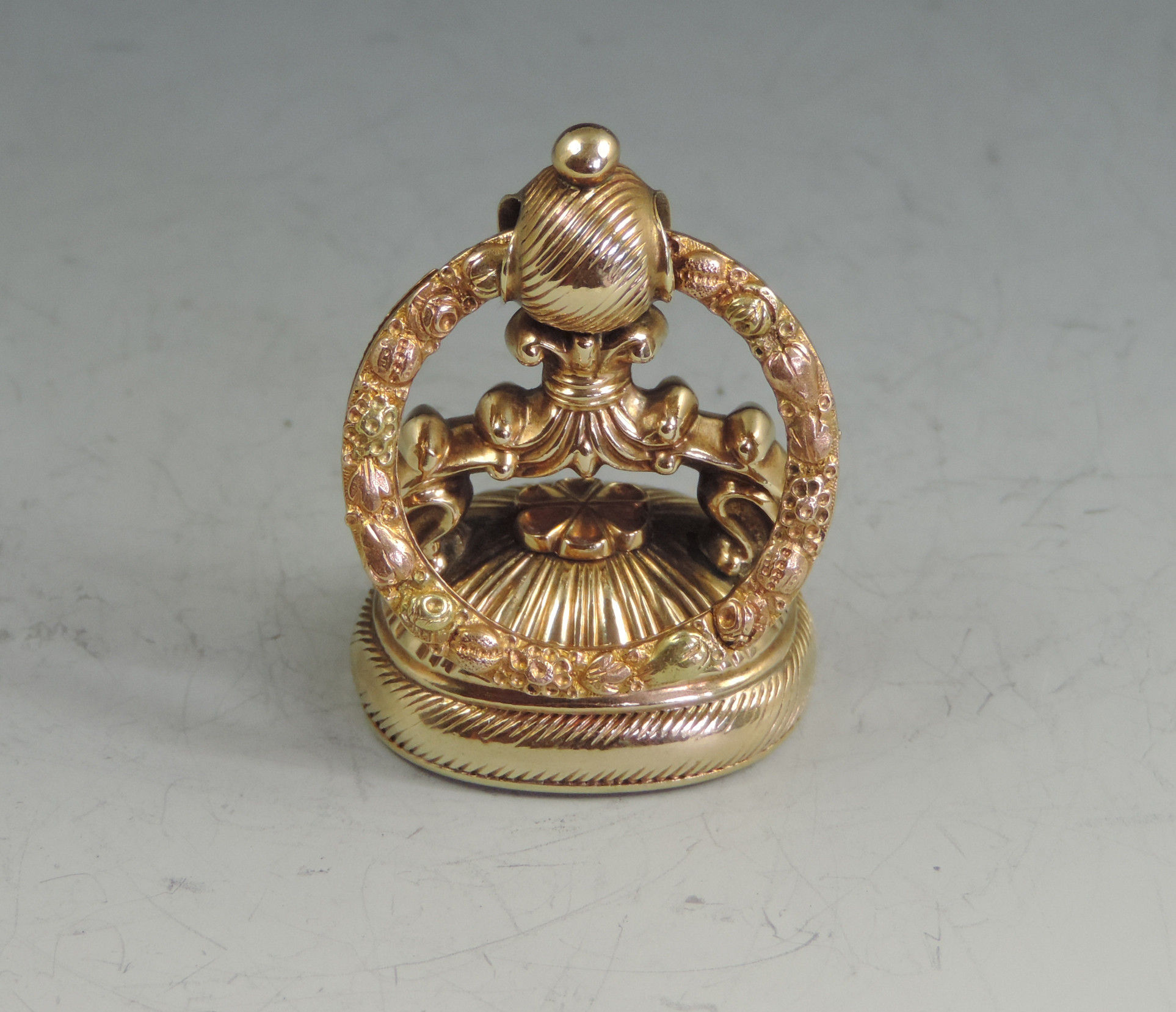 A good mid 19th century gold Fob Seal of stirrup form, the oval chalcedony matrix engraved with a crest of a Martlet and the initials 'JB', with attached two-colour gold split ring chased with flower heads and fruit.