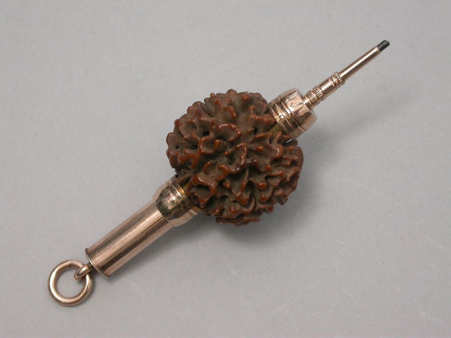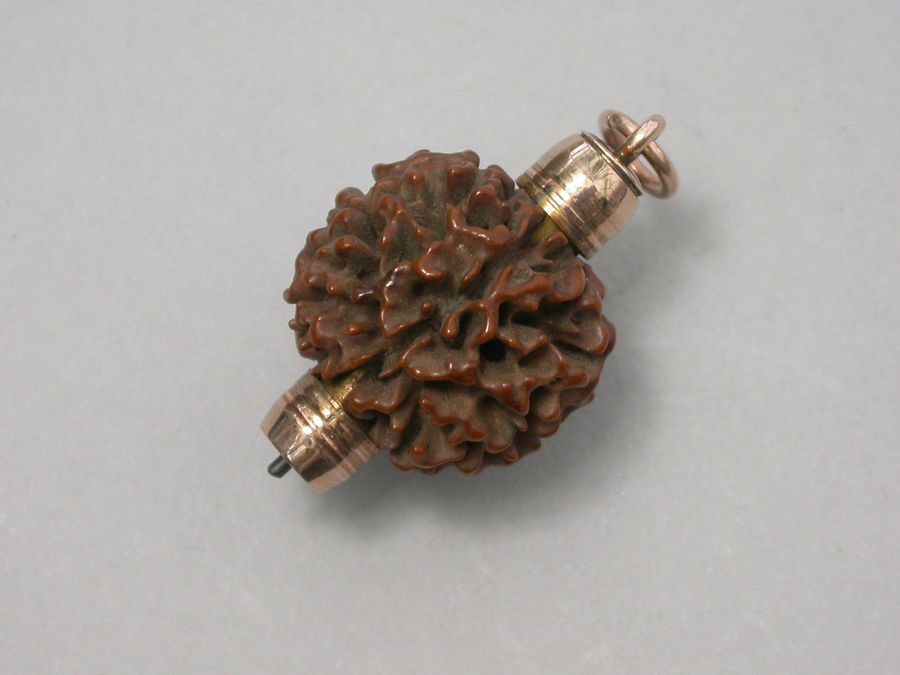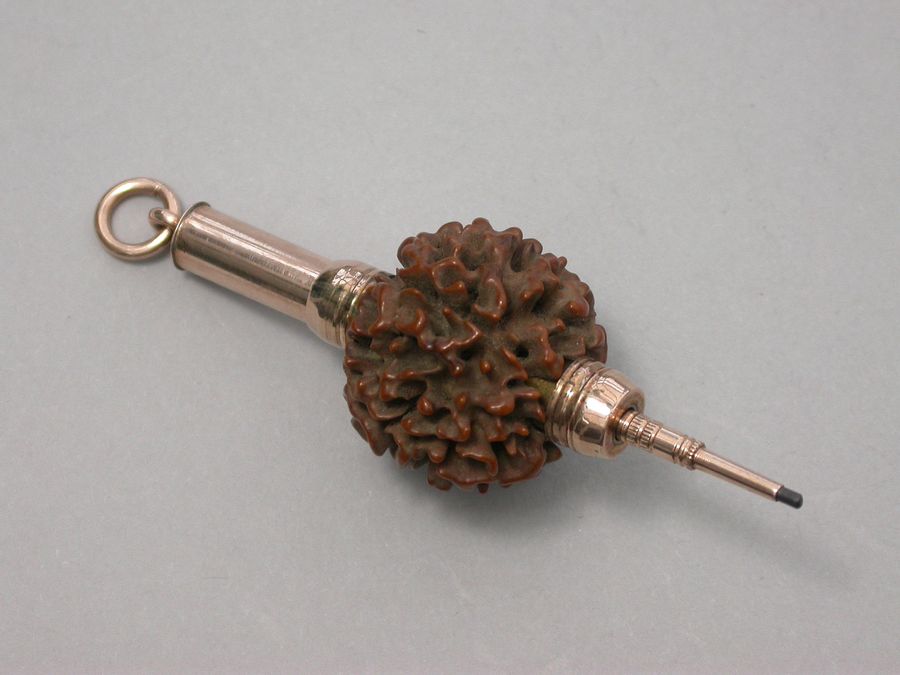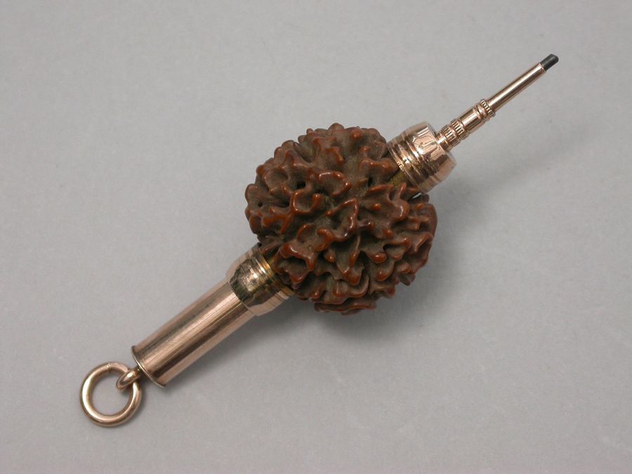 A late 19th century gold mounted novelty telescopic Propelling Pencil formed from a Rudraksha Seed with attached suspension ring.
