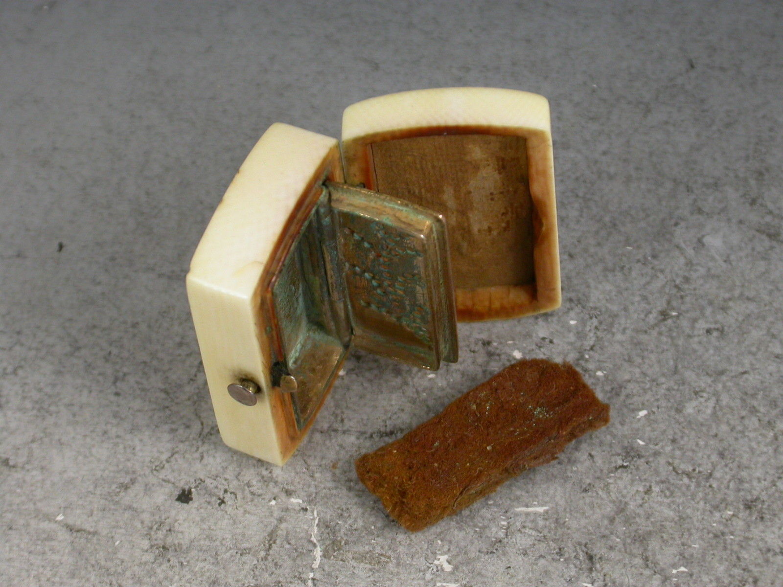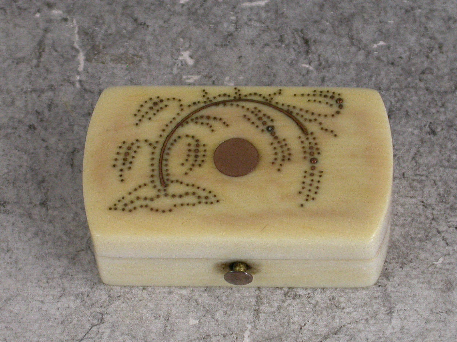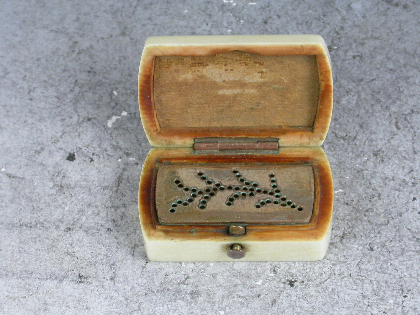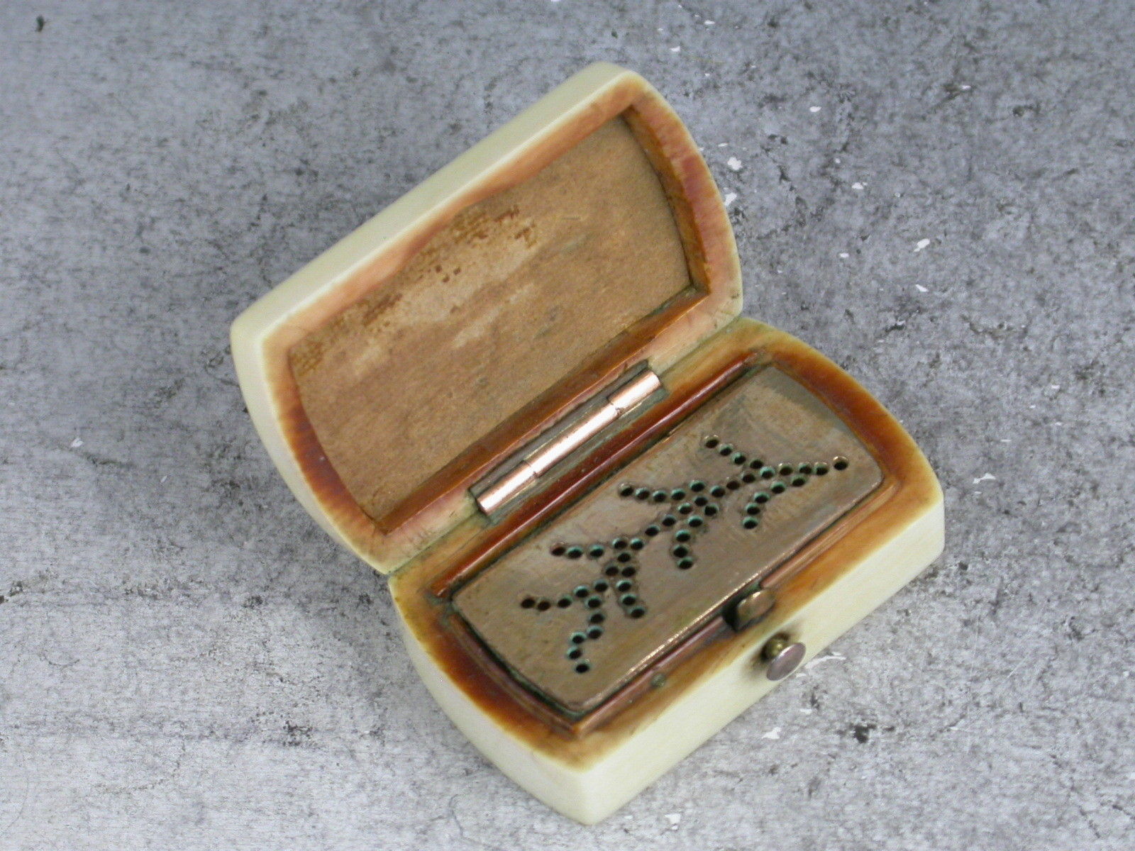 A rare mid 19th century ivory Vinaigrette of rounded rectangular form, the lid inset with gold pique work depicting a fern and a vacant circular cartouche, the interior with hinged grille pierced with a fern pattern and complete with original sponge.