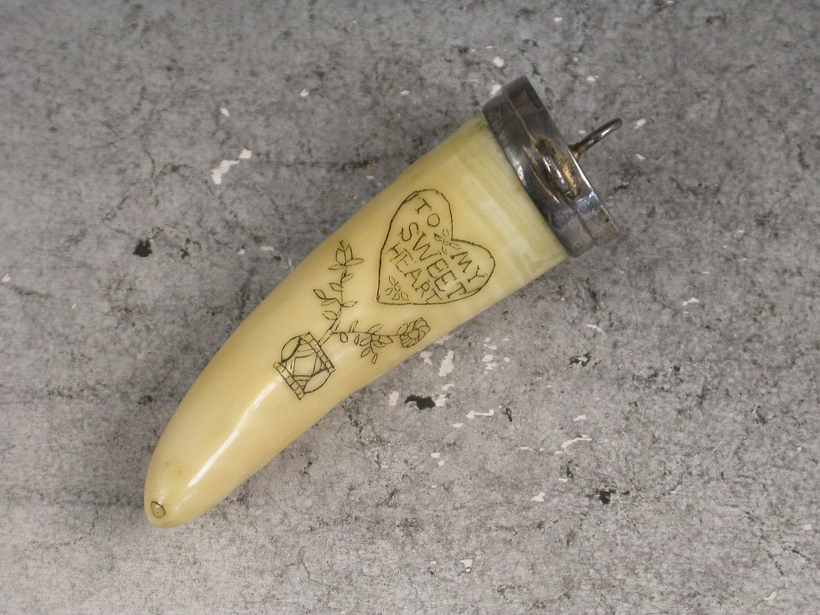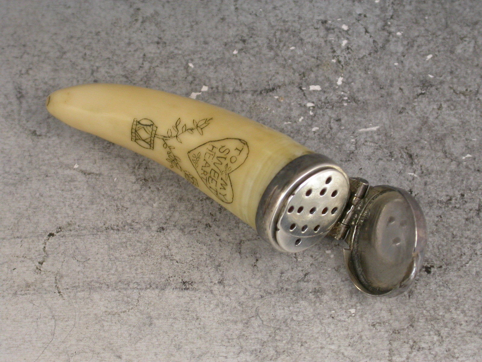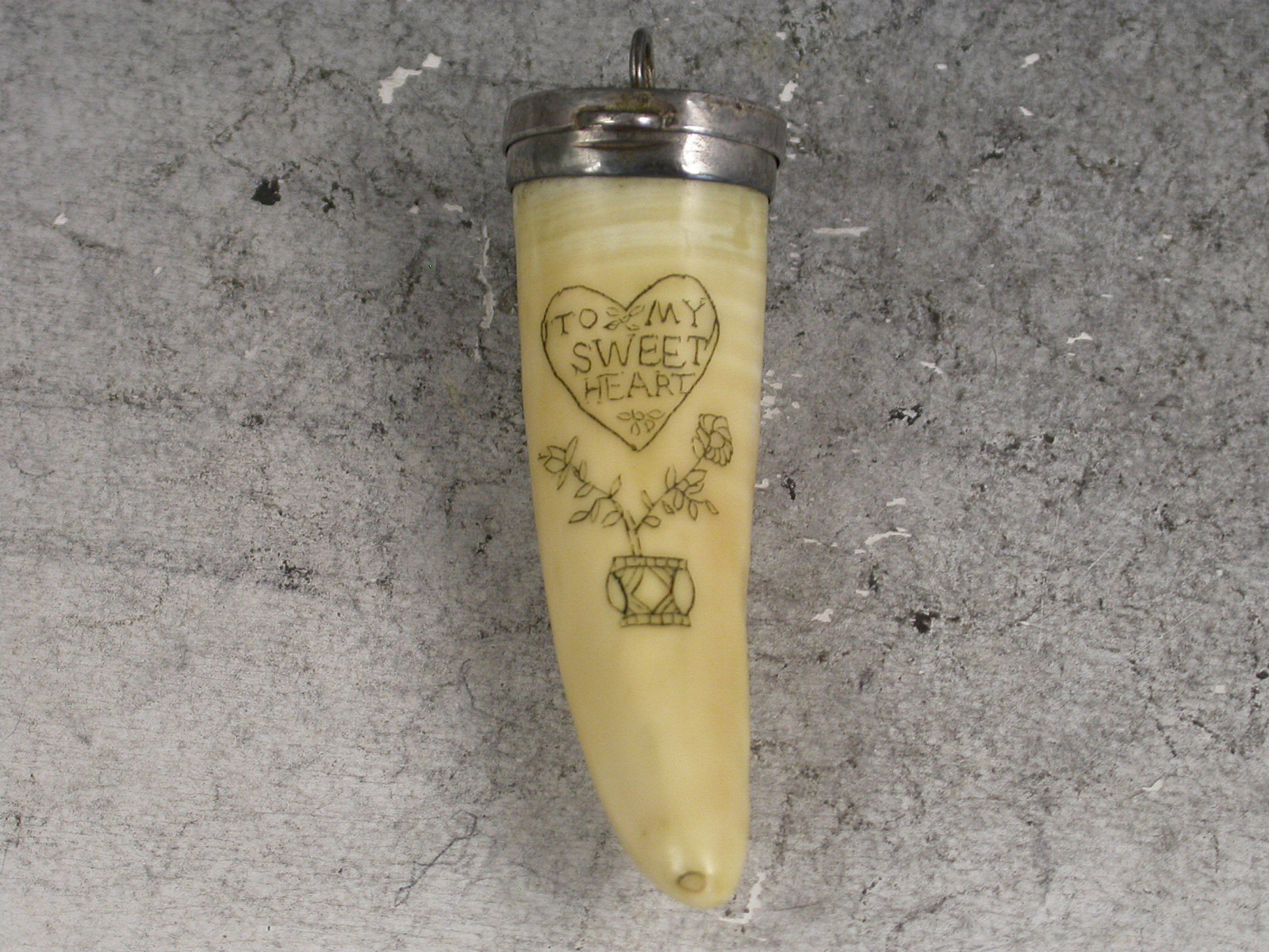 A rare mid 19th century Scrimshaw work silver mounted sharks tooth Vinaigrette, the tooth engraved with a galleon in full sail and an anchor, a vases of flowers and the legend ""To My Sweetheart"" within a heart. Hinged silver lid with attached suspension ring and pierced pull out grille to the interior.