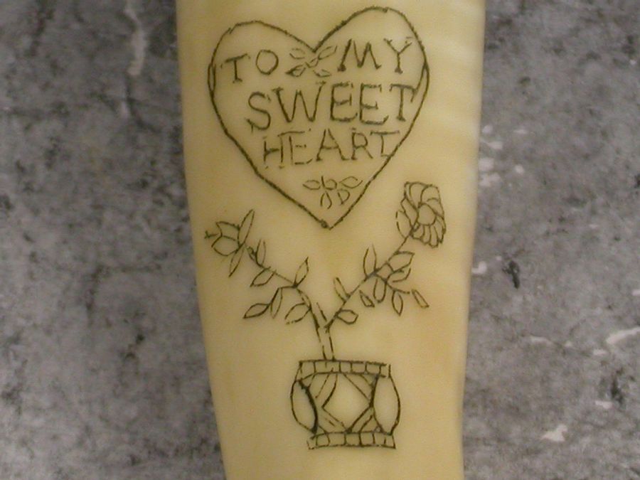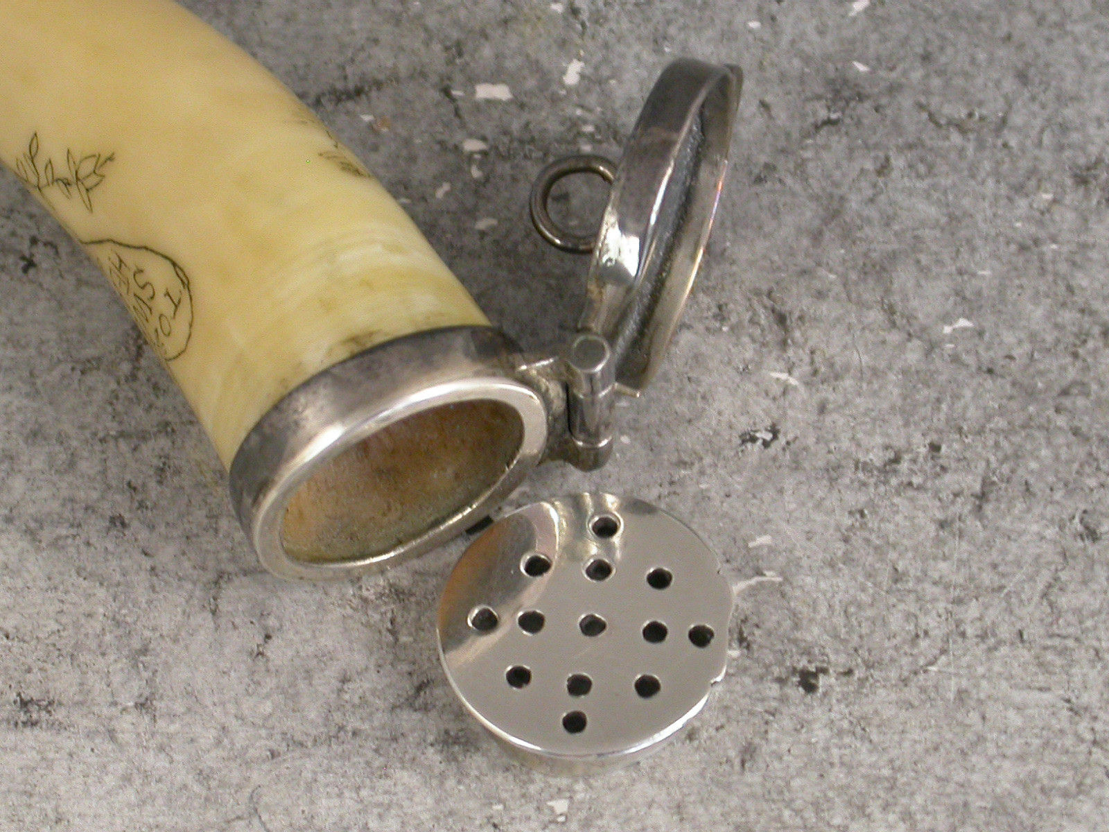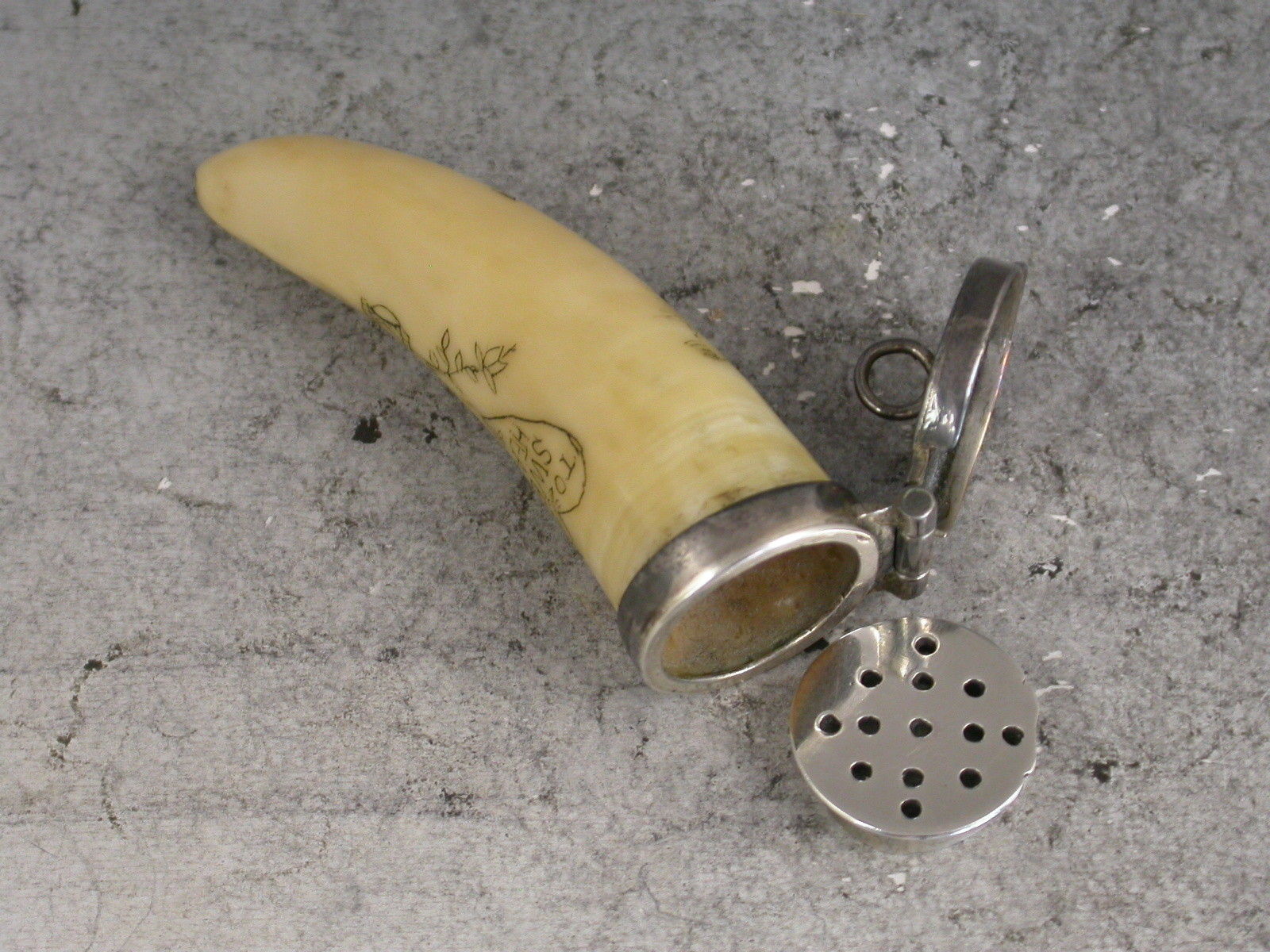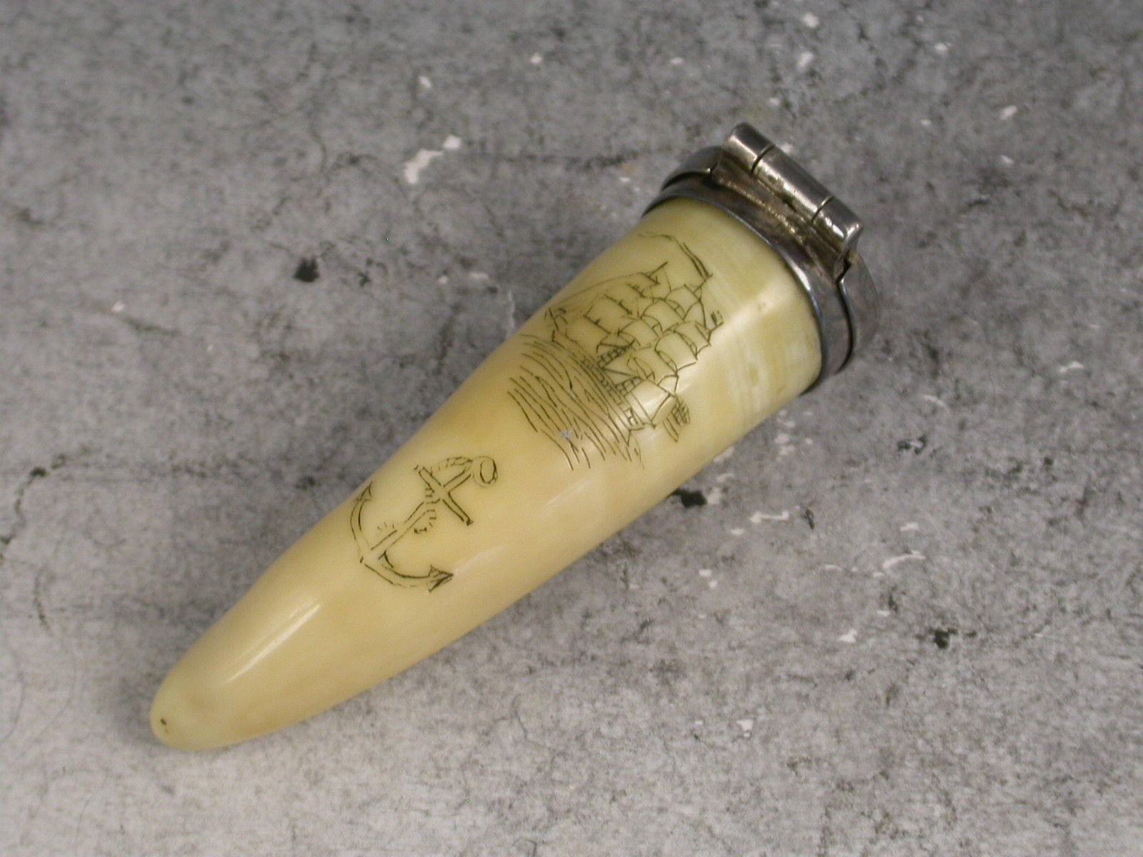 A rare mid 19th century Scrimshaw work silver mounted sharks tooth Vinaigrette, the tooth engraved with a galleon in full sail and an anchor, a vases of flowers and the legend ""To My Sweetheart"" within a heart. Hinged silver lid with attached suspension ring and pierced pull out grille to the interior.