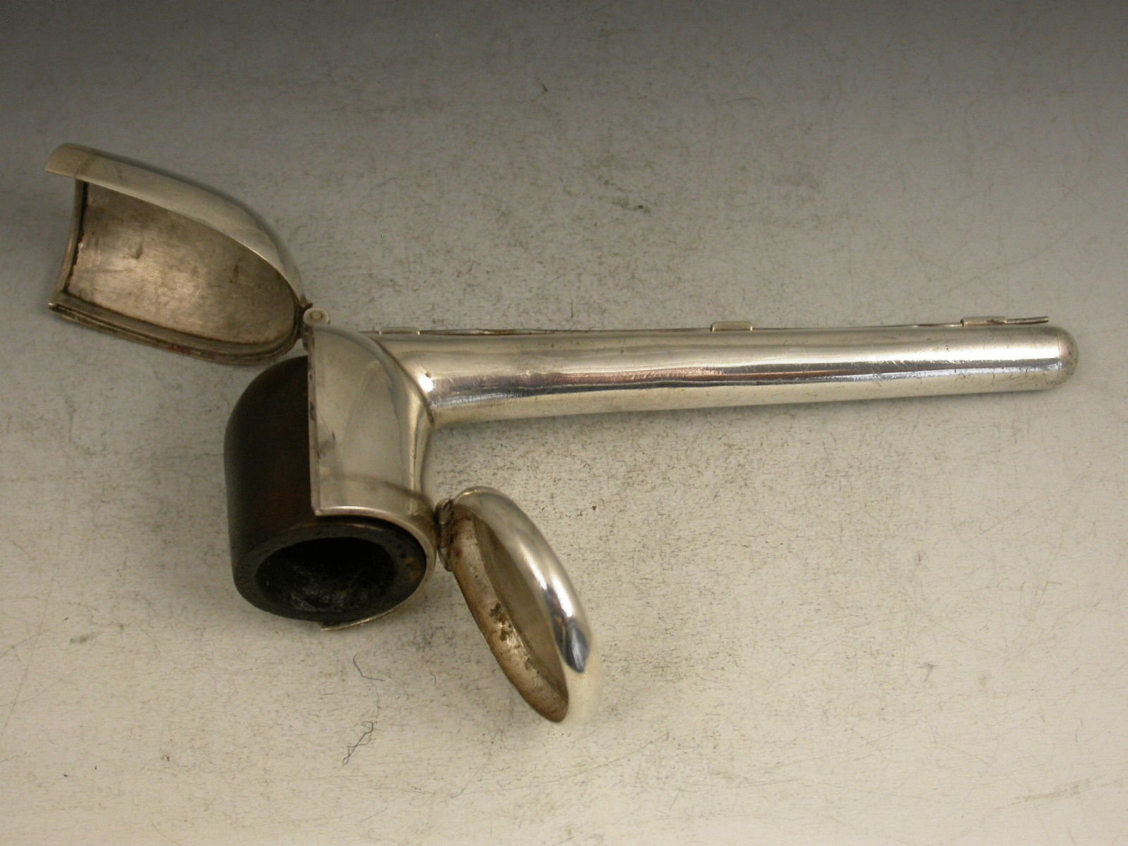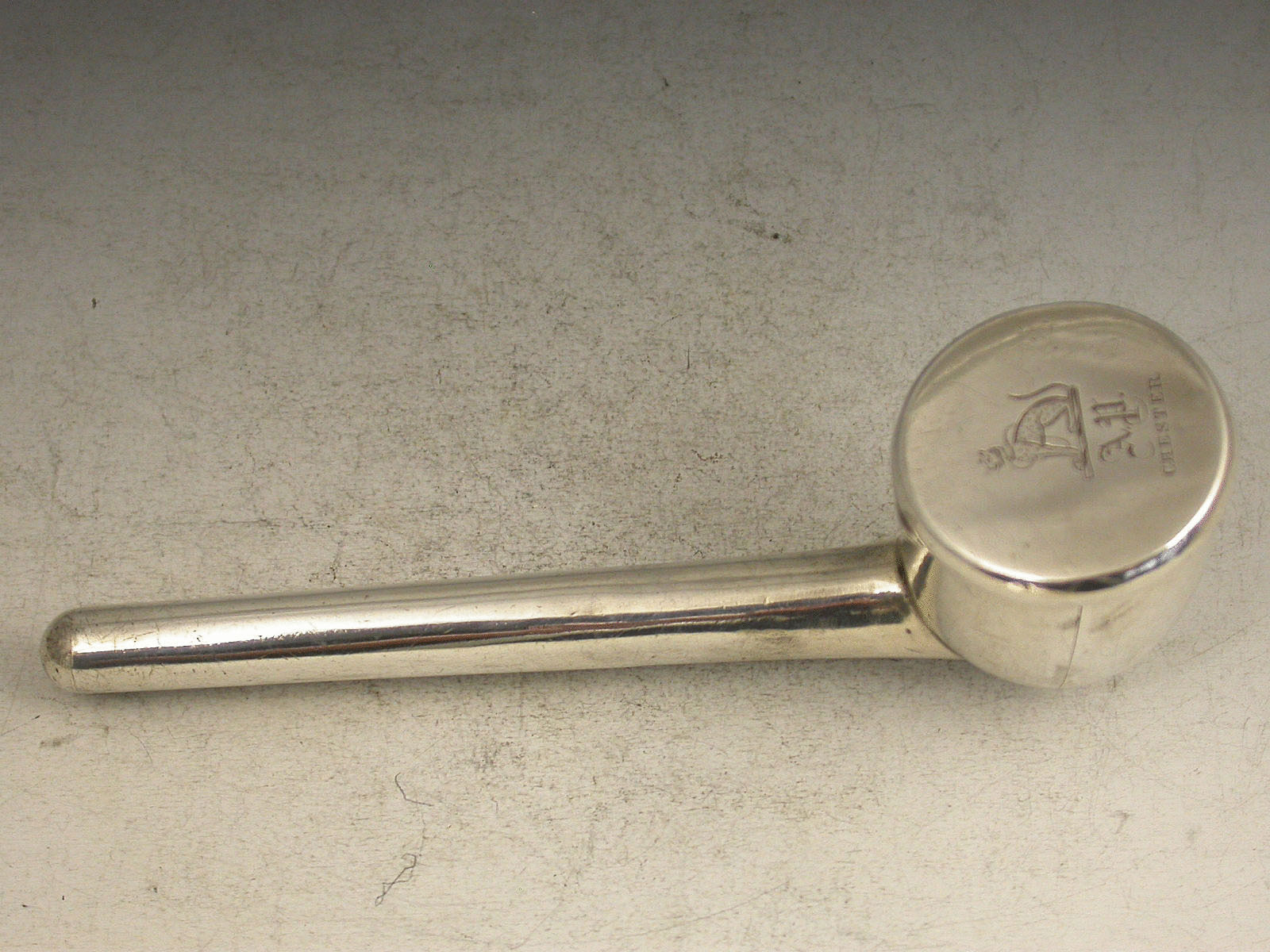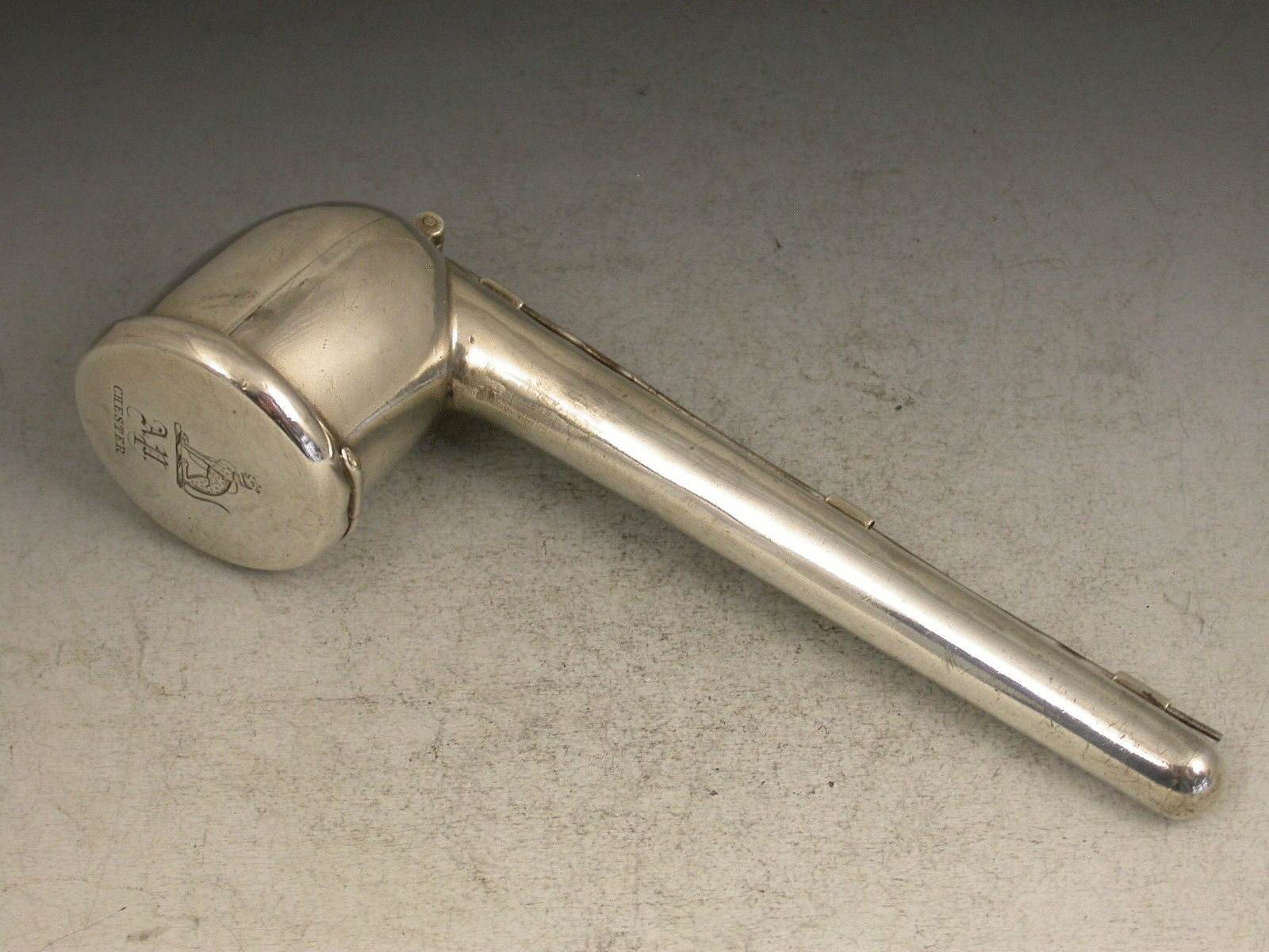 An unusual 19th century unmarked silver Pipe Case with hinged cover and bowl, a steel cleaning rod attached to the underside, the cover engraved with a crest, the initials 'AP' and 'CHESTER'. The crest of a Leopard sejant, collard and lined, possibly for Phillips or Potts. Complete with contemporary wooden pipe.