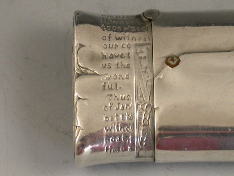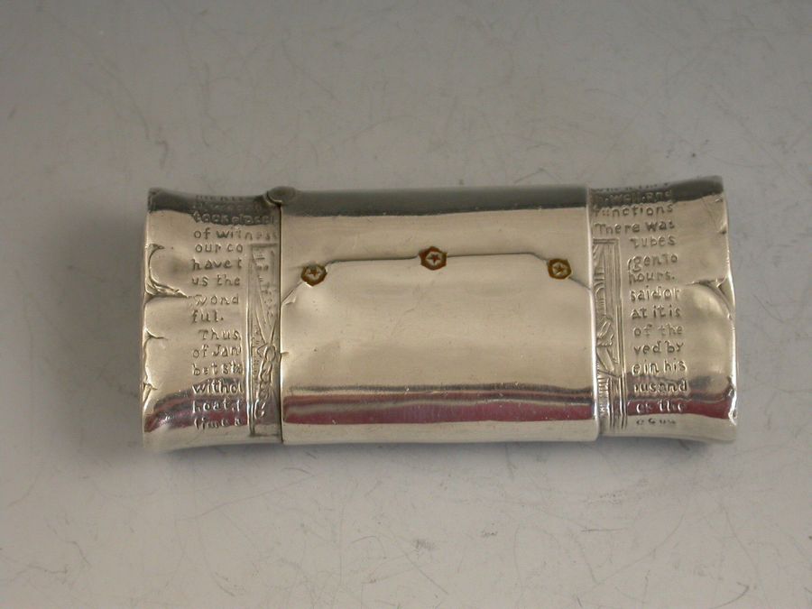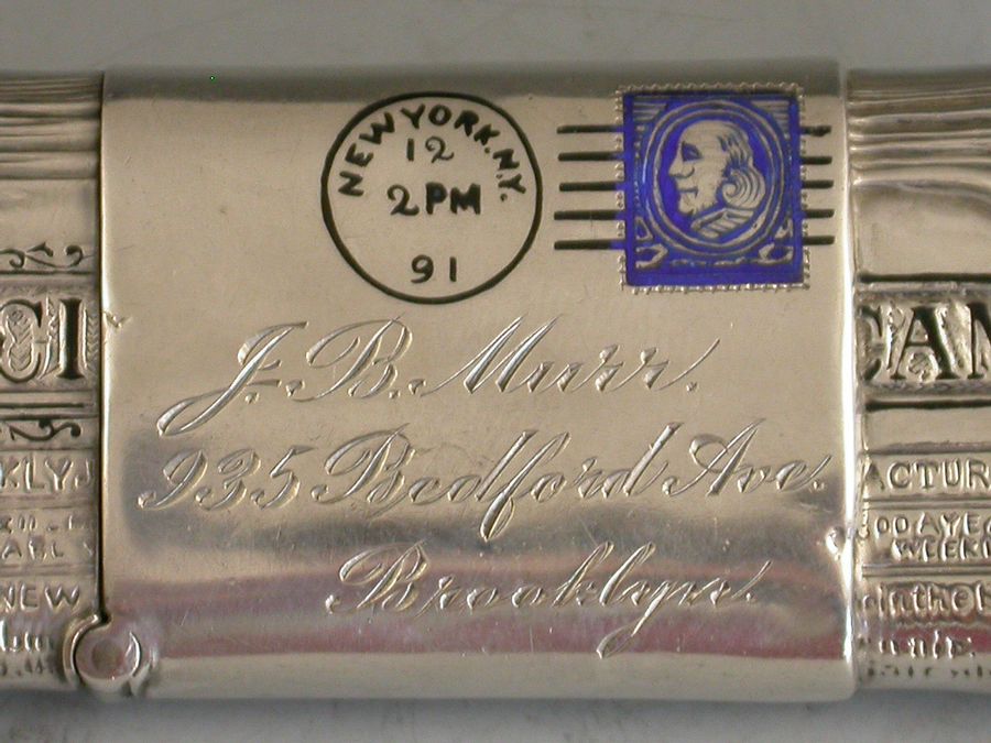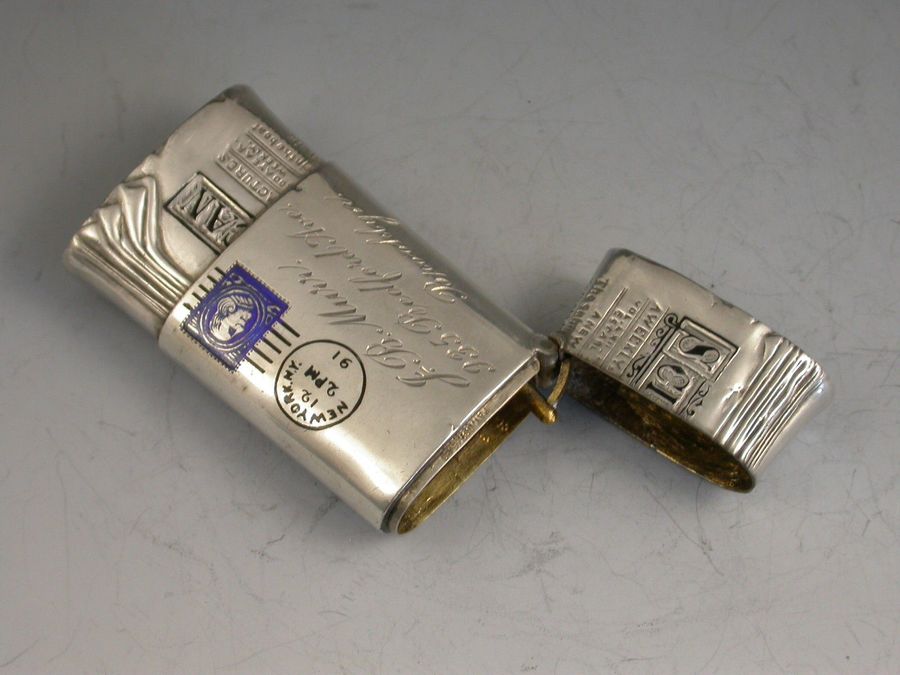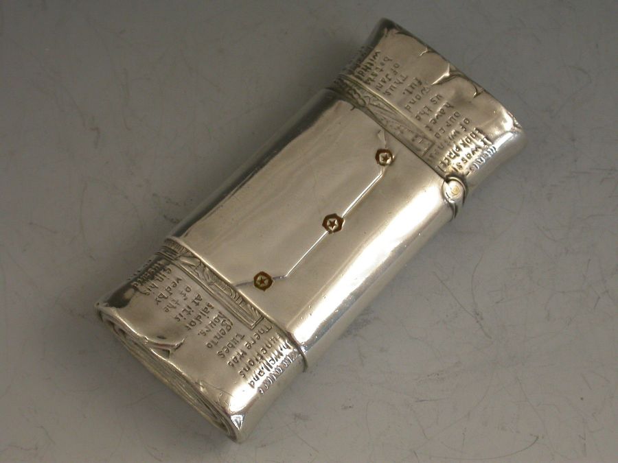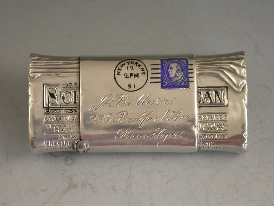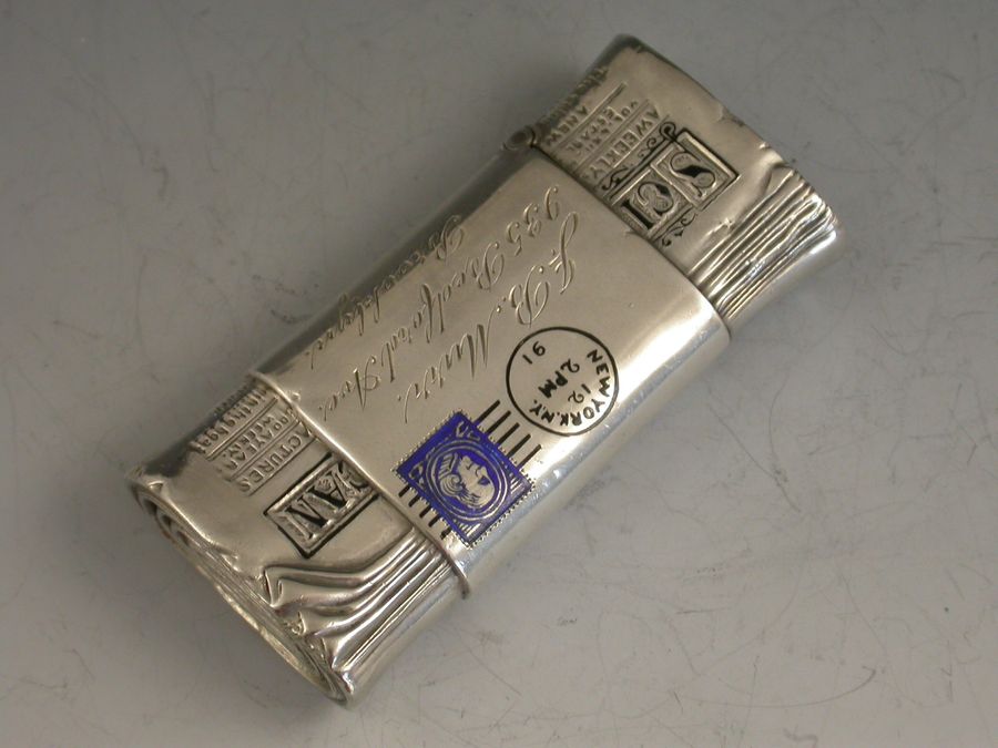 A fine and rare 19th century sterling silver and enamel Vesta Case made in the form of rolled up copy of the Scientific American Newspaper wrapped with an address label complete with enamel stamp and post mark. The reverse enamelled with three red dots to simulate sealing wax. The inner lip with patent registration date - October 14th 1890.