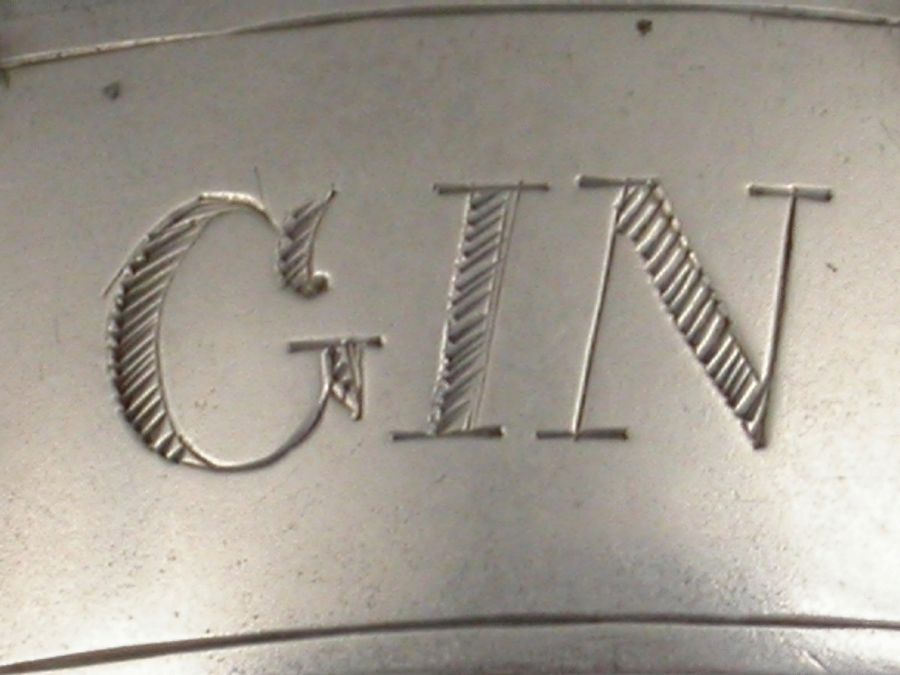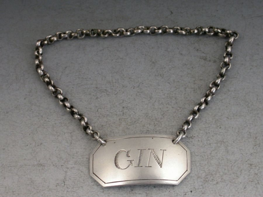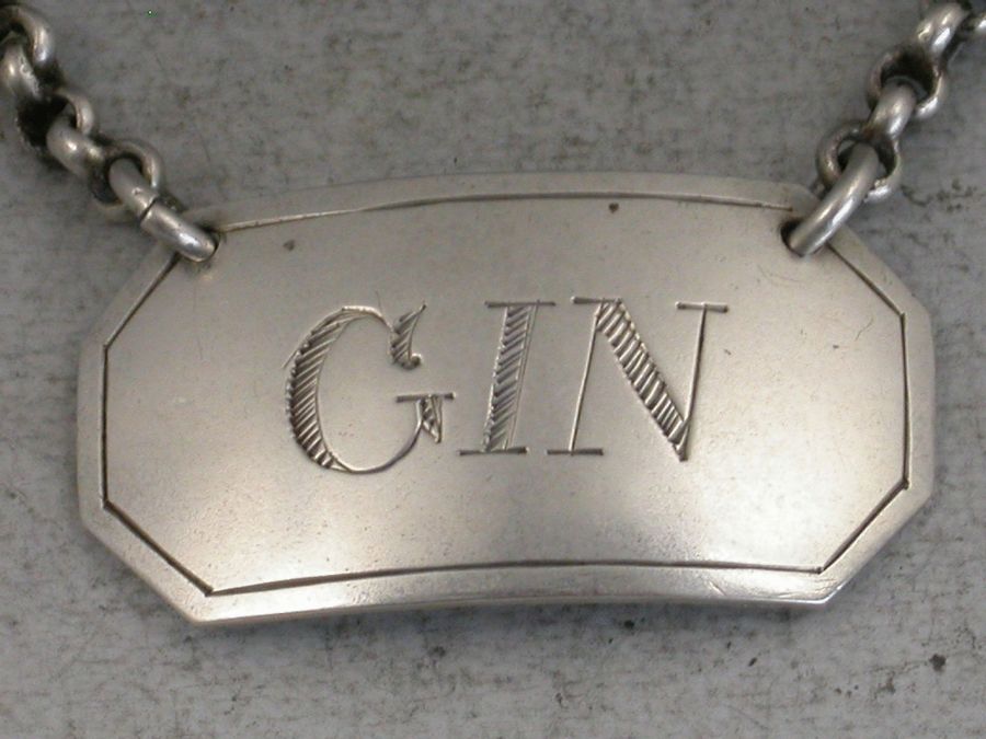 An unusual 19th century silver Wine Label of plain rectangular form with cut corners and single thread boarder, engraved for Gin with slightly slopping hatched letters.