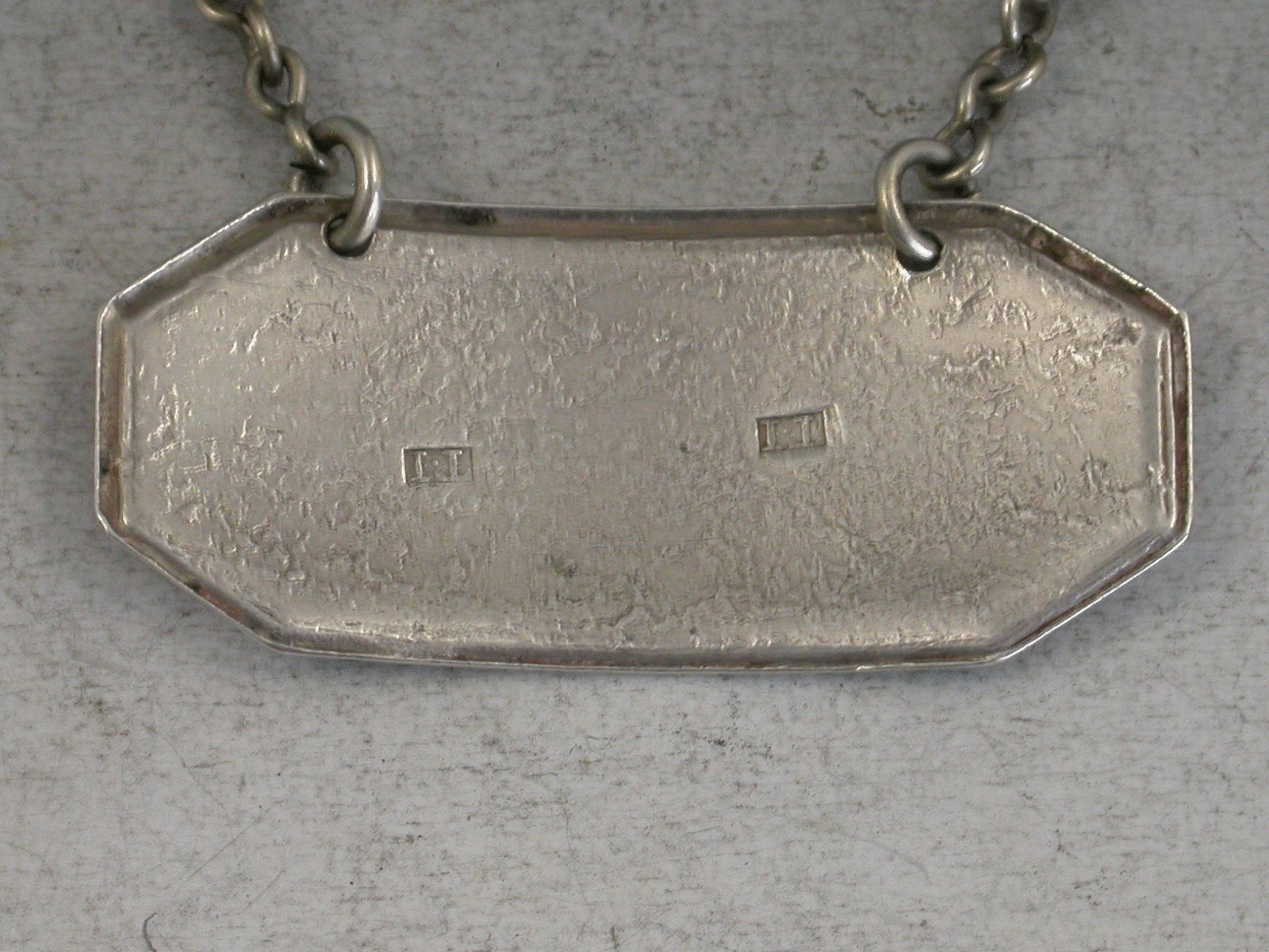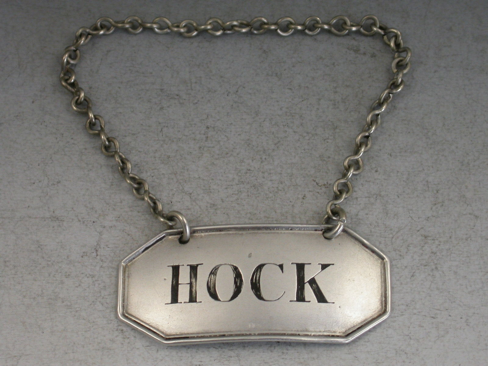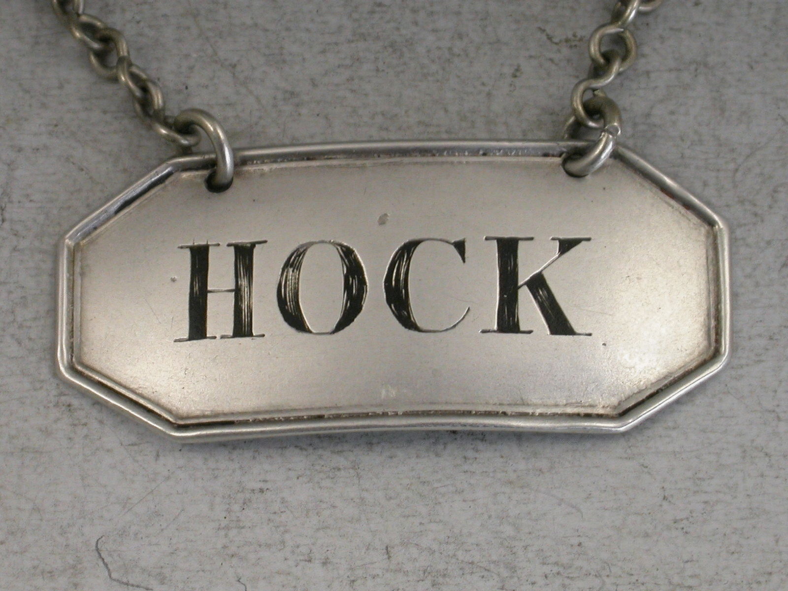 A rare 19th century silver Wine Label of plain rectangular form with cut corners and raised moulded border, incised and niello filled for Hock.