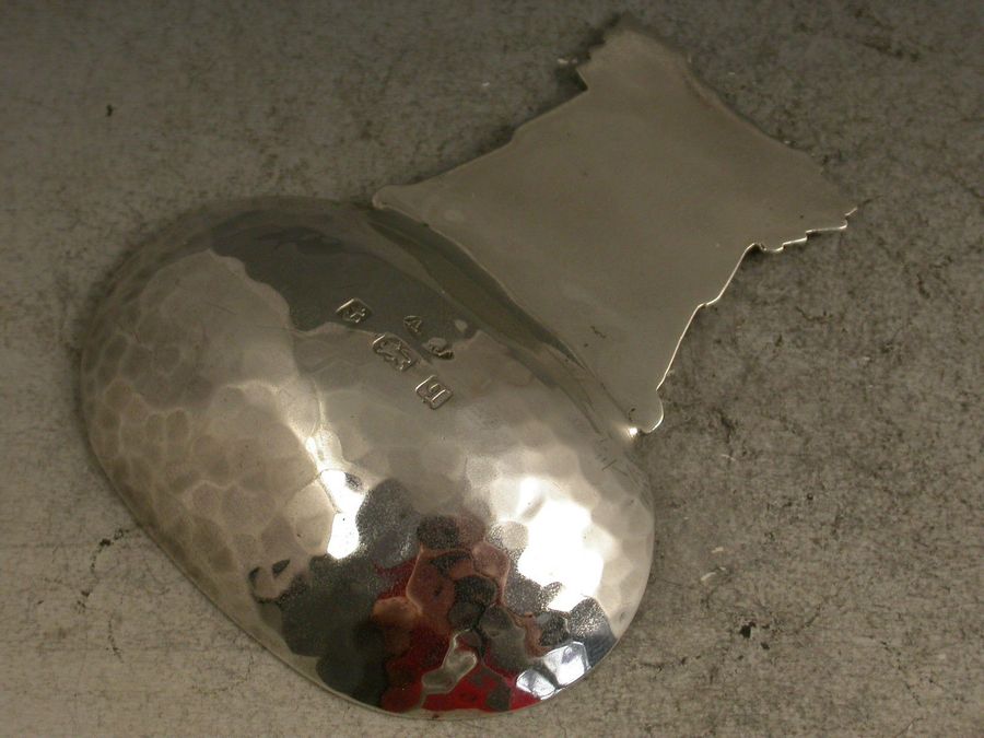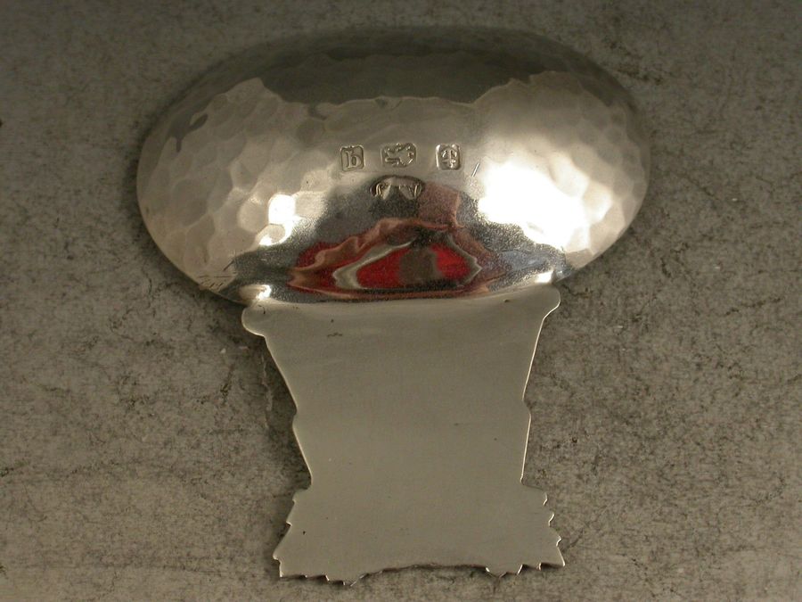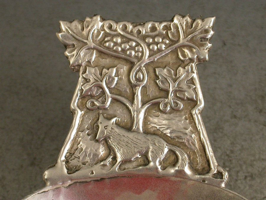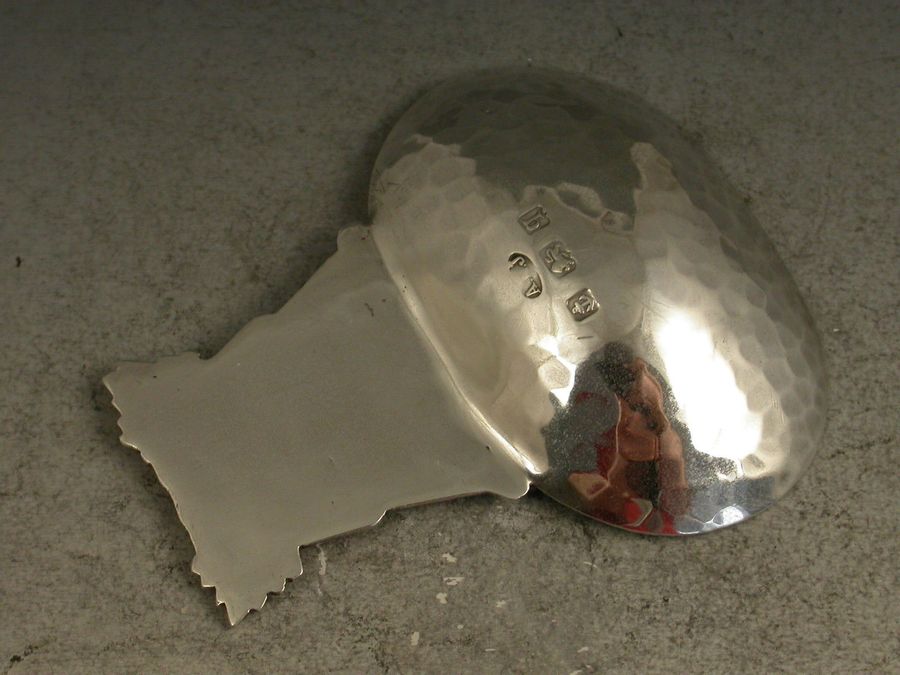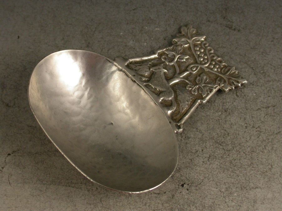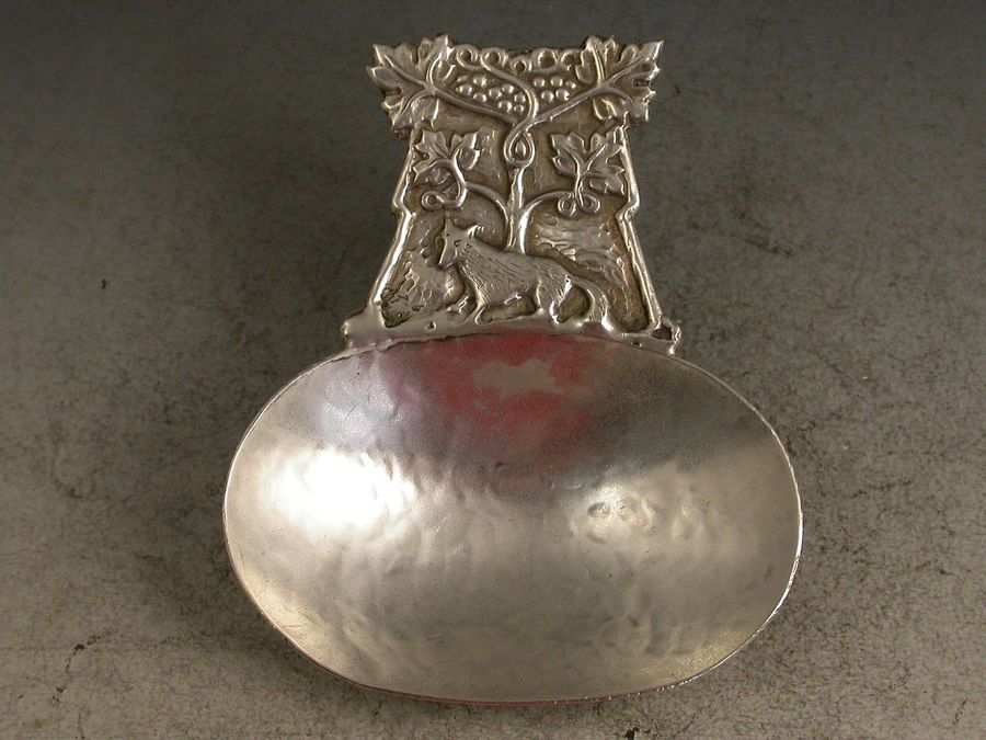 A rare early 20th century Arts & Crafts style silver Caddy Spoon, the large sideways oval bowl with hammered finish, the cast handle with chased decoration depicting a scene from Aesop's Fable of the Fox and the Grapes.