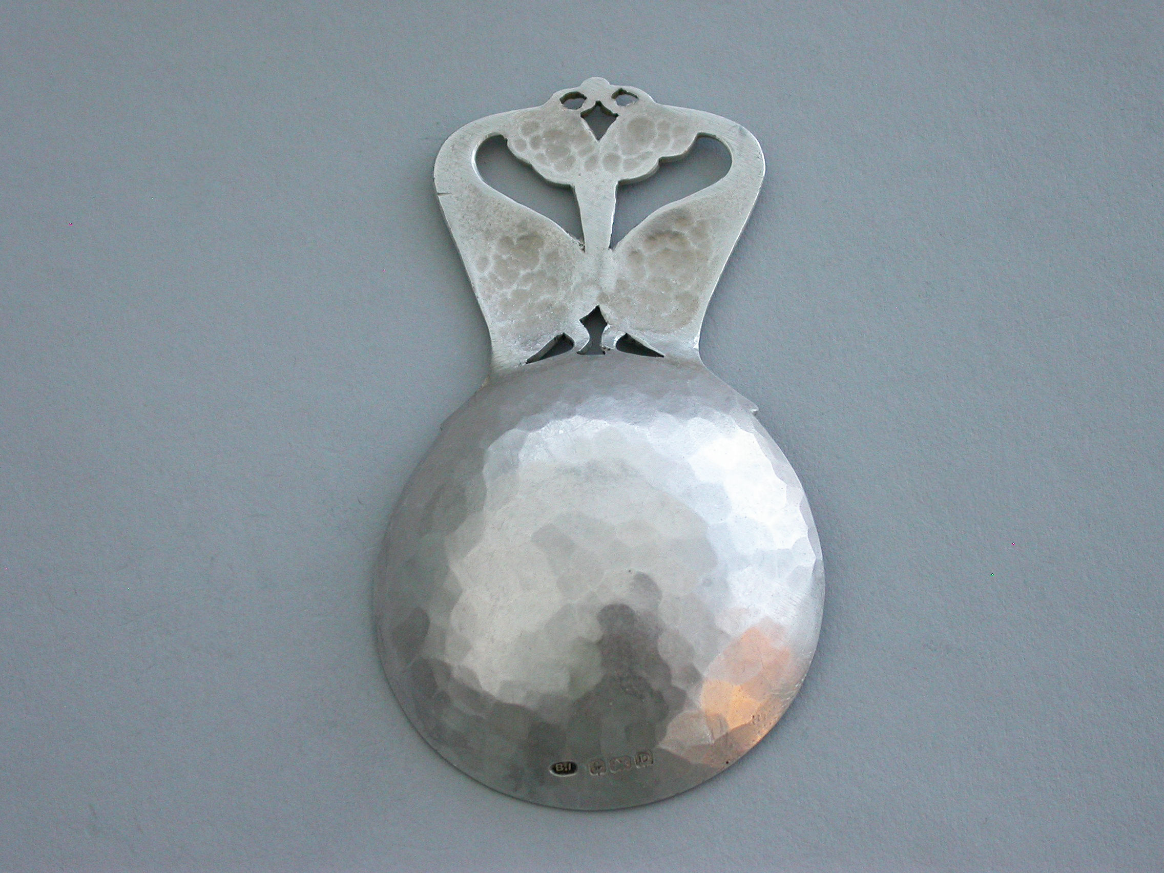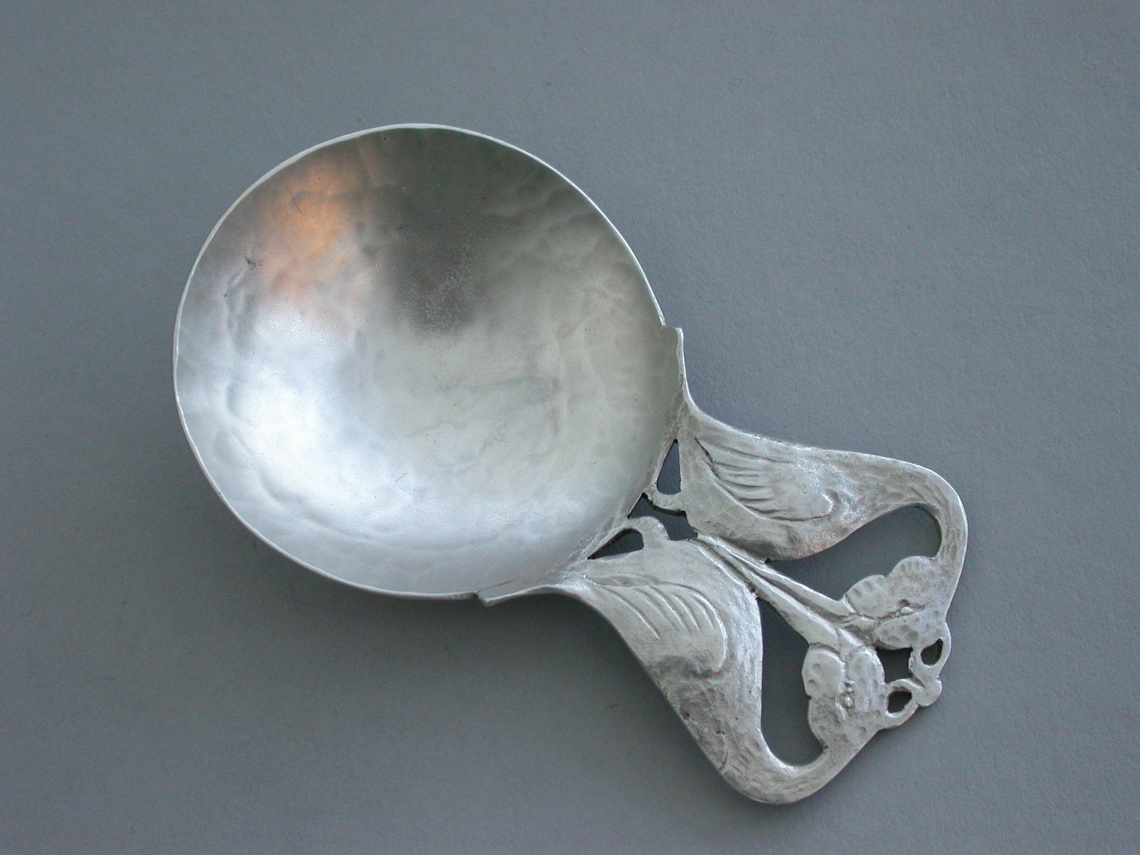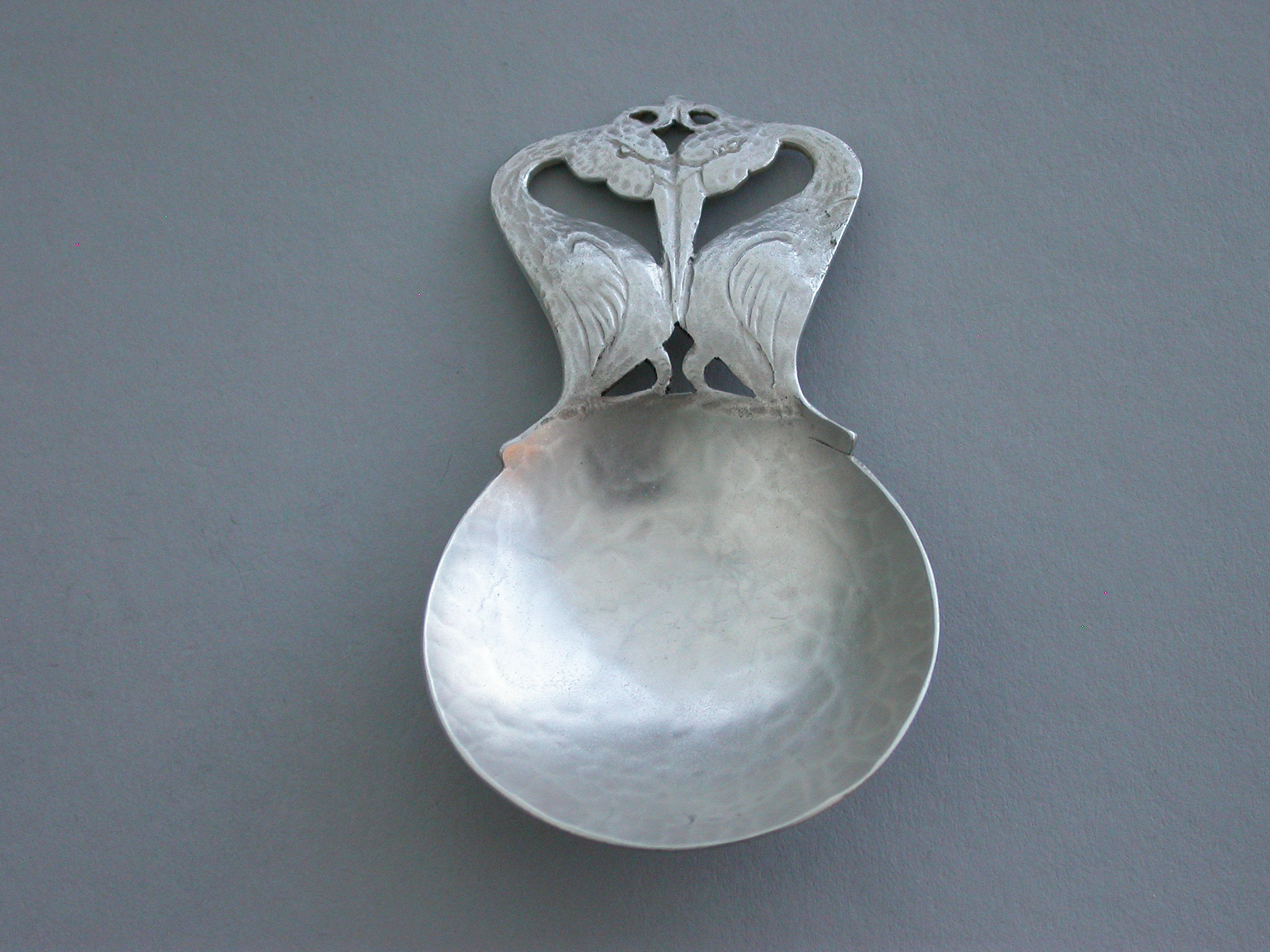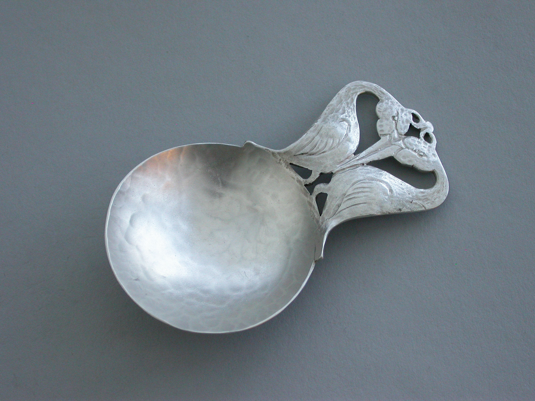 A rare early 20th century hammered silver Caddy Spoon made in the Arts & Crafts style, with circular bowl and pierced handle depicting two stylized storks, sitting face to face.