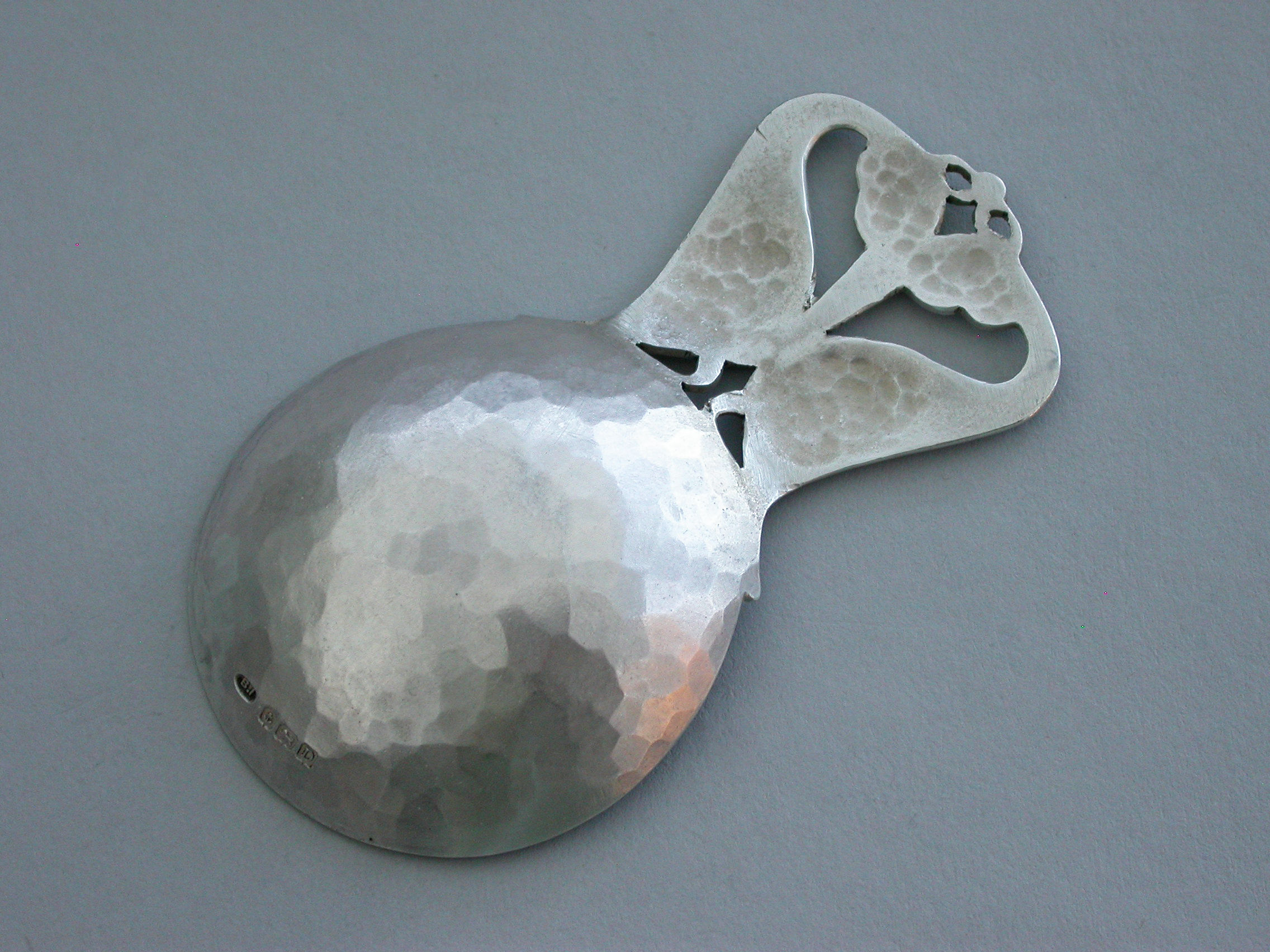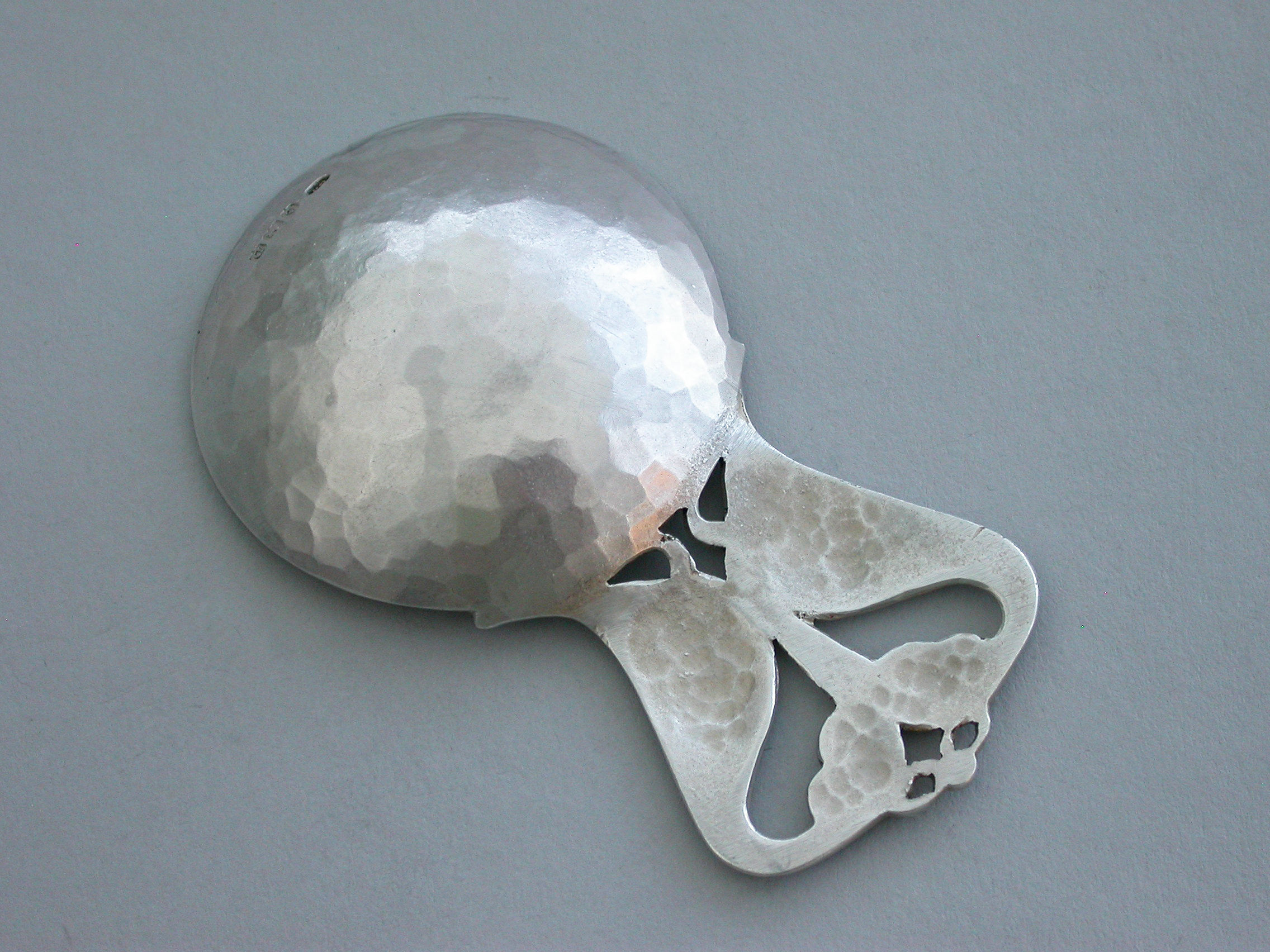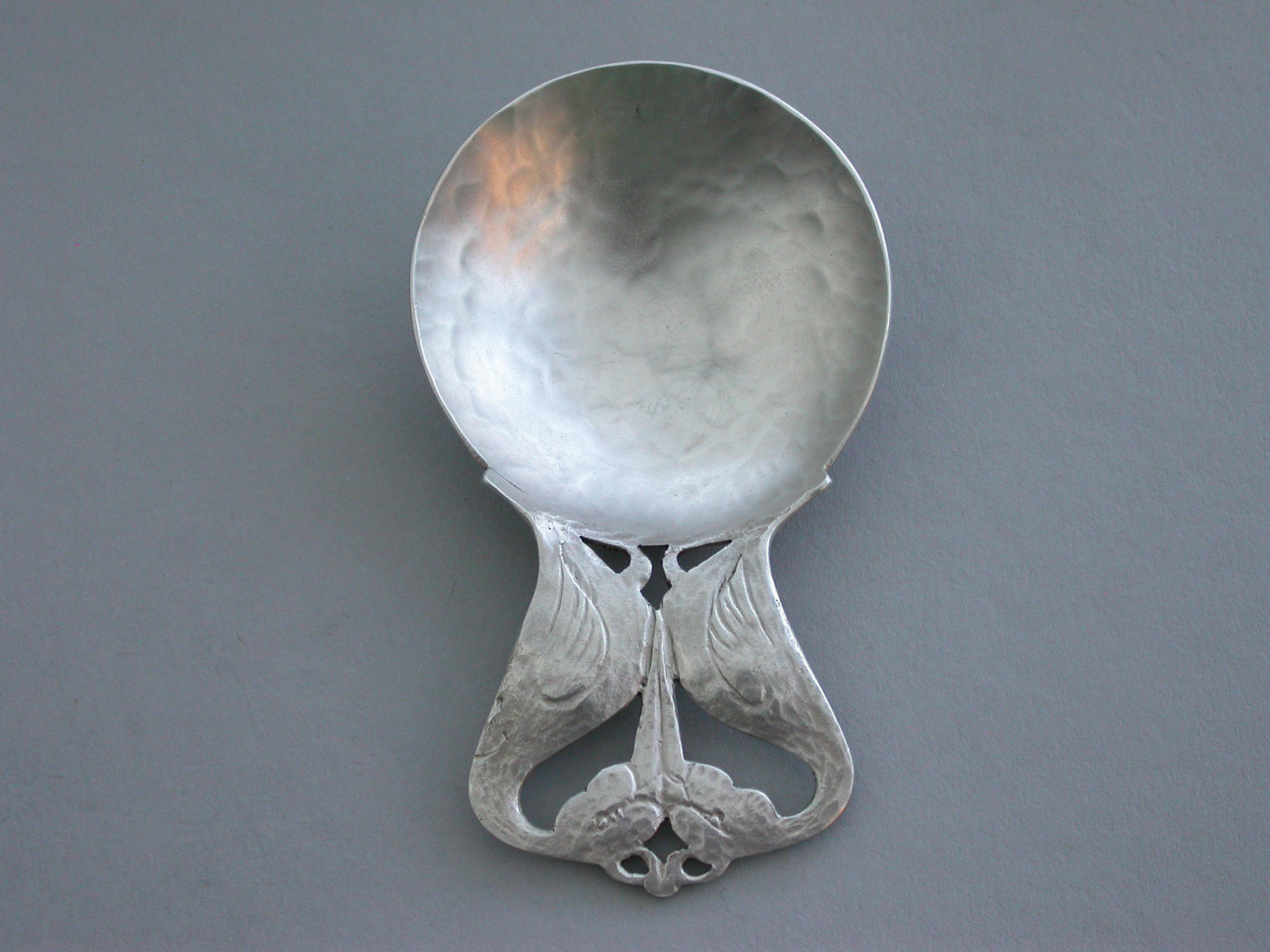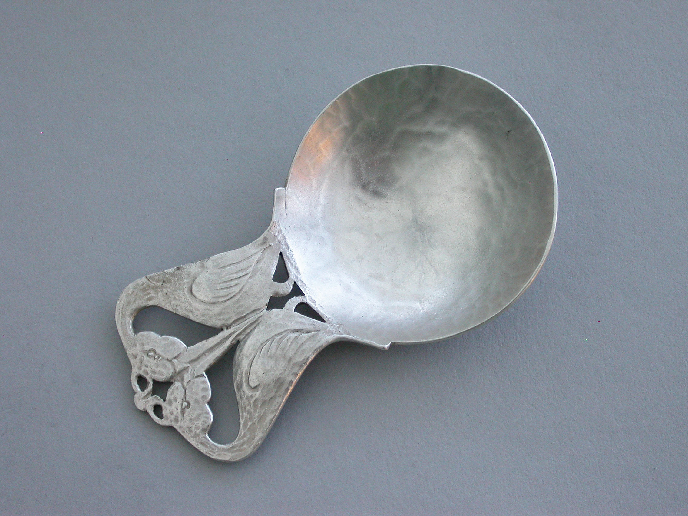 A rare early 20th century hammered silver Caddy Spoon made in the Arts & Crafts style, with circular bowl and pierced handle depicting two stylized storks, sitting face to face.