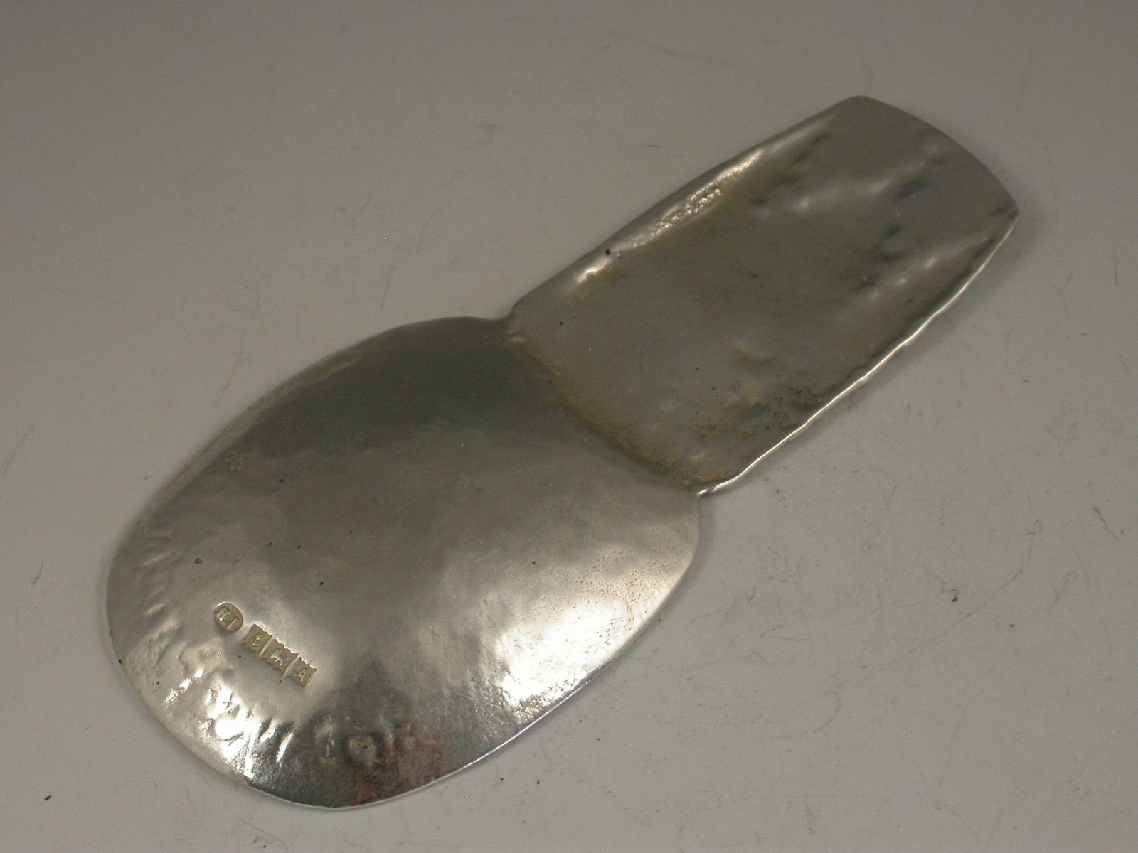 A mid 20th century cast silver Caddy Spoon with all over hammered finish, the handle depicting St Paul's Cathedral in high relief.
