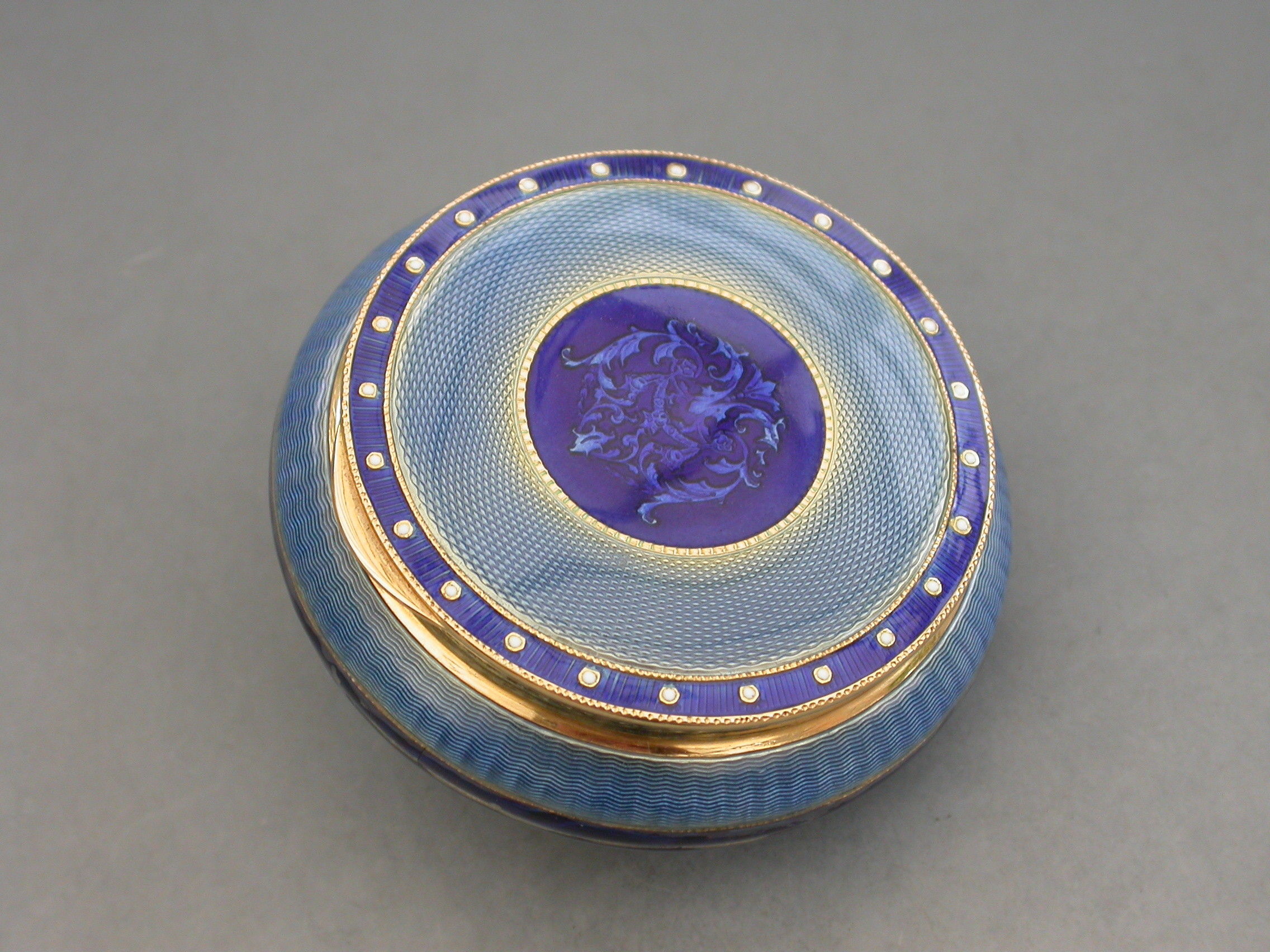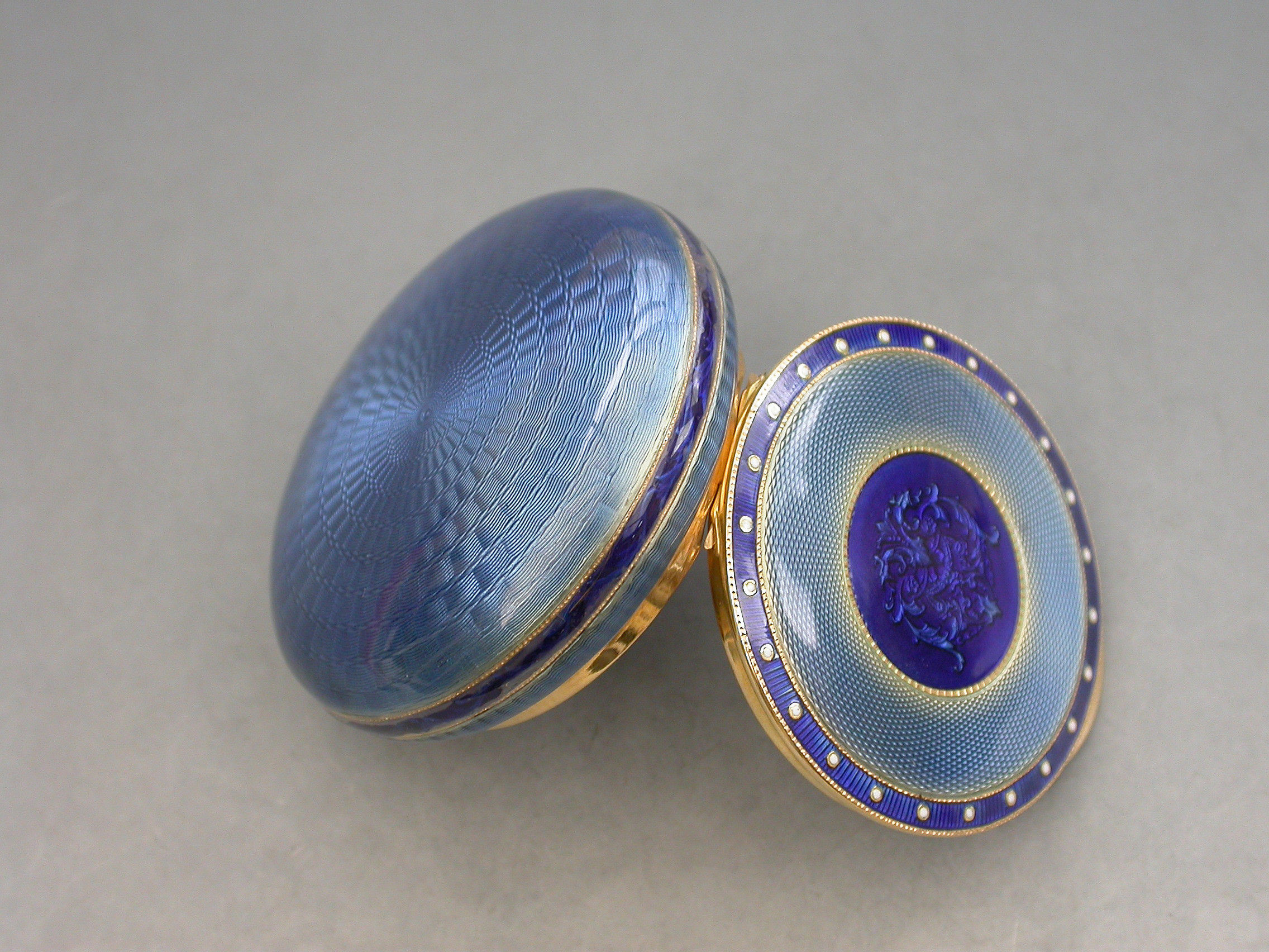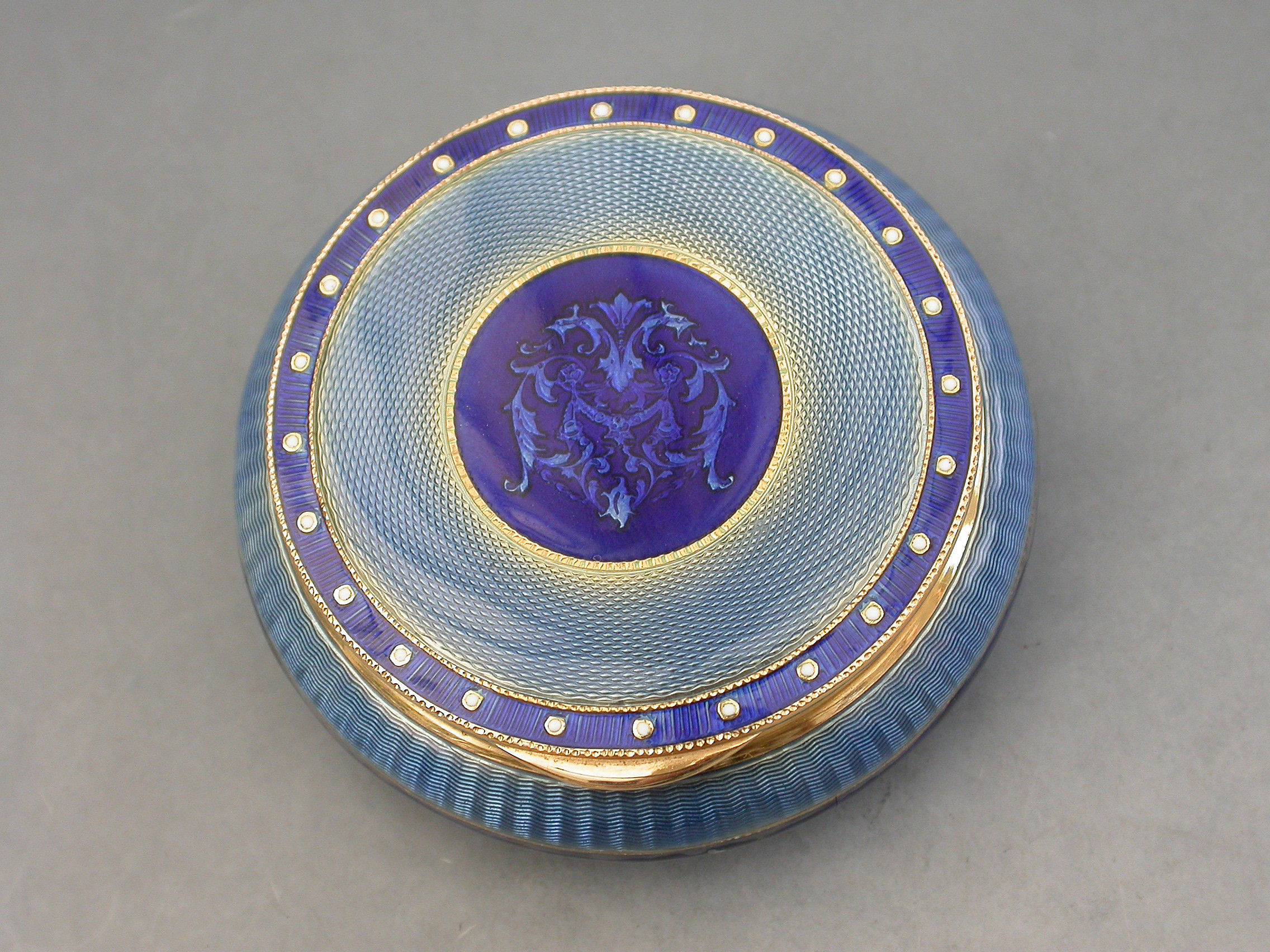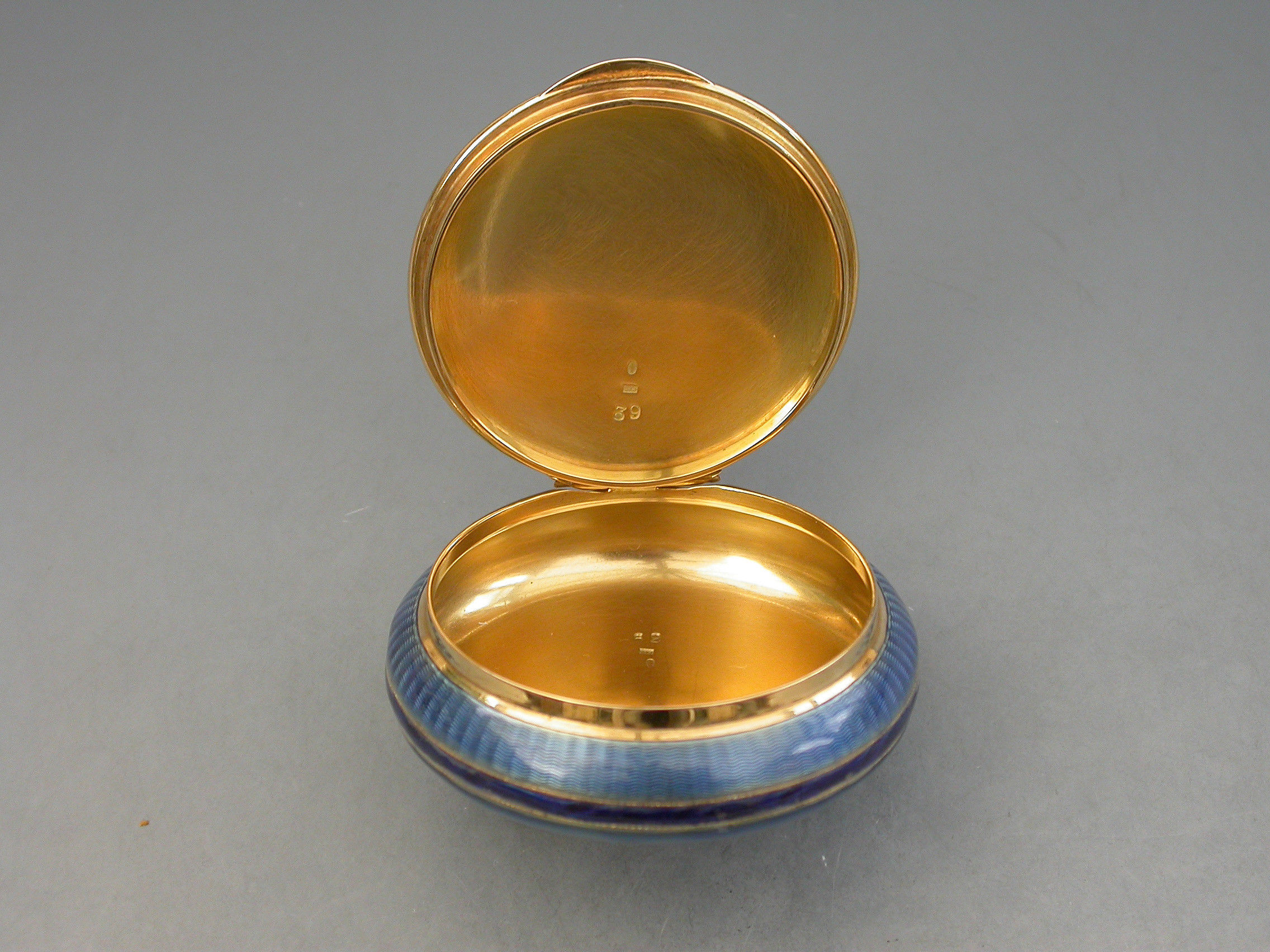 A very fine quality 20th century Continental 18 carat gold and enamel compressed circular Pill Box, decorated with two shades of blue guilloche enamel and white pearl accents, a Rococo foliate scroll cypher to the central cartouche on the lid.