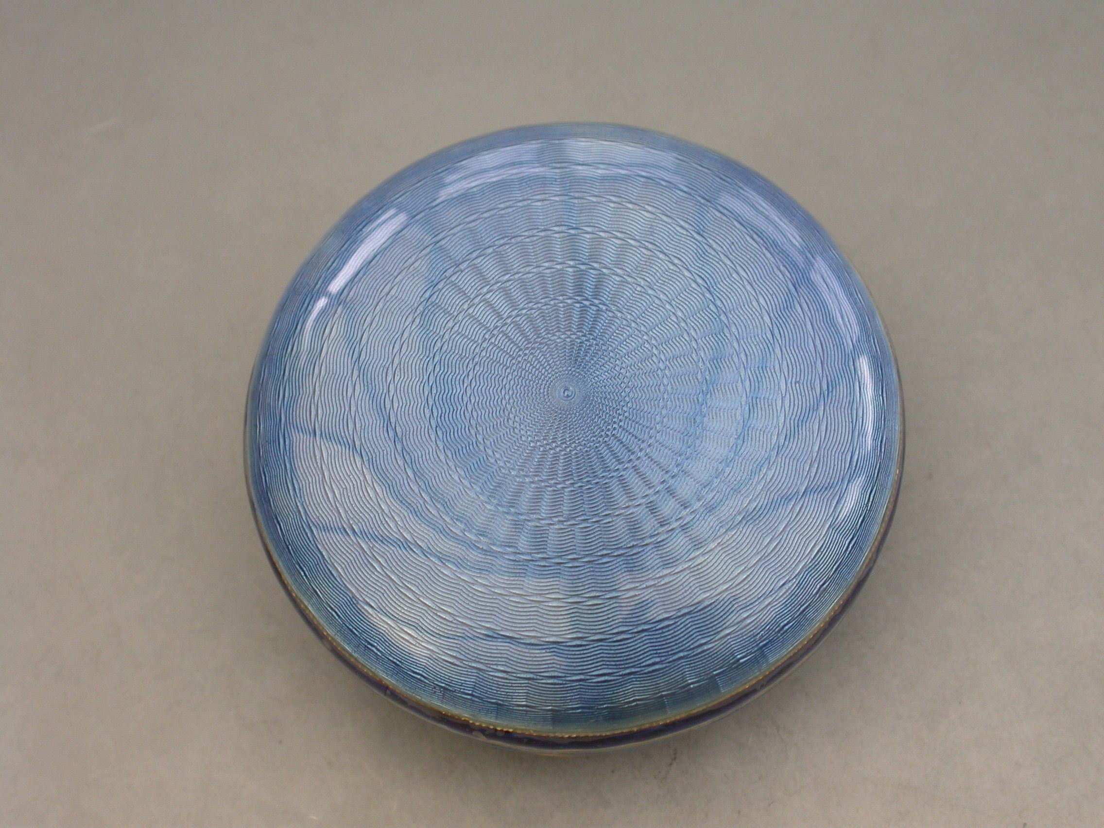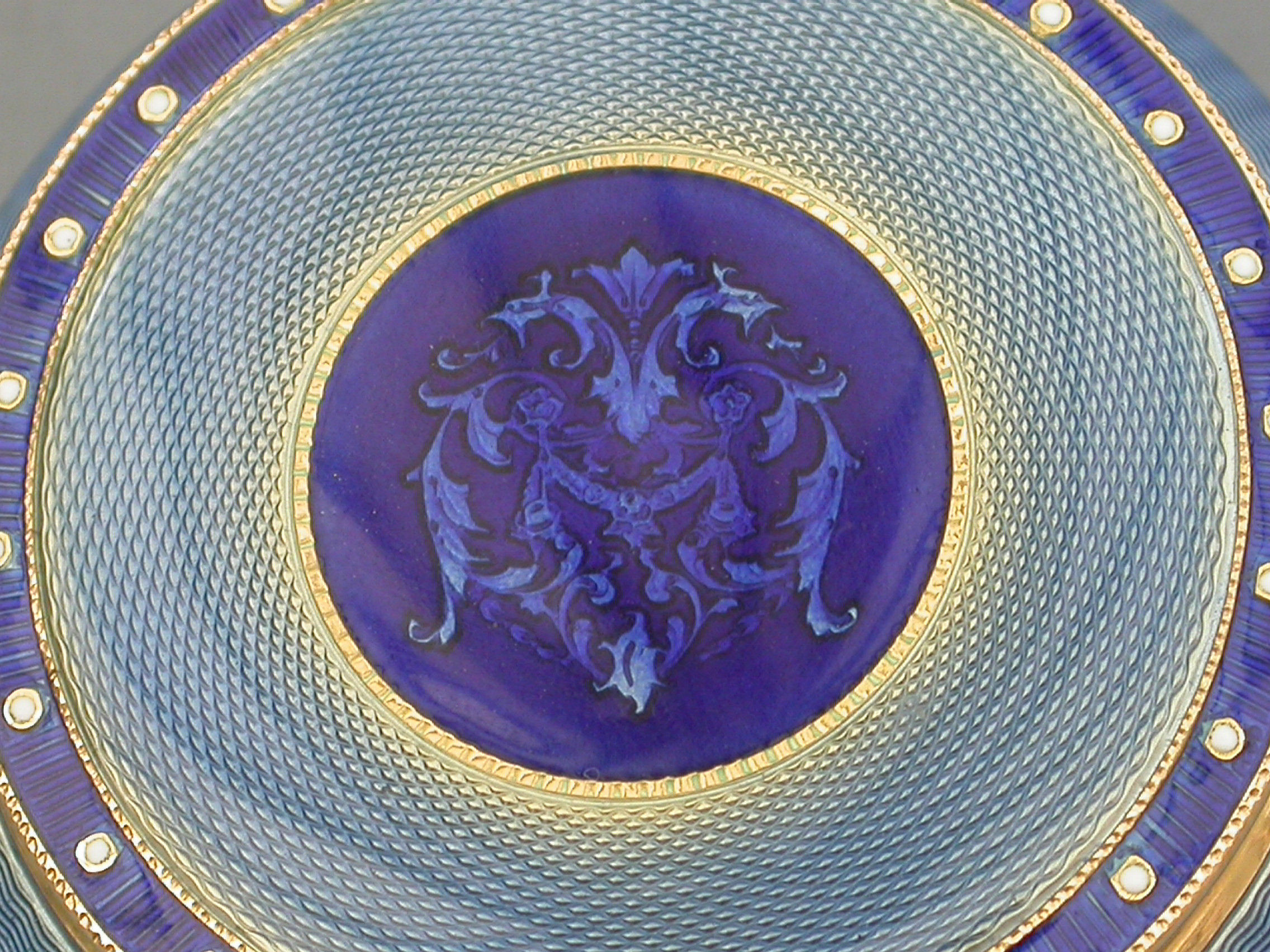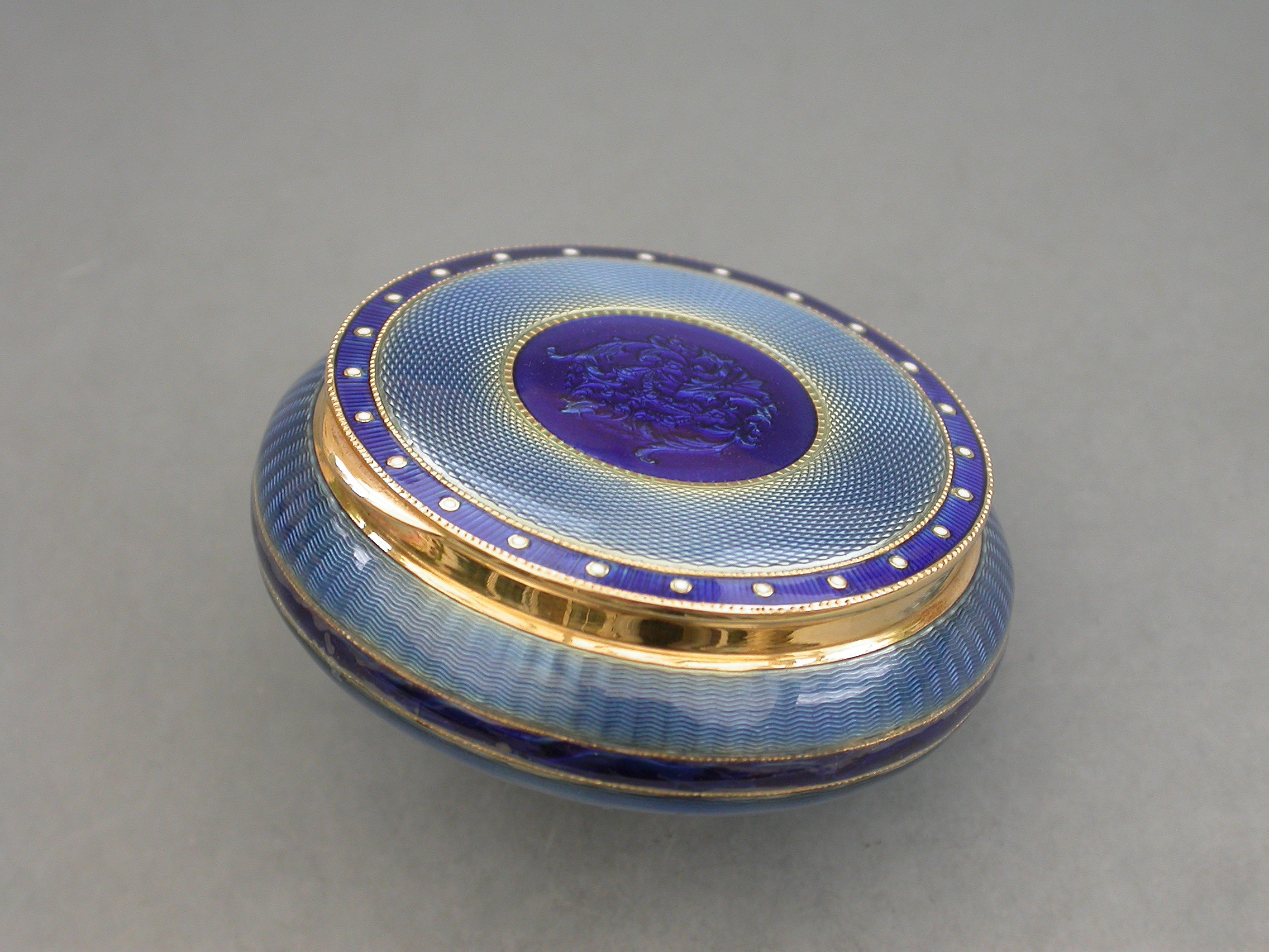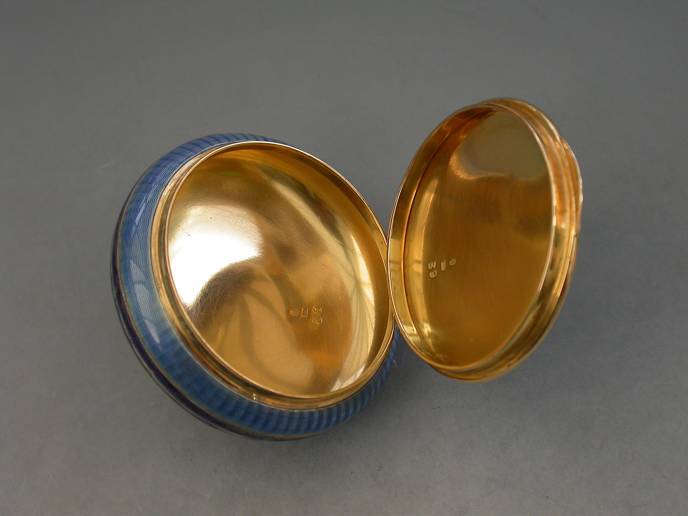A very fine quality 20th century Continental 18 carat gold and enamel compressed circular Pill Box, decorated with two shades of blue guilloche enamel and white pearl accents, a Rococo foliate scroll cypher to the central cartouche on the lid.