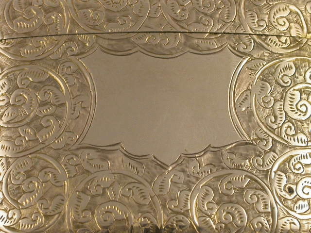A very fine and large early 20th century 9 carrat Gold Vesta Case of rounded rectangular form with attached suspension ring , all over foliate scroll engraving with vacant shaped cartouche. Marked on lid, case and ring.