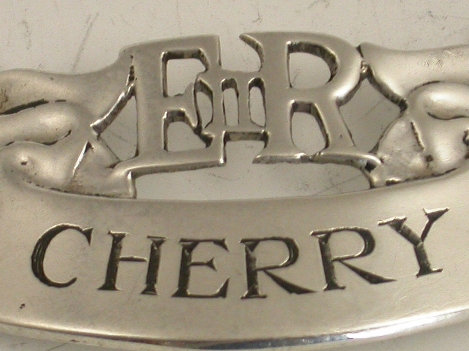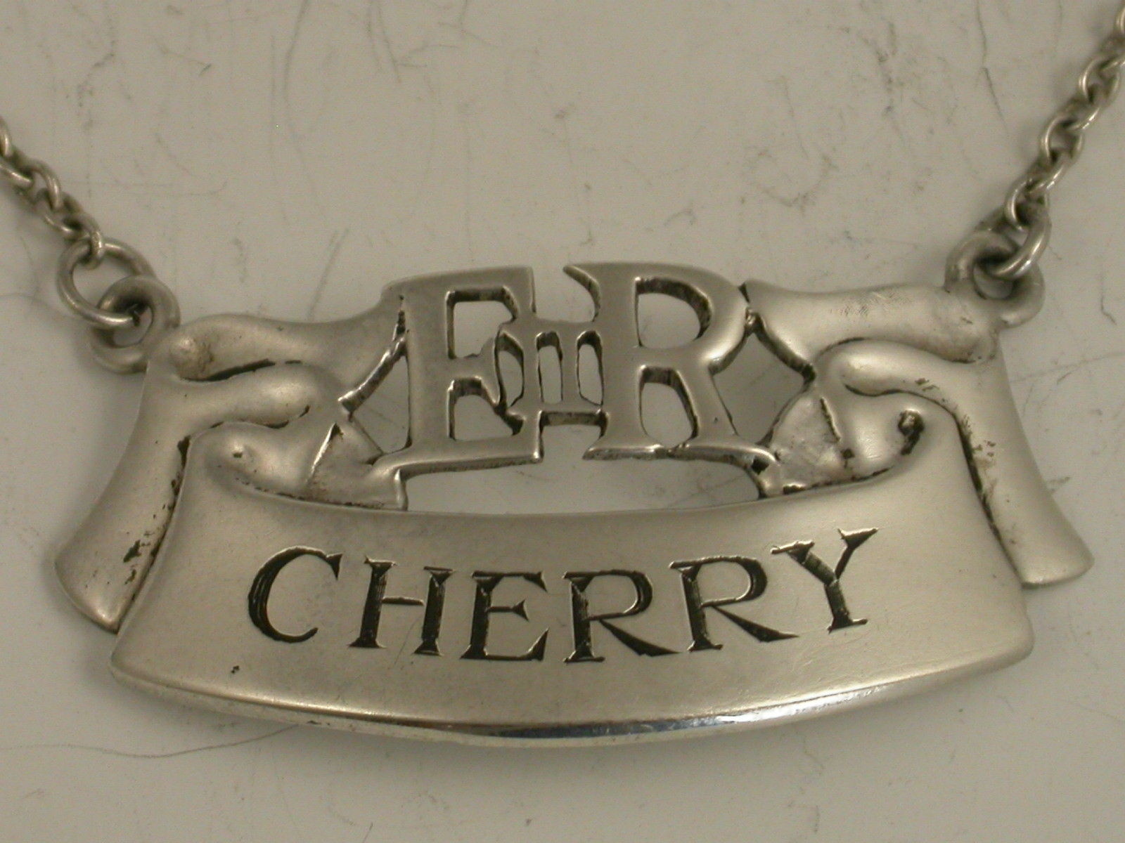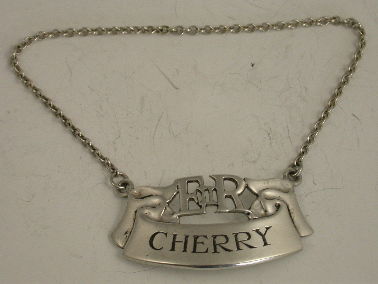 A mid 20th century silver Wine Label of scroll form with 'ERII' surmount, incised on the nameplate for Cherry.