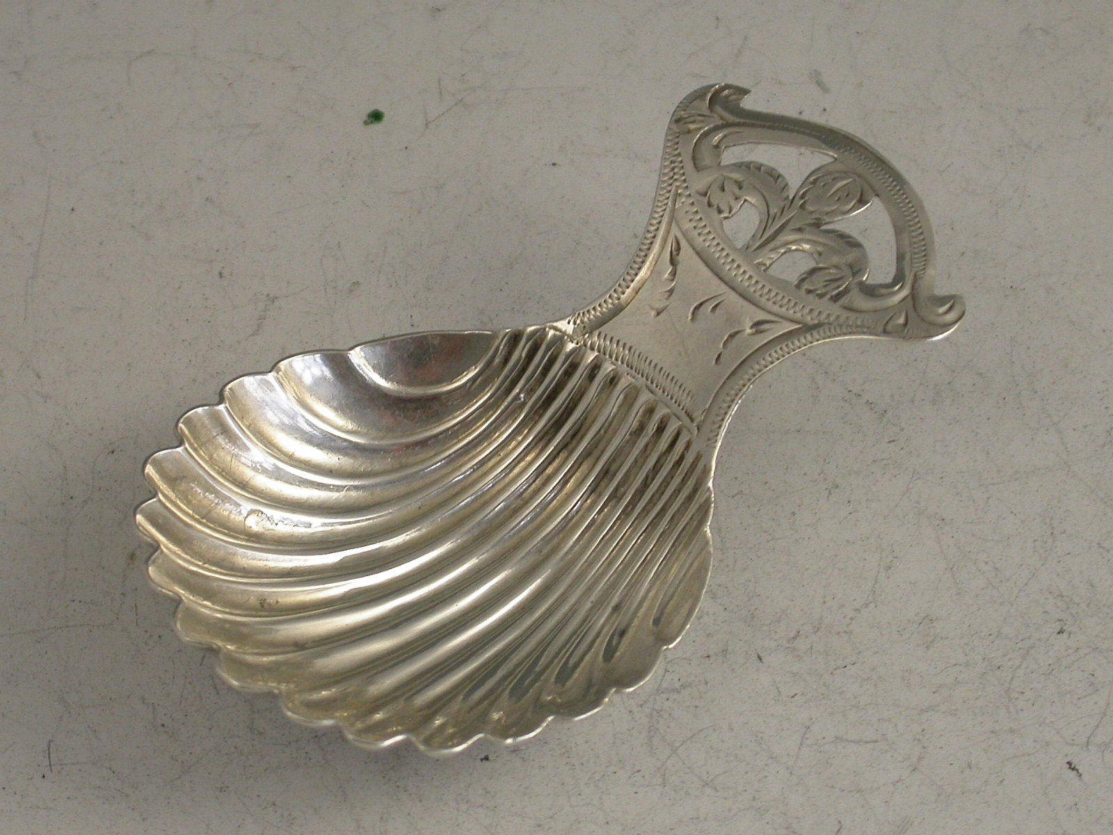 An extremely rare George III silver Caddy Spoon with circular fluted scallop shell bowl, the short mushroom shaped handle with bright cut engraved decoration and pierced with a ""Prince of Wales Feathers"" design.