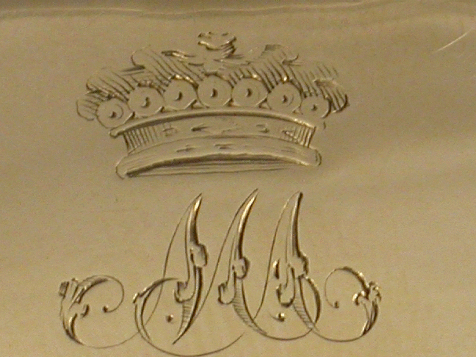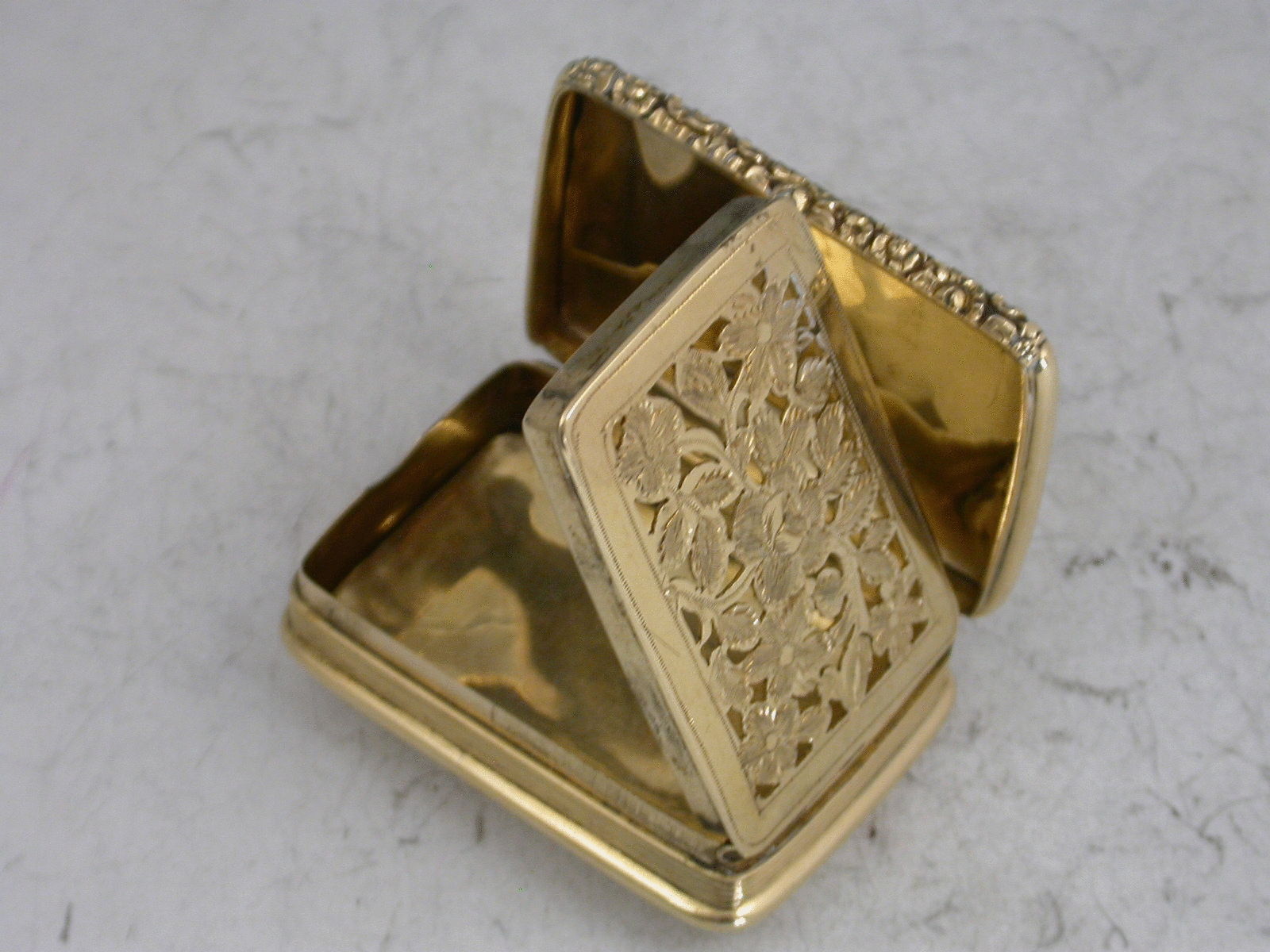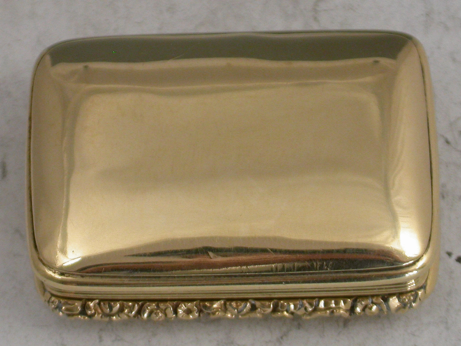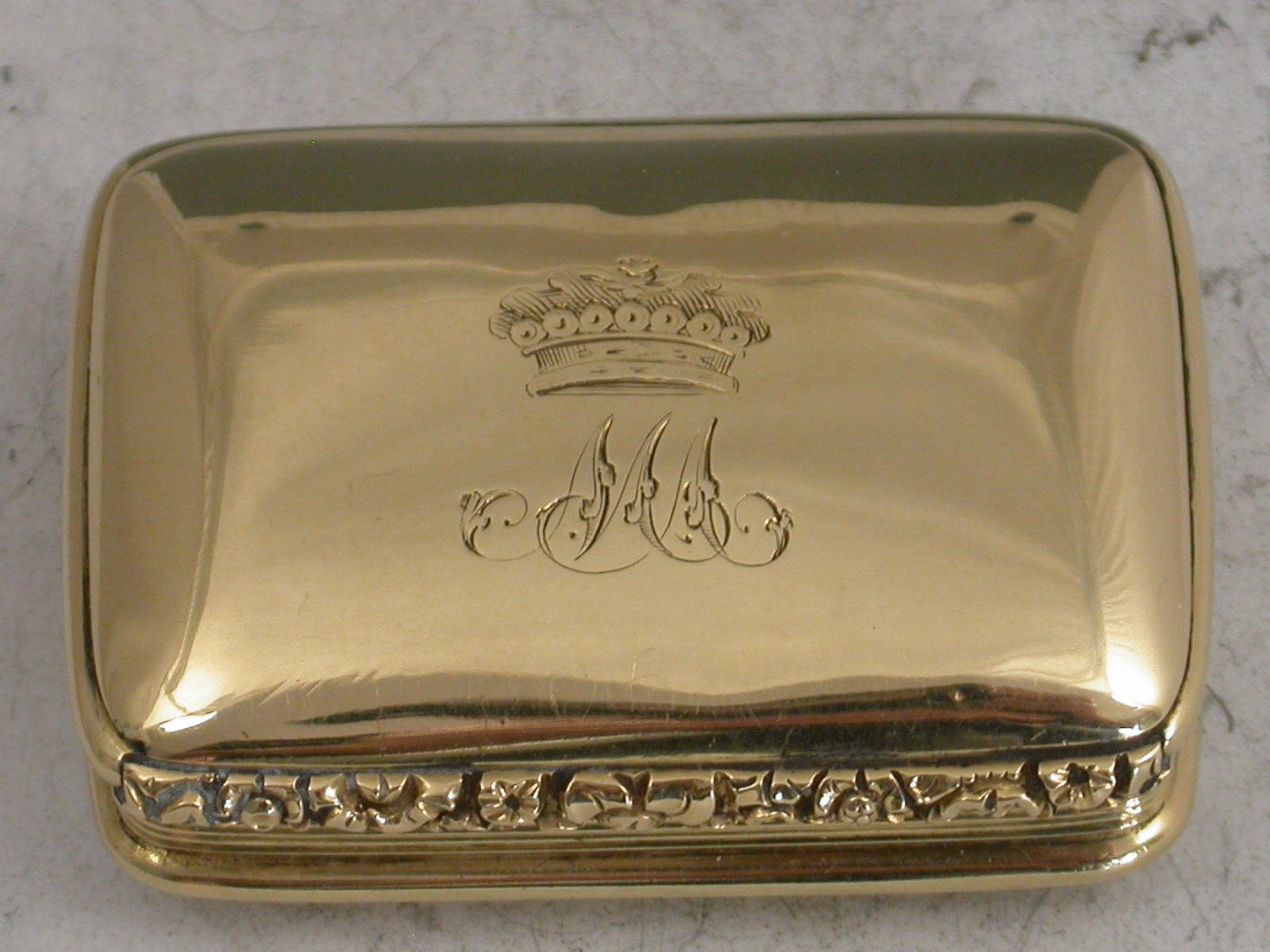 A rare George IV / William IV Scottish Provincial Gold Vinaigrette of rounded oblong form with reeded sides & a chased floral thumb piece, plain domed base & cover, initialled ""MA"" below a coronet*, the grille pierced & engraved with a rose flower, maker's mark only ""J.M."", struck thrice in the cover & thrice in the base, probably for John Mackie, Ellon c.1830