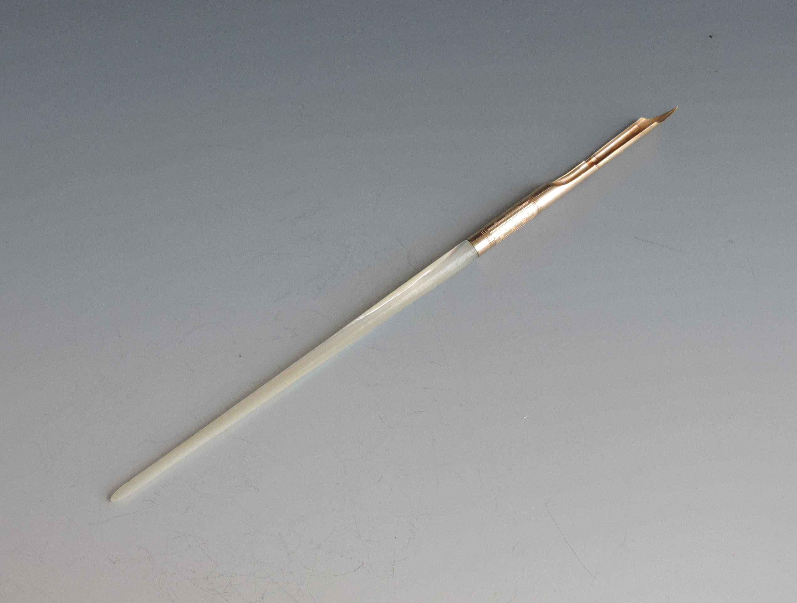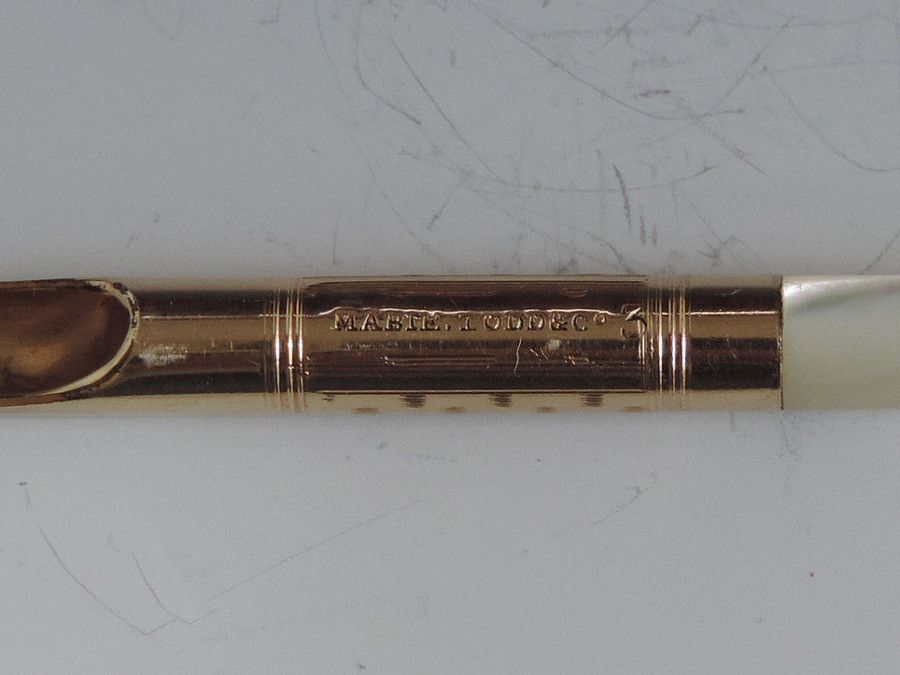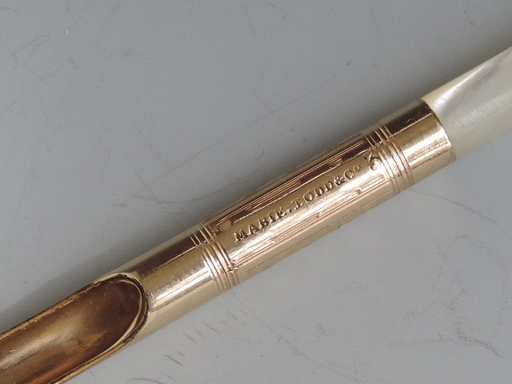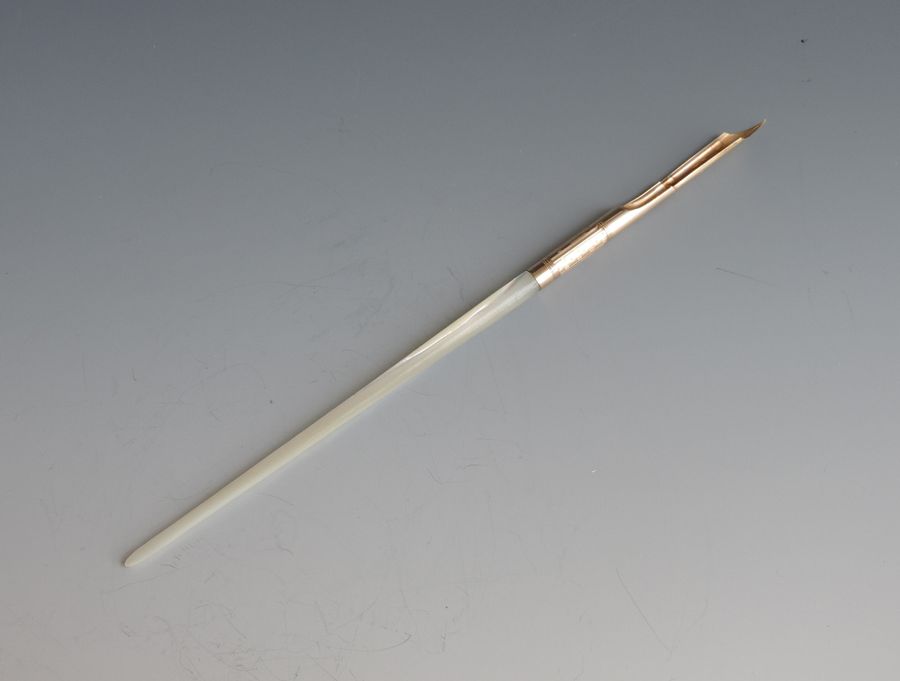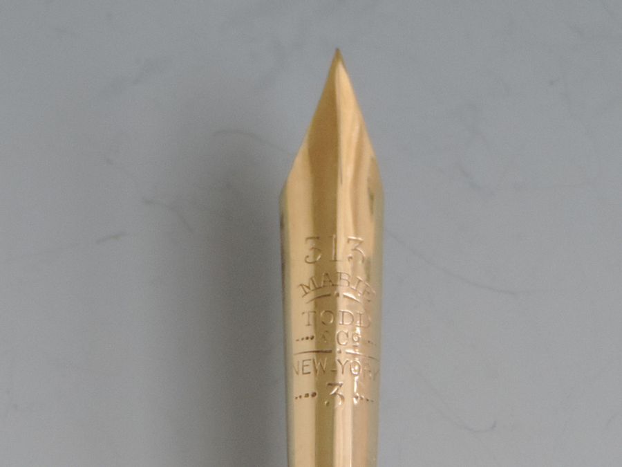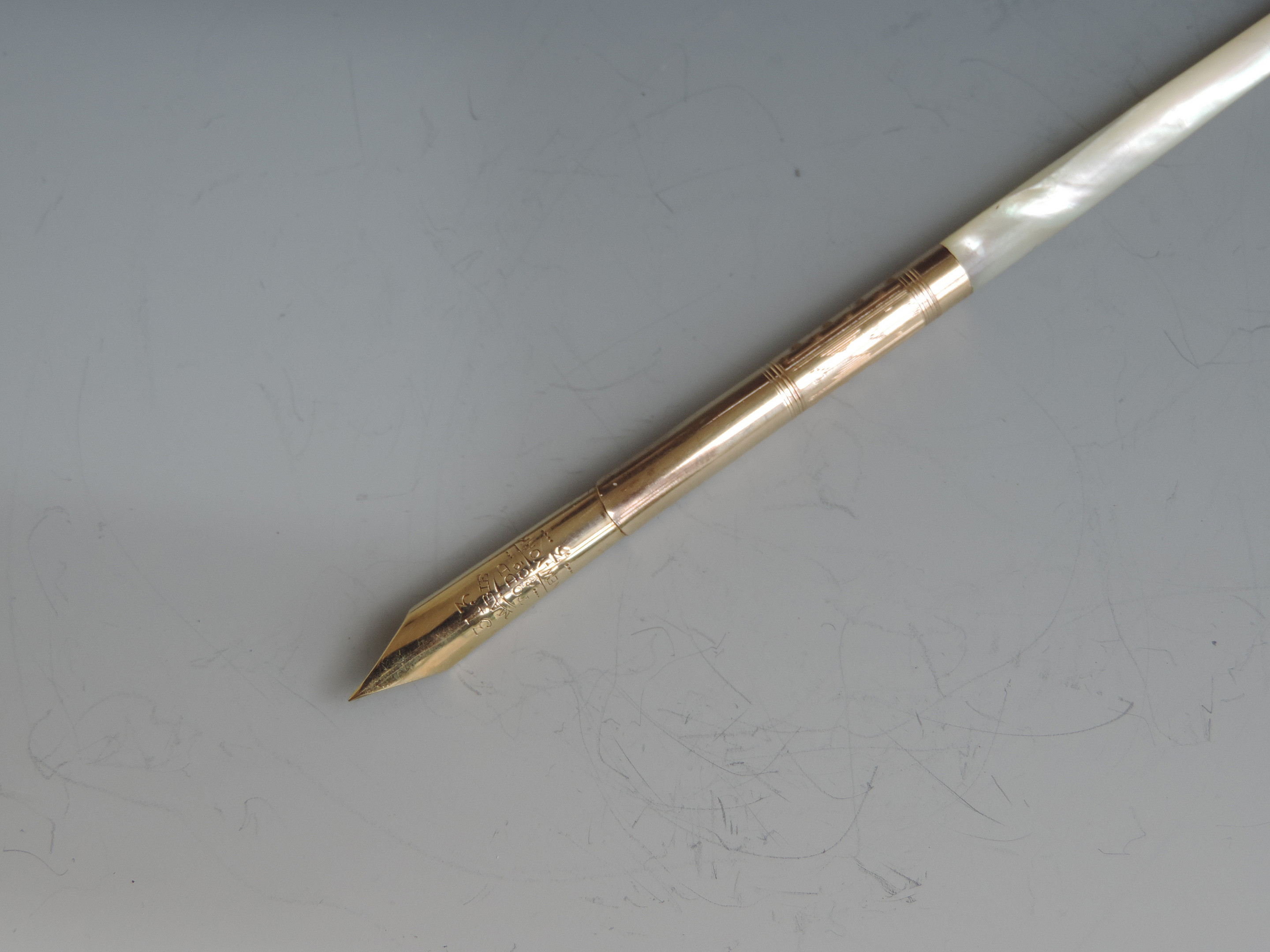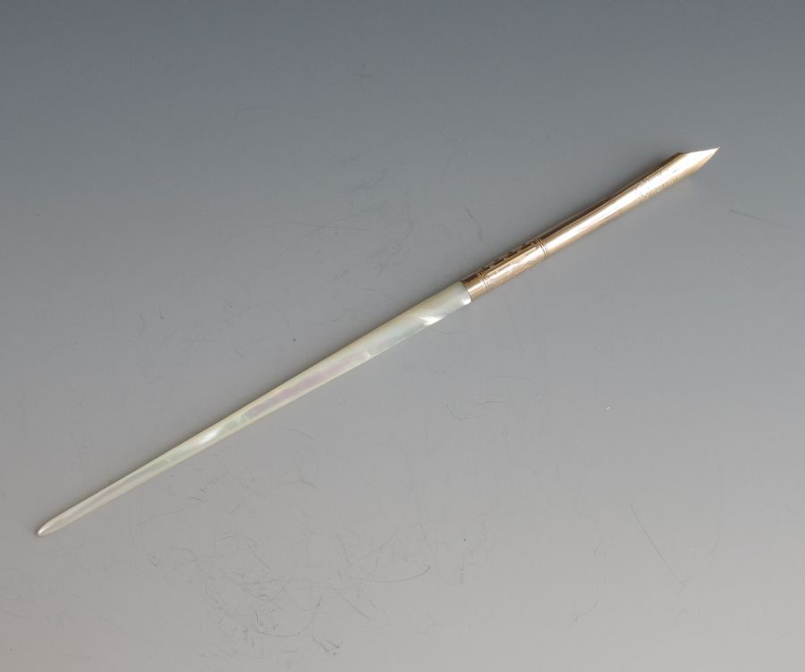 A fine quality and elegant late 19th century American 14 carat gold Dip Pen with tapering Mother of Pearl handle, the ferrule stamped - Mabie.Todd & Co 3, the gold nib engraved - 313 Mabie Todd & Co, New York 3 (the pen and the nib are matching and started life together).