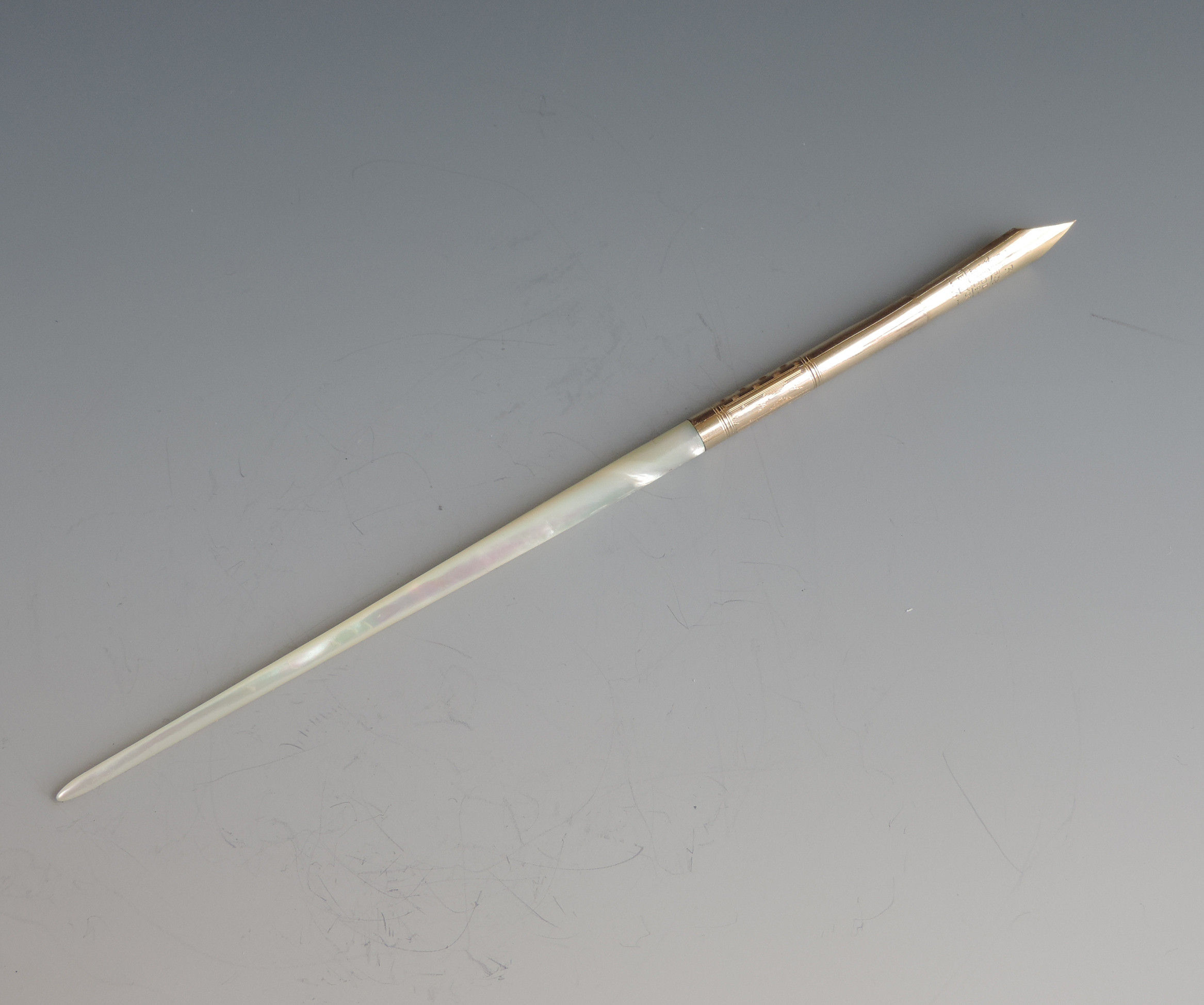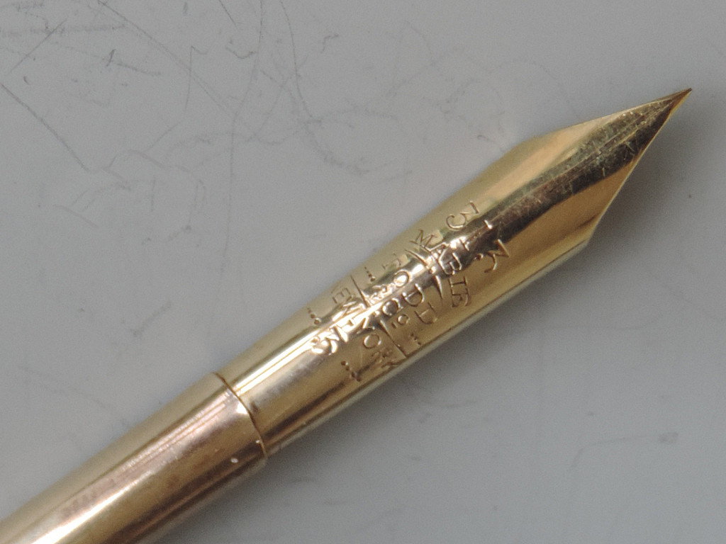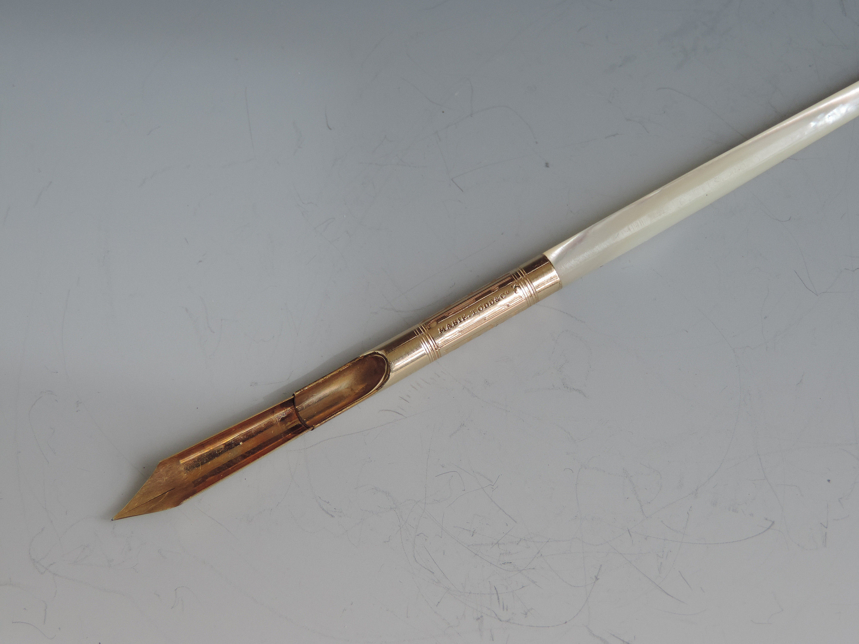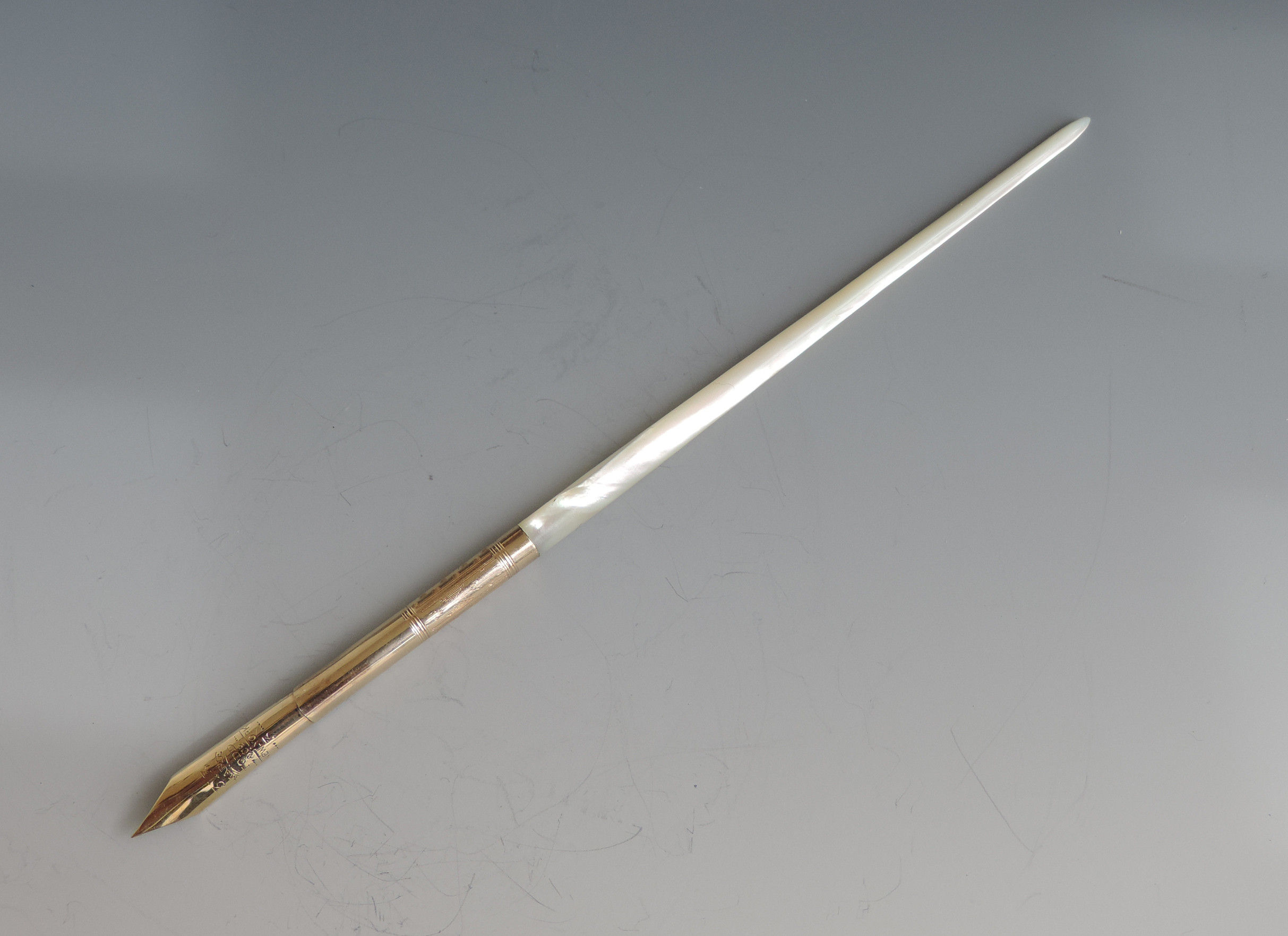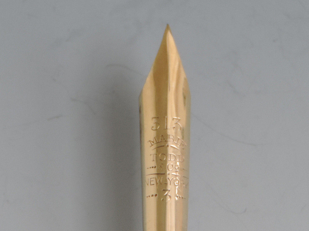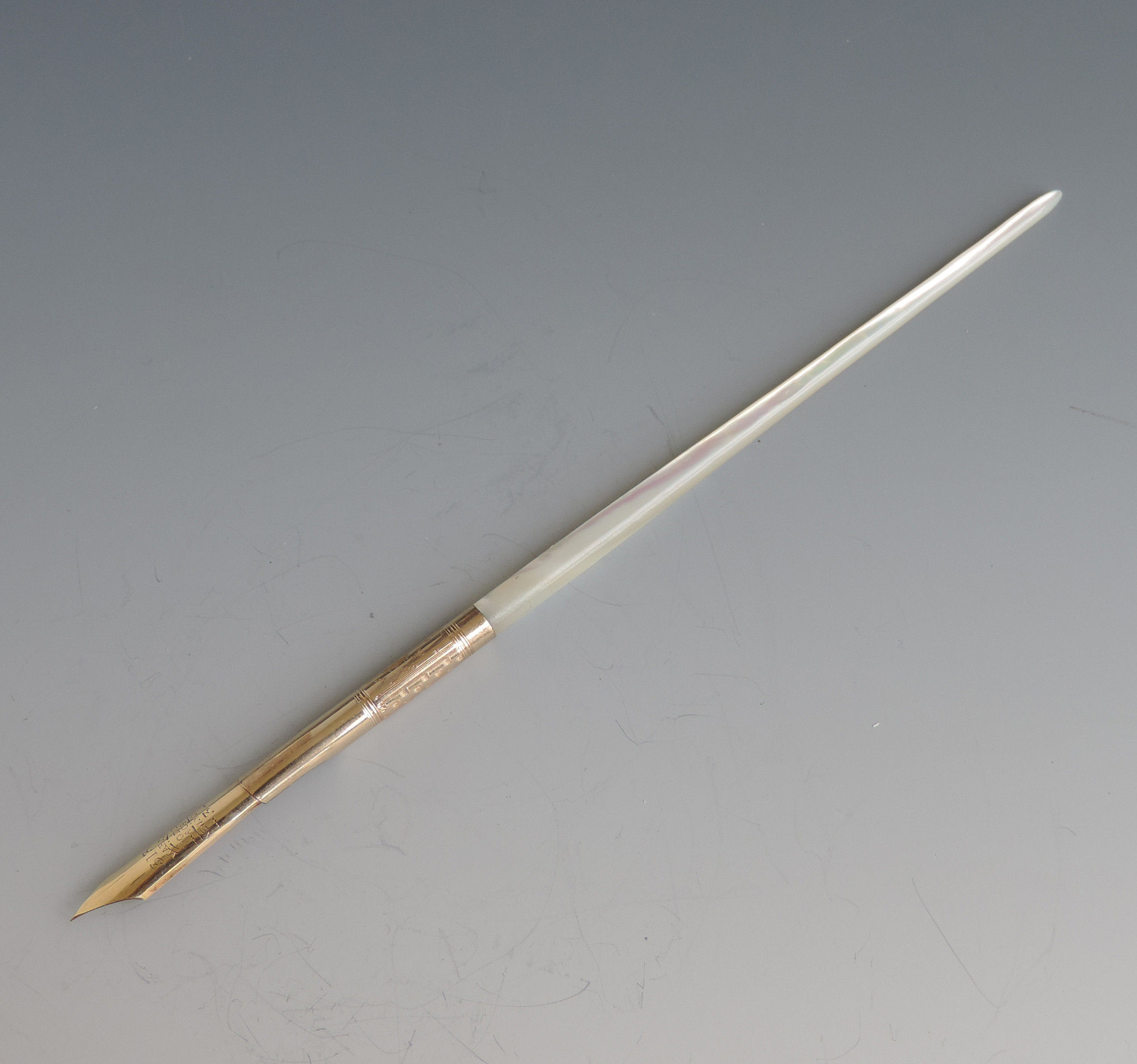A fine quality and elegant late 19th century American 14 carat gold Dip Pen with tapering Mother of Pearl handle, the ferrule stamped - Mabie.Todd & Co 3, the gold nib engraved - 313 Mabie Todd & Co, New York 3 (the pen and the nib are matching and started life together).