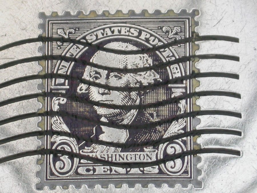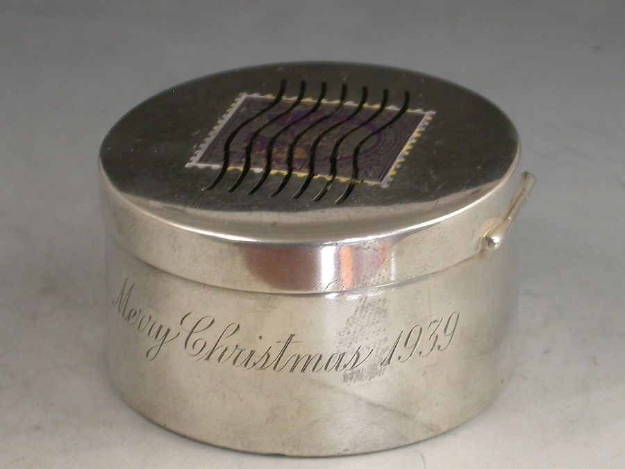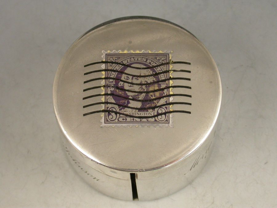 A good early 20th century American sterling silver Stamp Box of circular form with hinged lid set with enamelled 3 cent lilac stamp depicting George Washington, complete with central spindle to hold a roll of stamps dispensed through a slot in the side of the box.