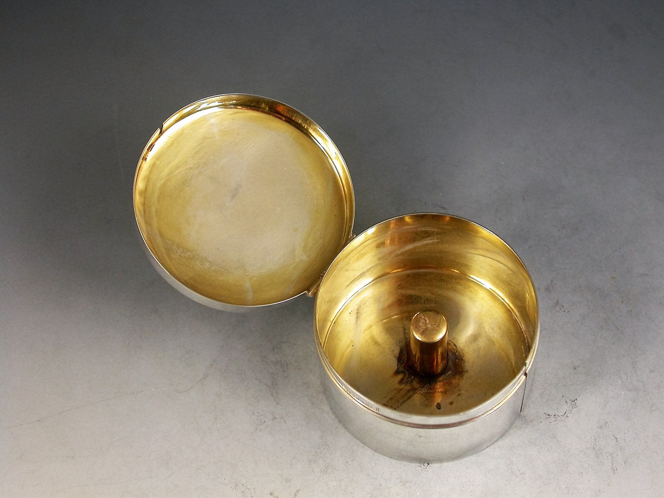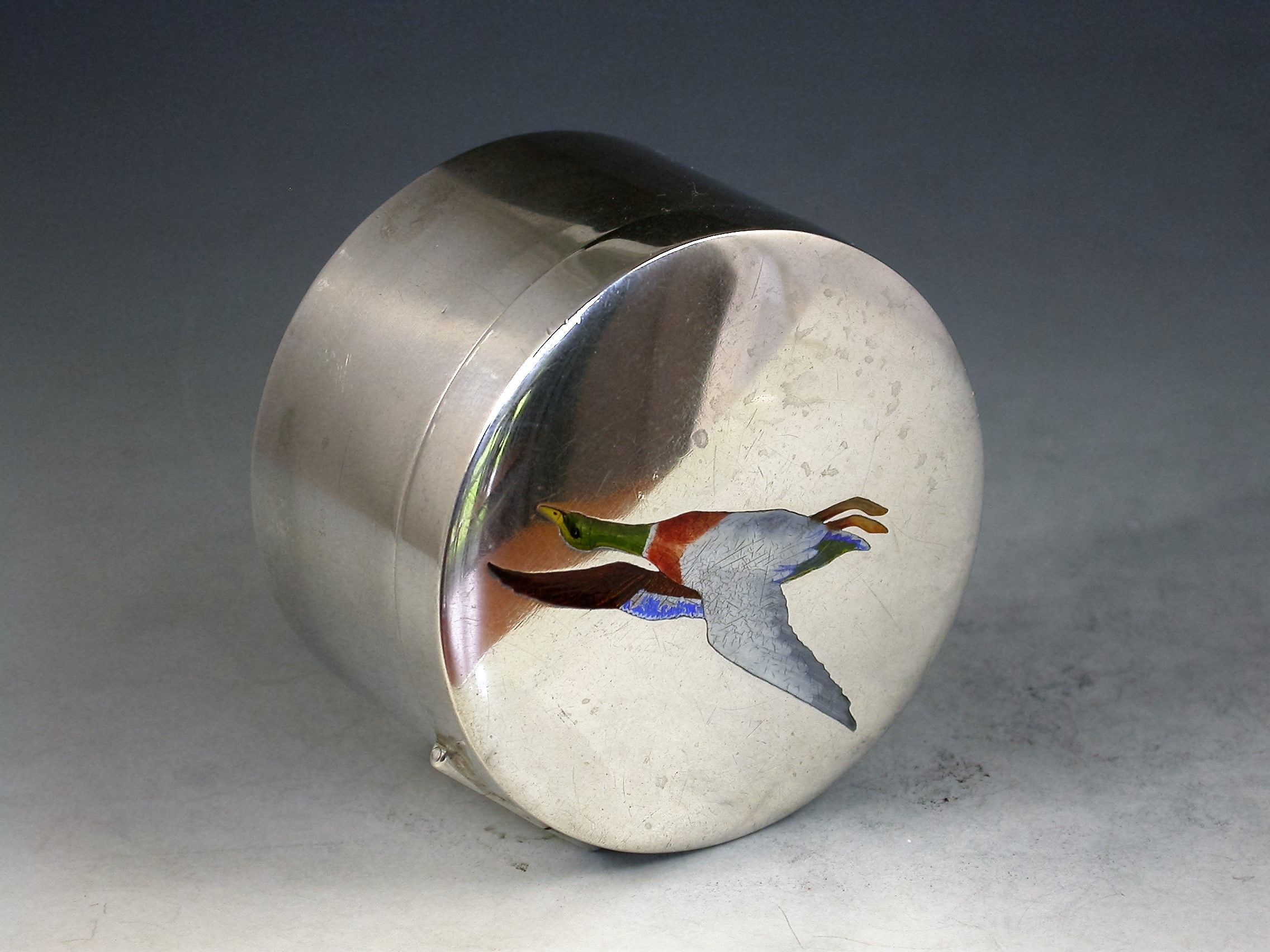 A good early 20th century sterling silver Stamp Box of circular form, the hinged lid enamelled with a flying Mallard Duck, the silver gilt interior complete with central spindle to hold a roll of stamps dispensed through a slot in the side of the box.