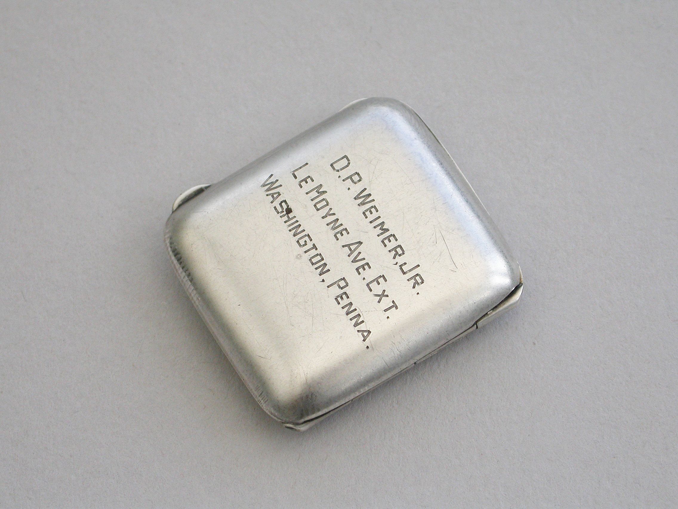 A good quality early 20th century American sterling silver Stamp Case of rounded rectangular form, the lid enamelled with a cancelled George Washington 3 cents stamp. The sprung hinged lid opening to reveal a gilded interior with a clasp to retain the stamps.