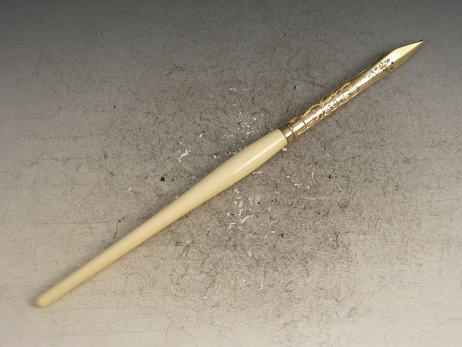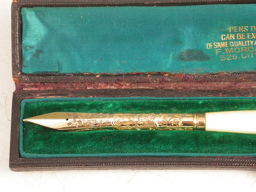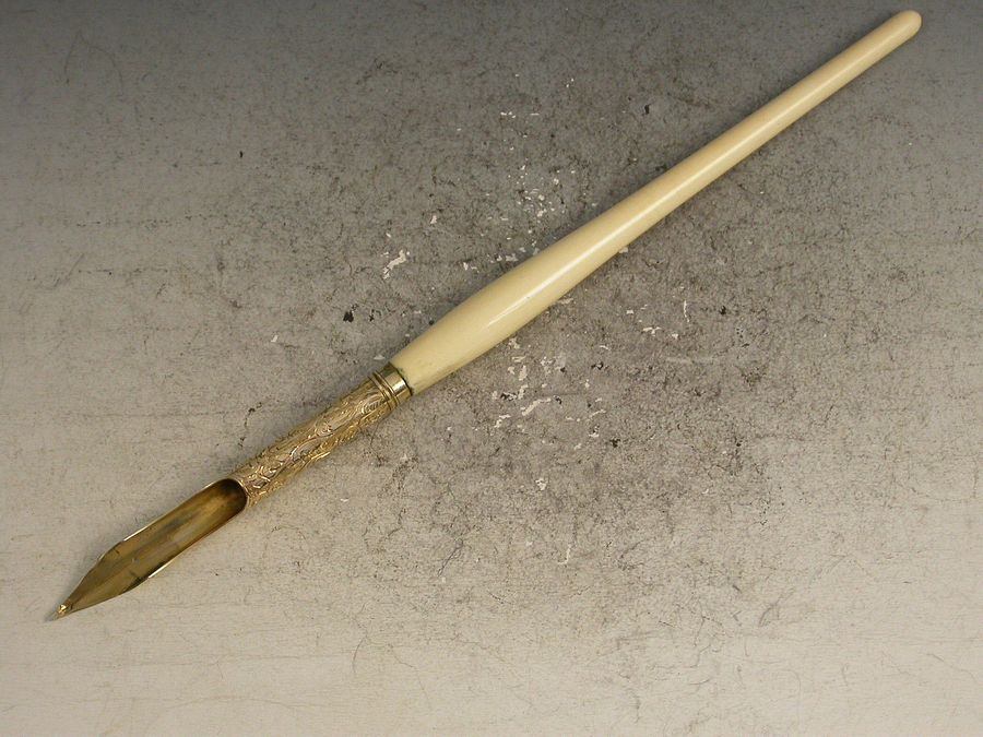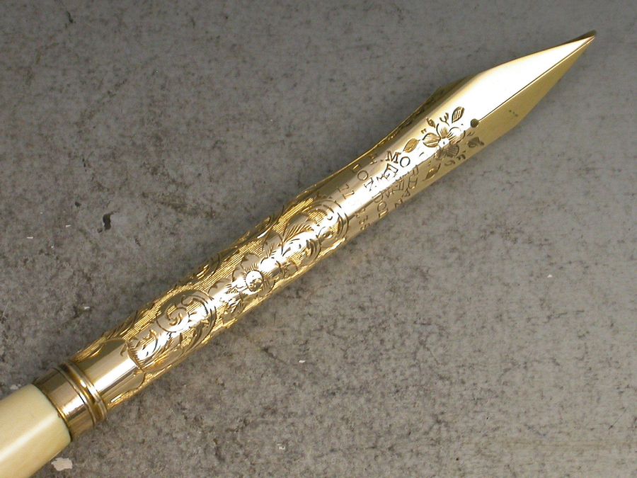 An extremely fine and rare Victorian gold Dip Pen with shaped ivory shaft and large magnum bonham barrel type gold nib finely engraved with foliate scrolls.