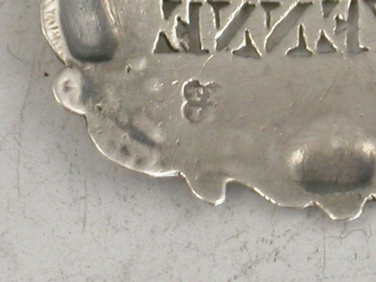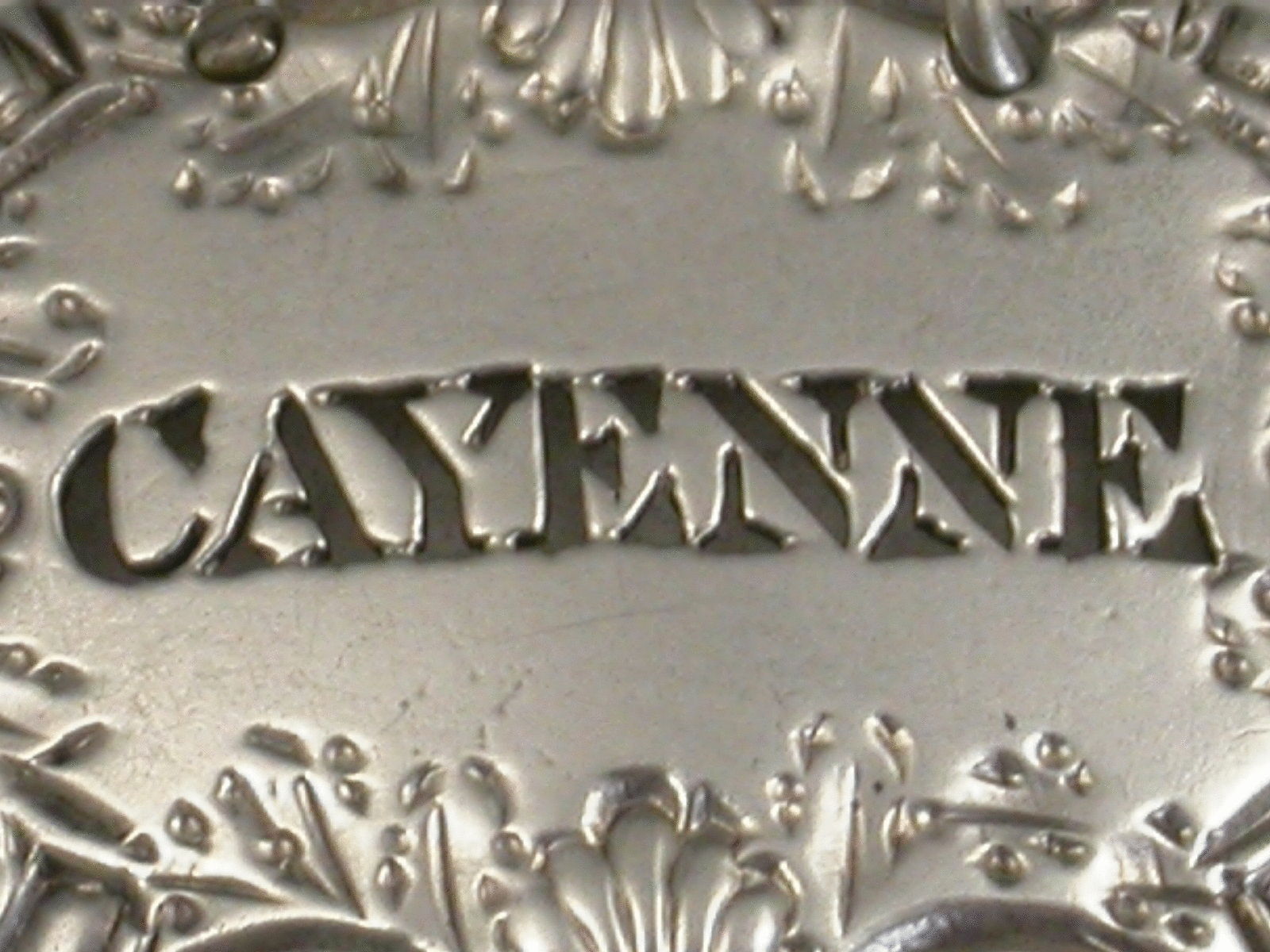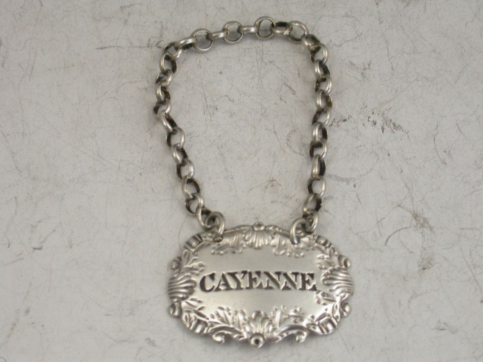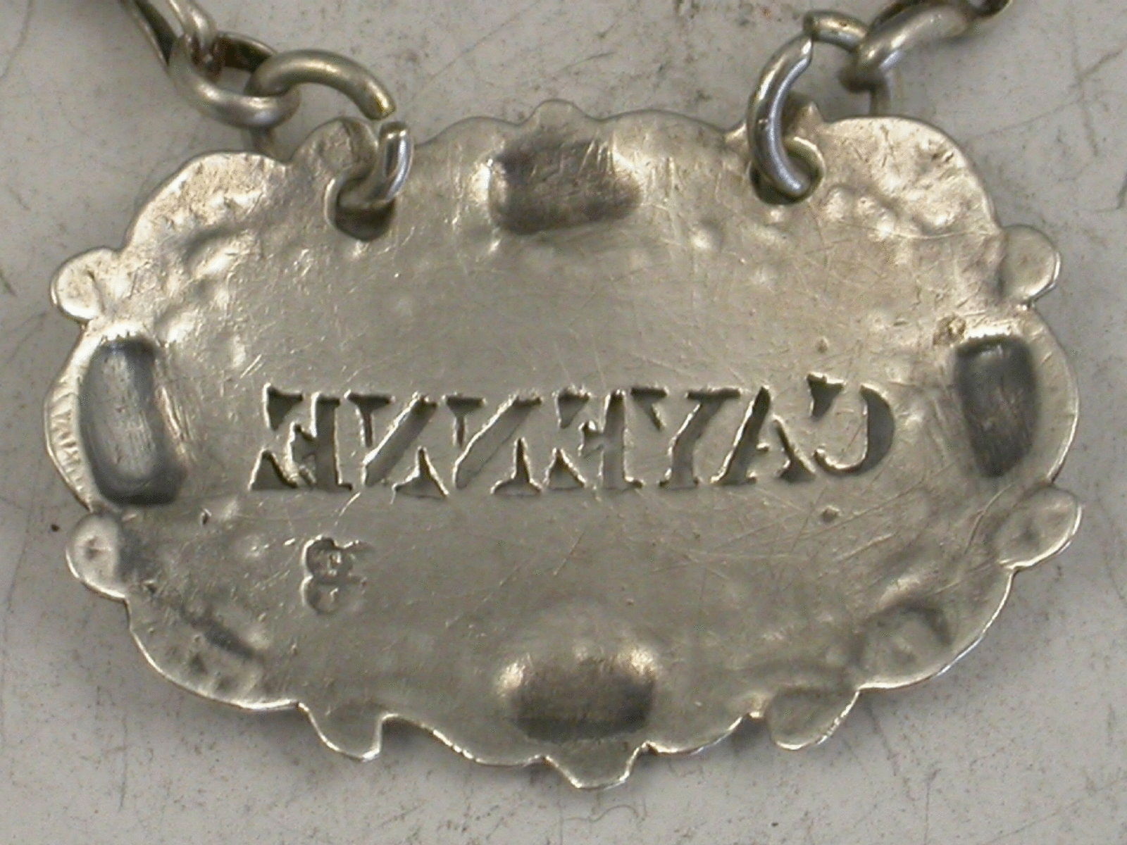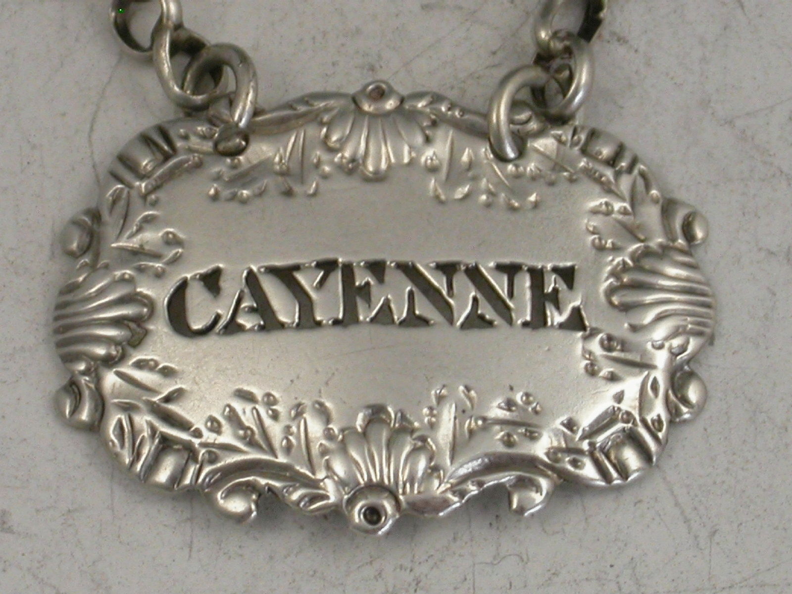 A rare George IV silver Sauce Label of shaped oval form with foliate shell and scroll border, pierced for Cayenne.