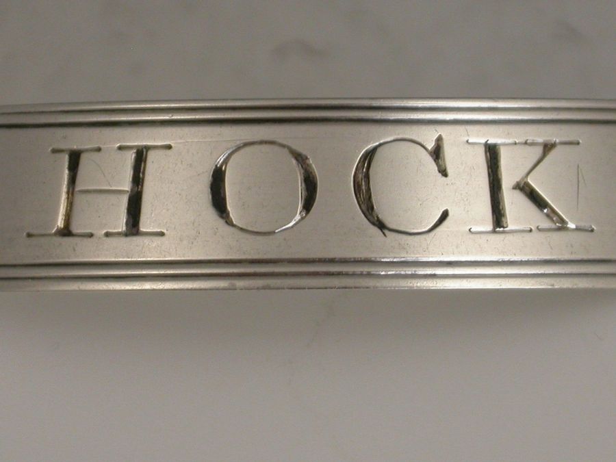 A good George III antique silver Wine Label of 'bottle collar' form with plain sloping sides with reeded borders, incised for Hock.
