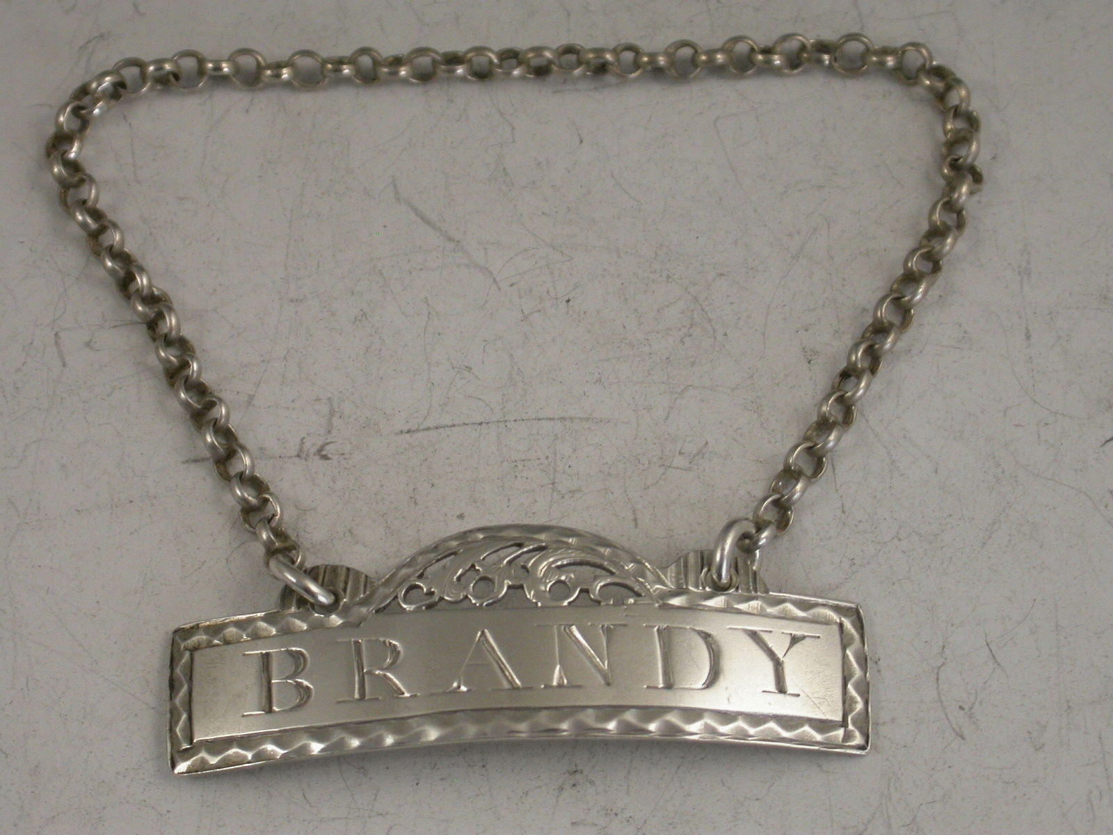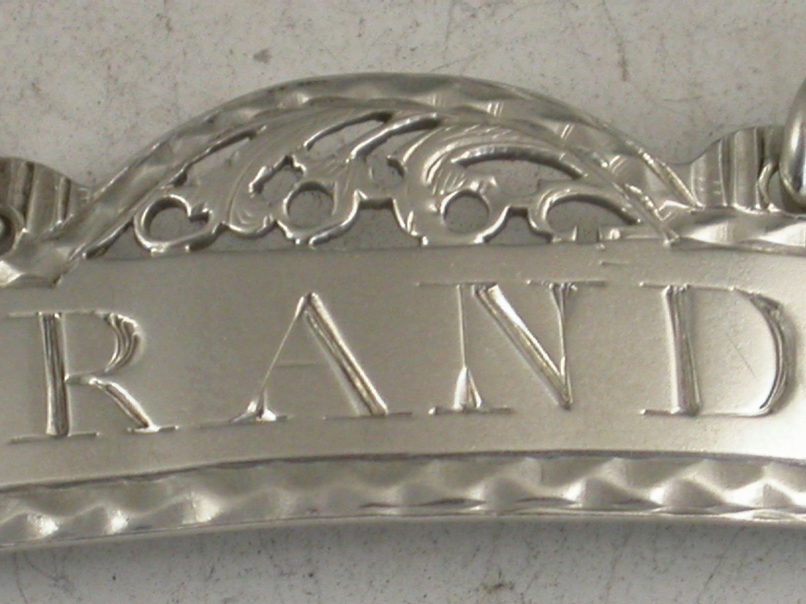 A fine George III silver Wine Label of narrow rectangular form with pierced fret dome above and raised eyelets, bright cut engraved feather edge border, incised for Brandy.