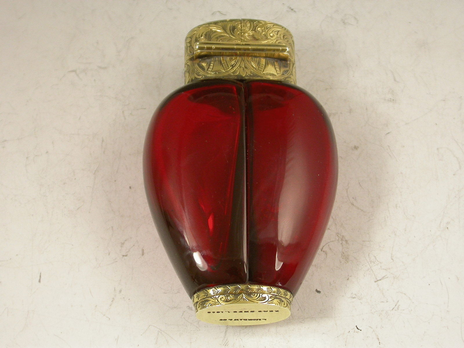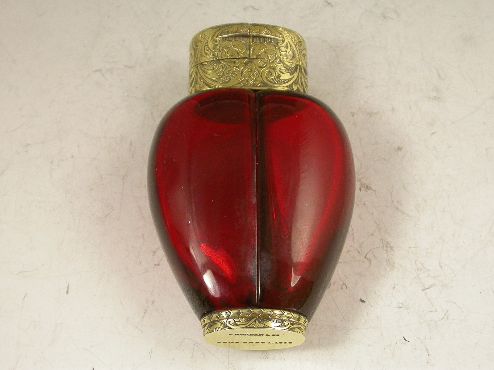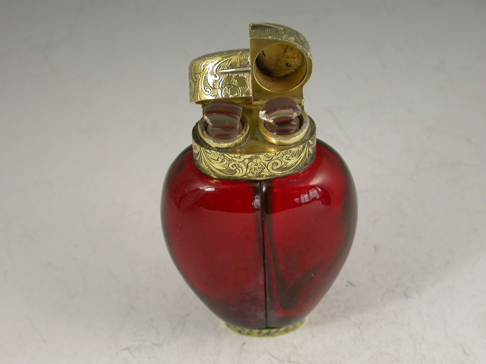 A fantastic quality Victorian silver gilt mounted red ruby glass double Scent Bottle, of heart shaped form, the two compartments allowing for different scents to be kept in the same bottle. The very fine foliate scroll engraved mounts with two hinged lids revealing original glass stoppers, the collar also engraved with a diamond Registration Mark for the 1st September 1858. This registration date is also (unusually) stamped to the base along with the makers name S Mordan & Co.