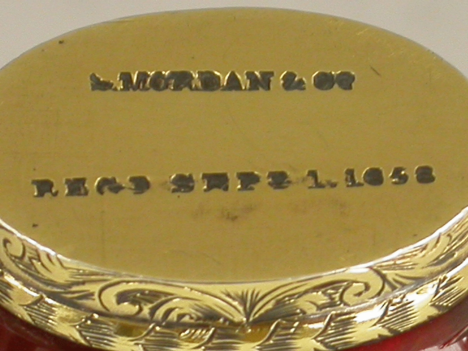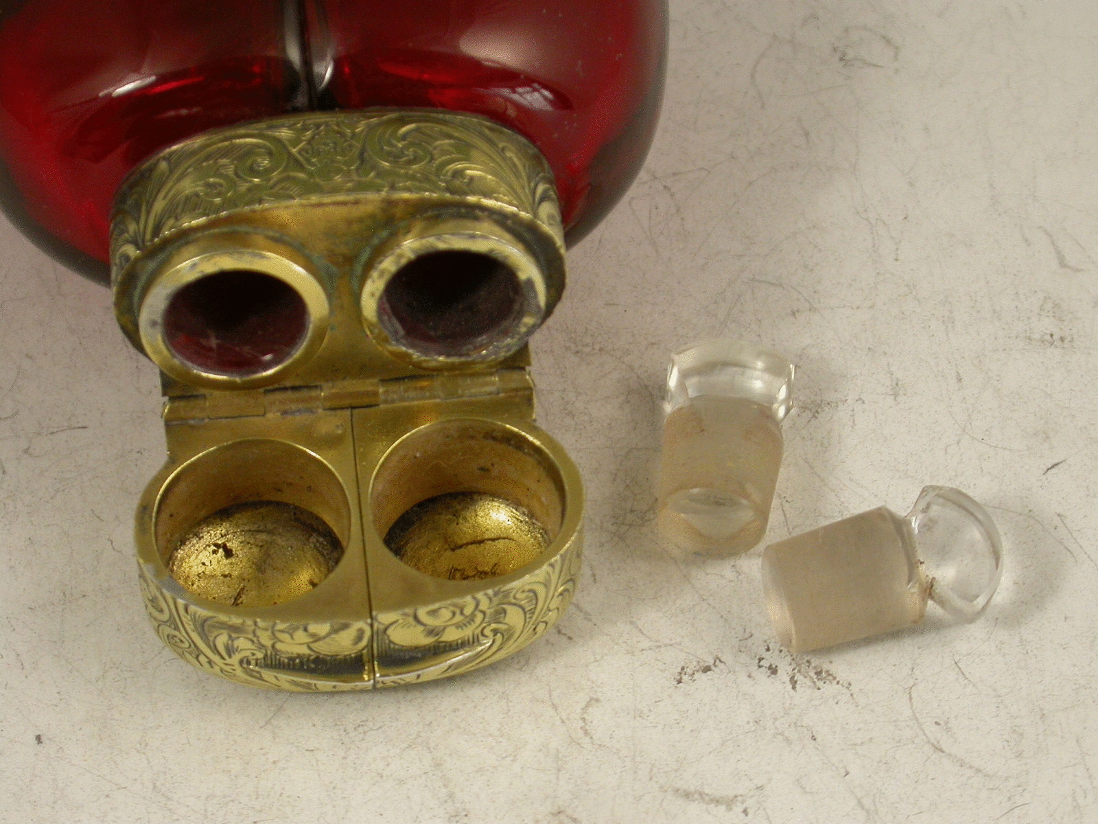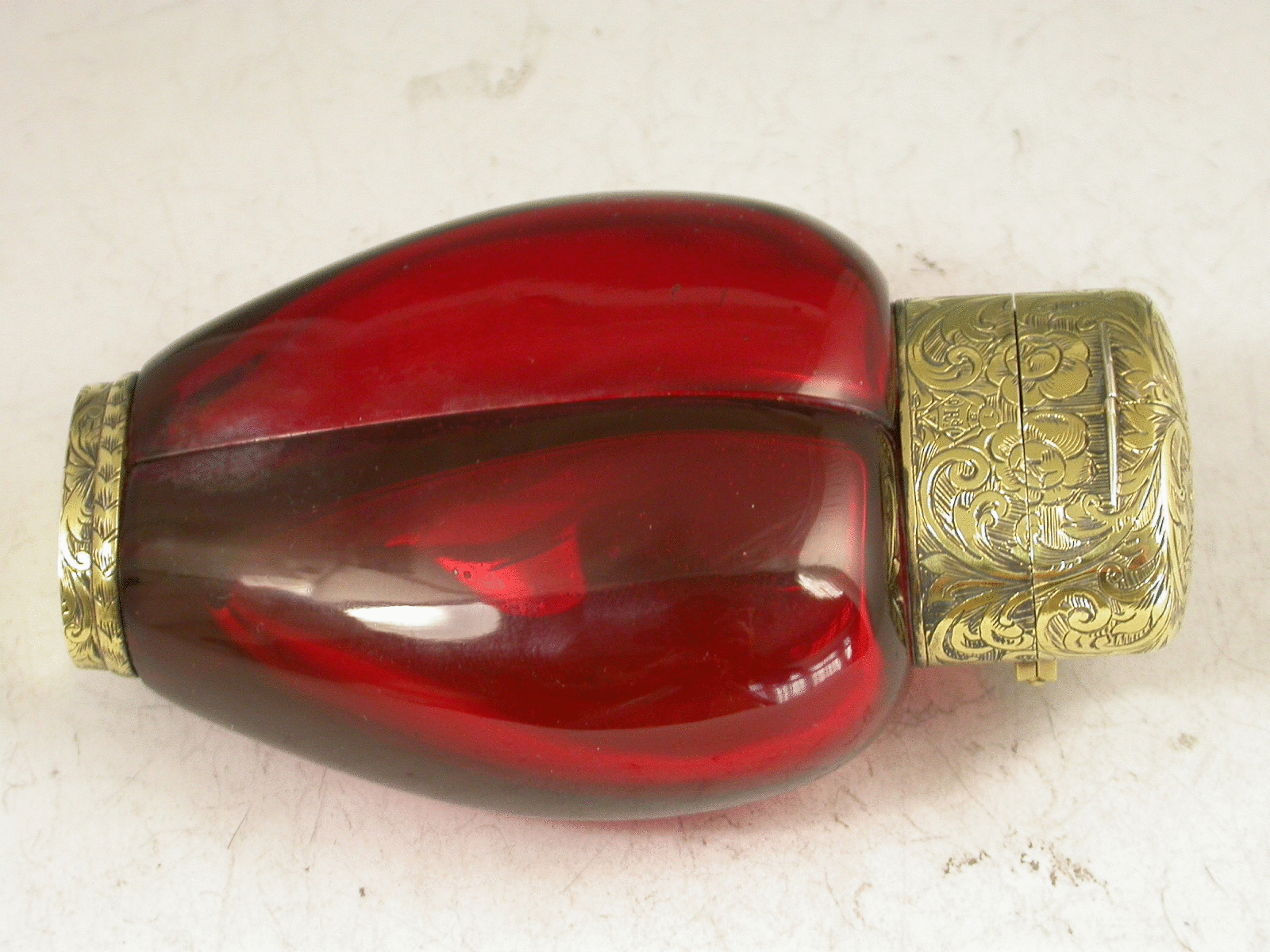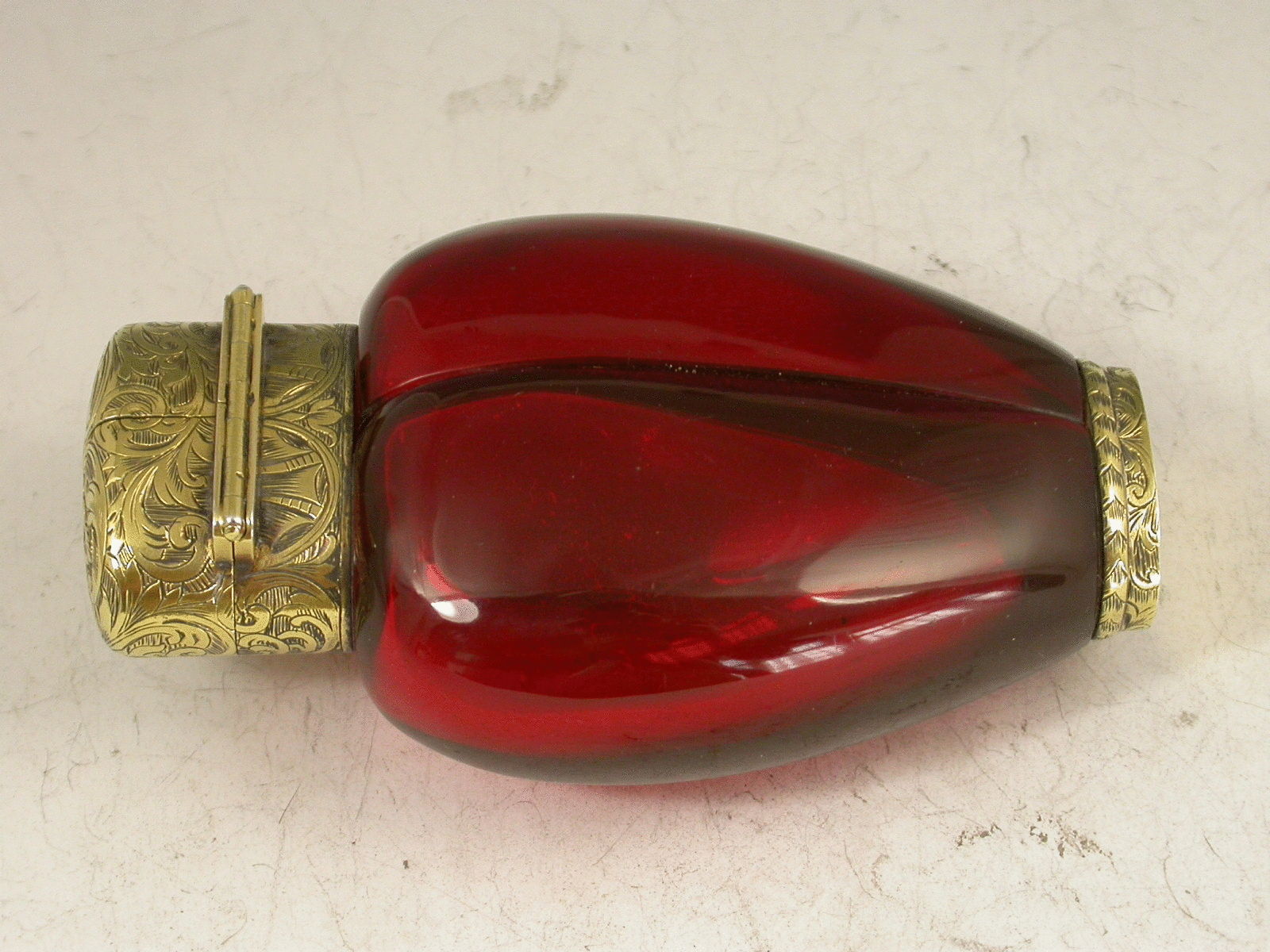 A fantastic quality Victorian silver gilt mounted red ruby glass double Scent Bottle, of heart shaped form, the two compartments allowing for different scents to be kept in the same bottle. The very fine foliate scroll engraved mounts with two hinged lids revealing original glass stoppers, the collar also engraved with a diamond Registration Mark for the 1st September 1858. This registration date is also (unusually) stamped to the base along with the makers name S Mordan & Co.