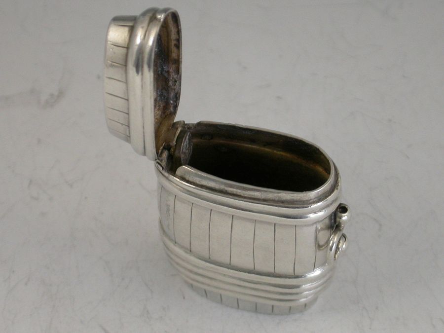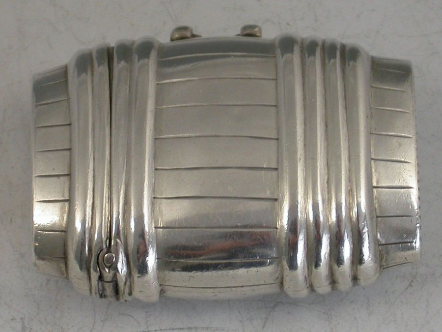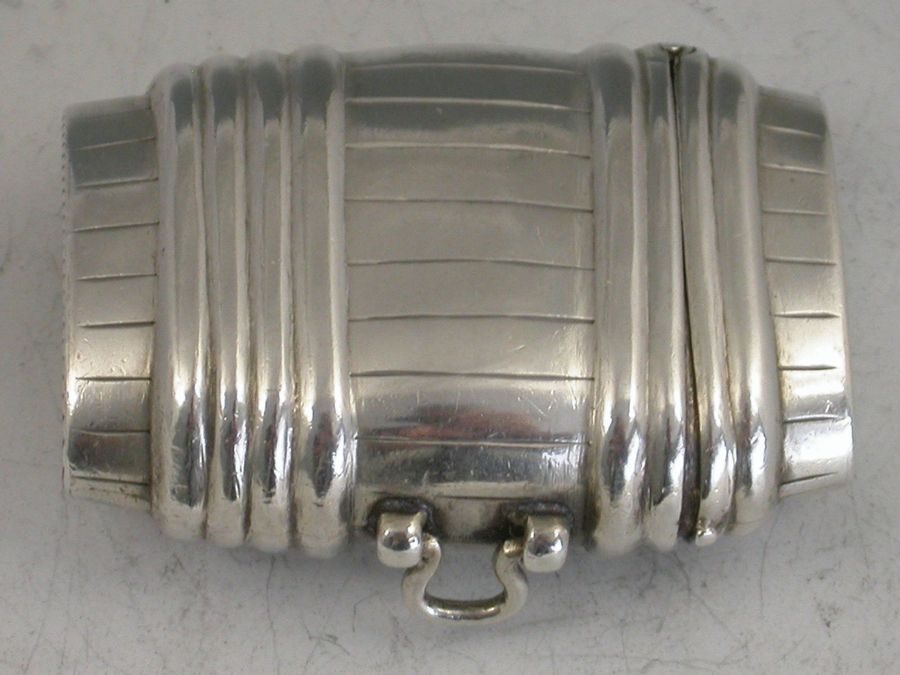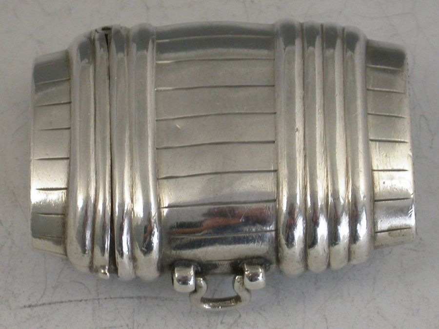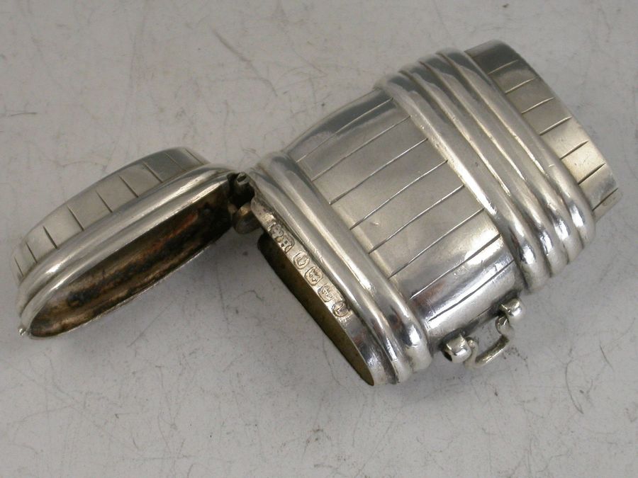 A rare Victorian novelty silver Vesta Case made in the form of a coopered barrel with attached carrying handle, sprung hinged lid and striker to base.