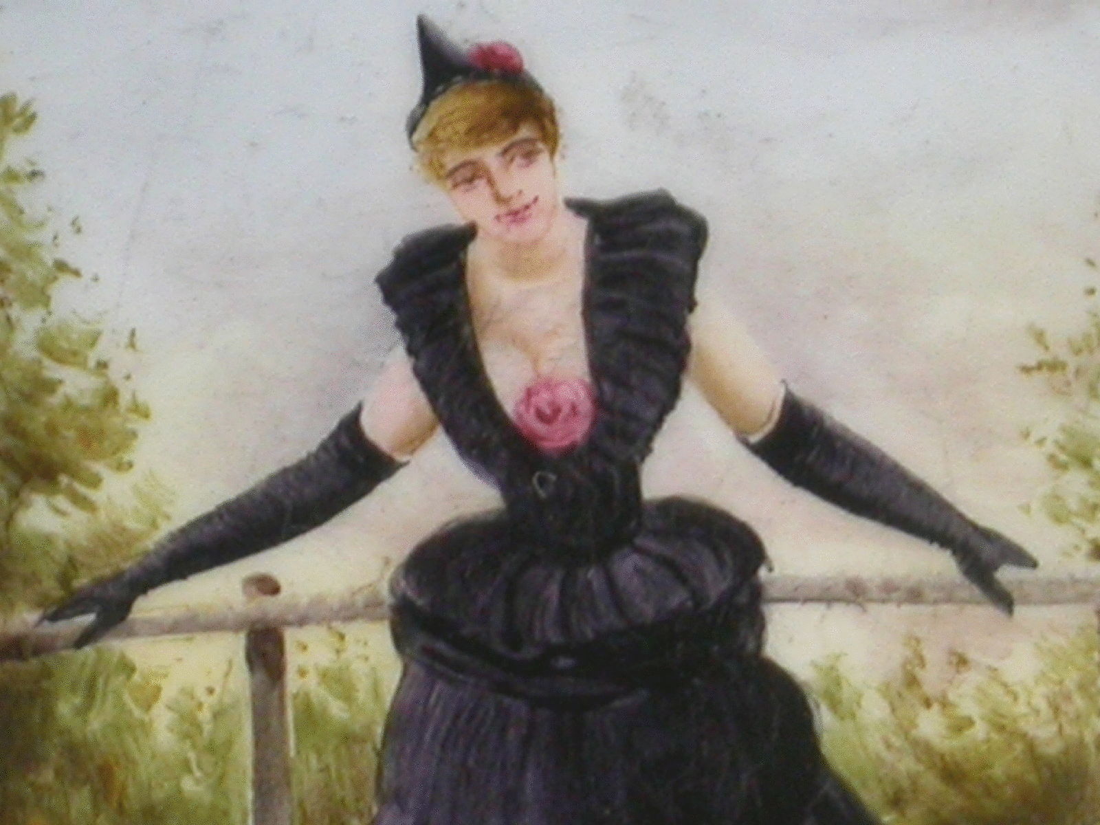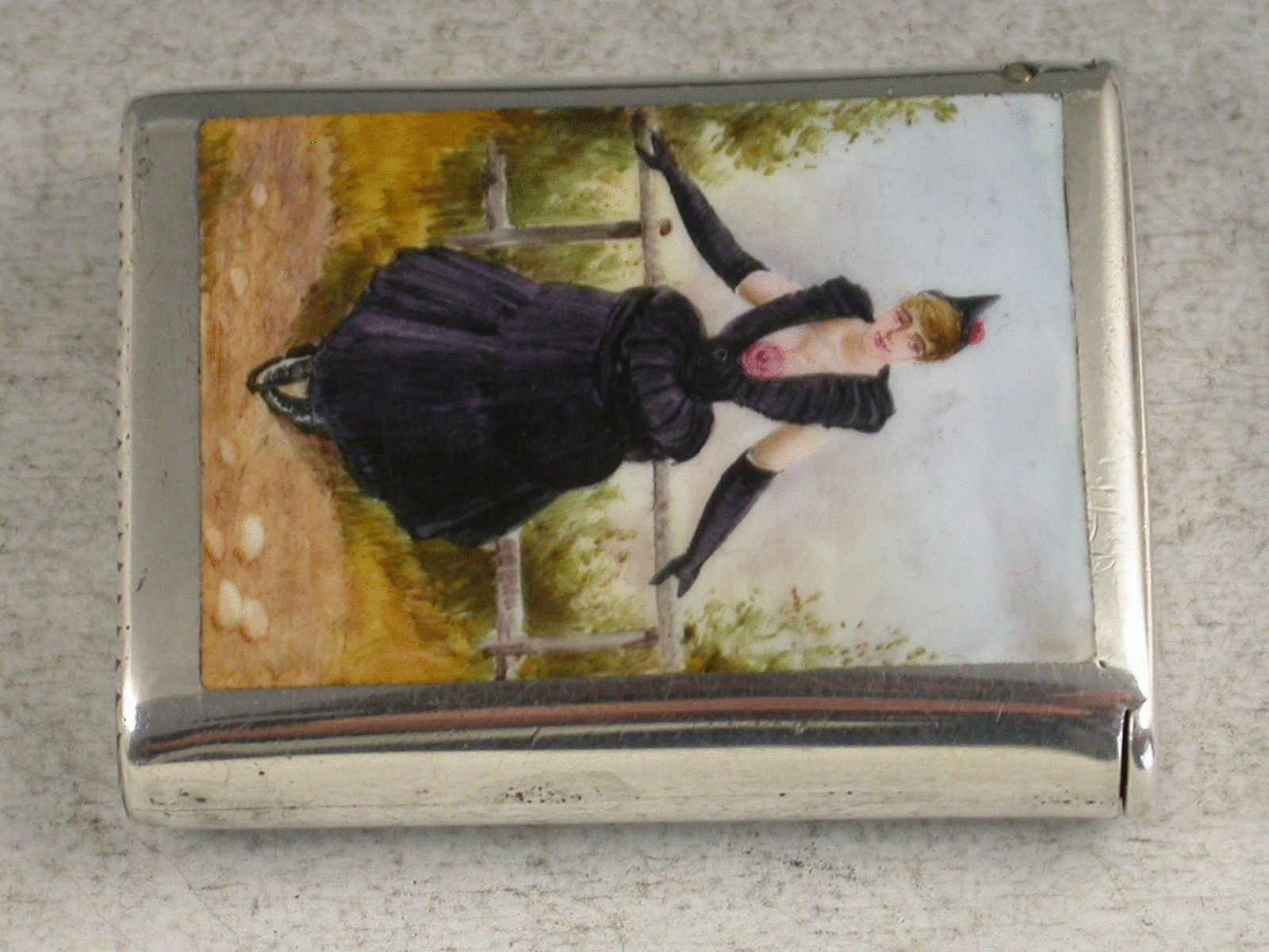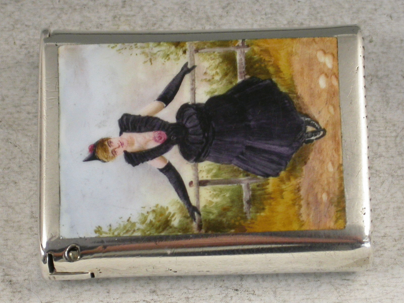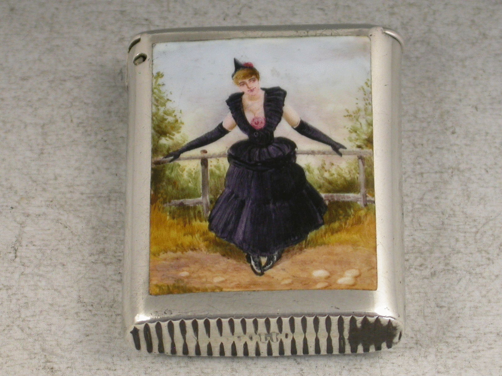 A good Victorian silver and enamel Vesta Case of rounded rectangular form with sprung hinged flat top lid, the enamelled panel depicting a glamorous lady in a black dress with a pink rose in her cleavage' leaning against a fence.