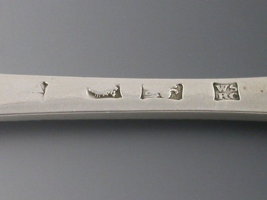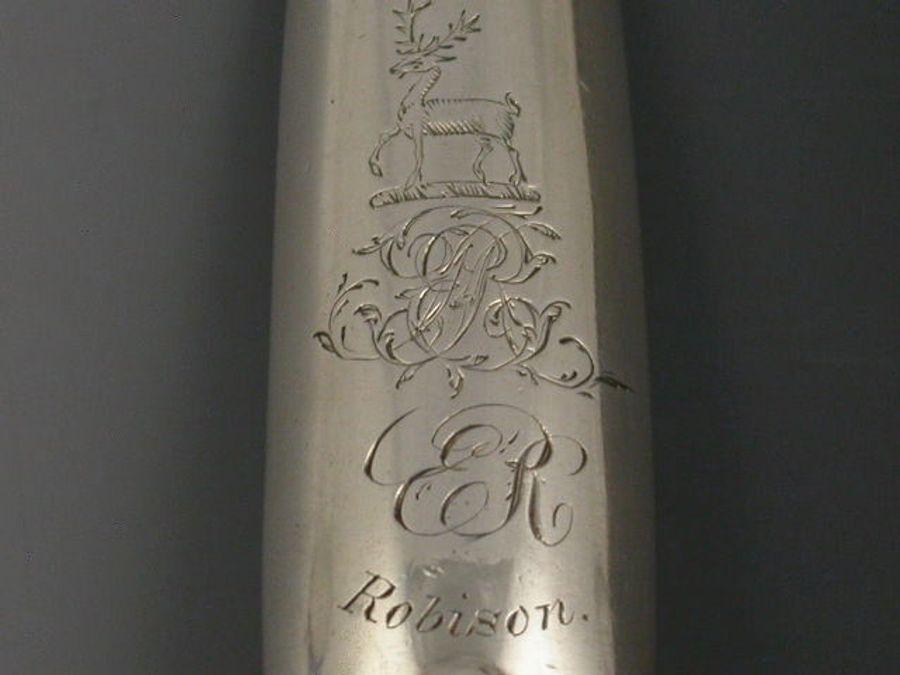 A fine George III silver Marrow Scoop with bead edge handle, the bowl engraved with a Stag Tripant, two sets of script initials and the family name; ""Robison"".