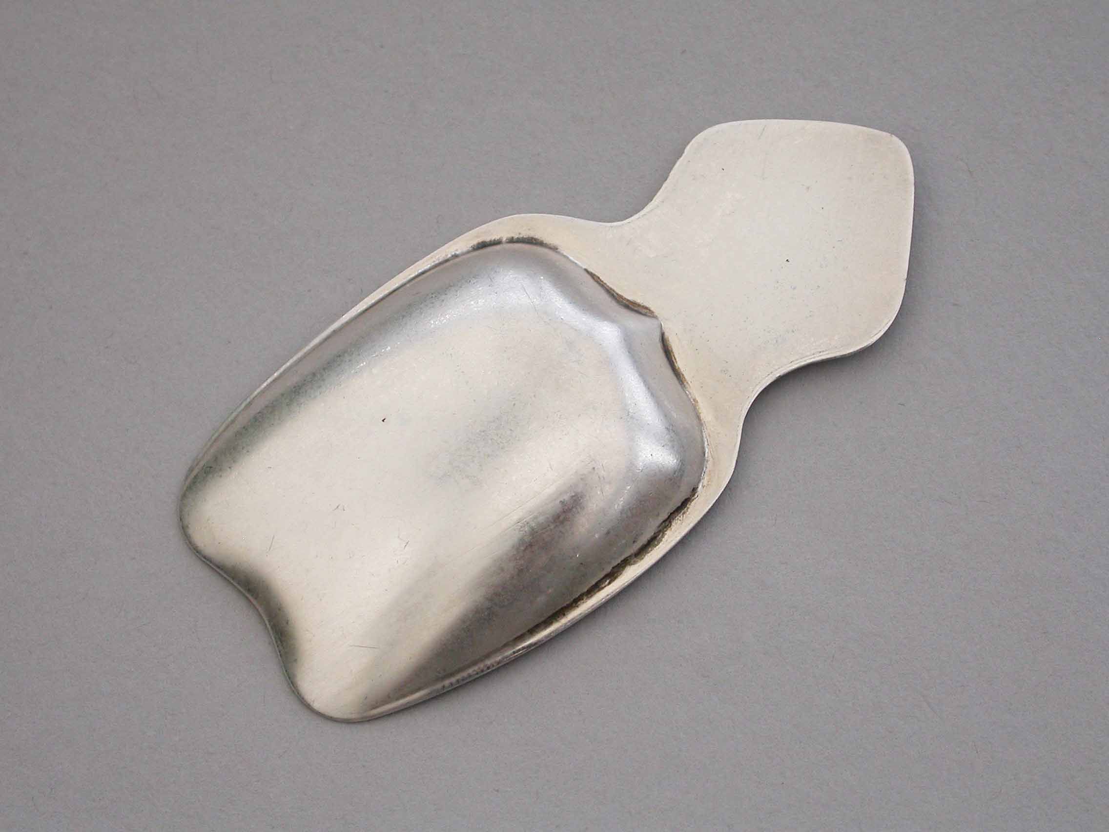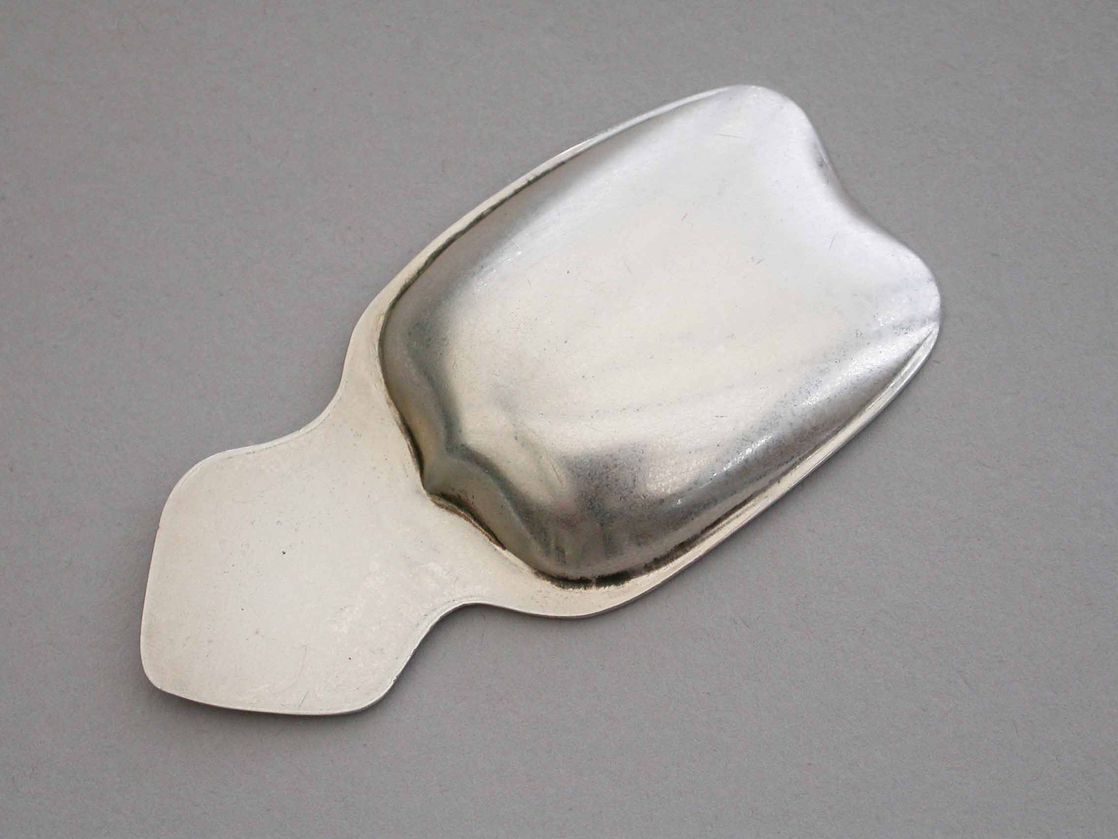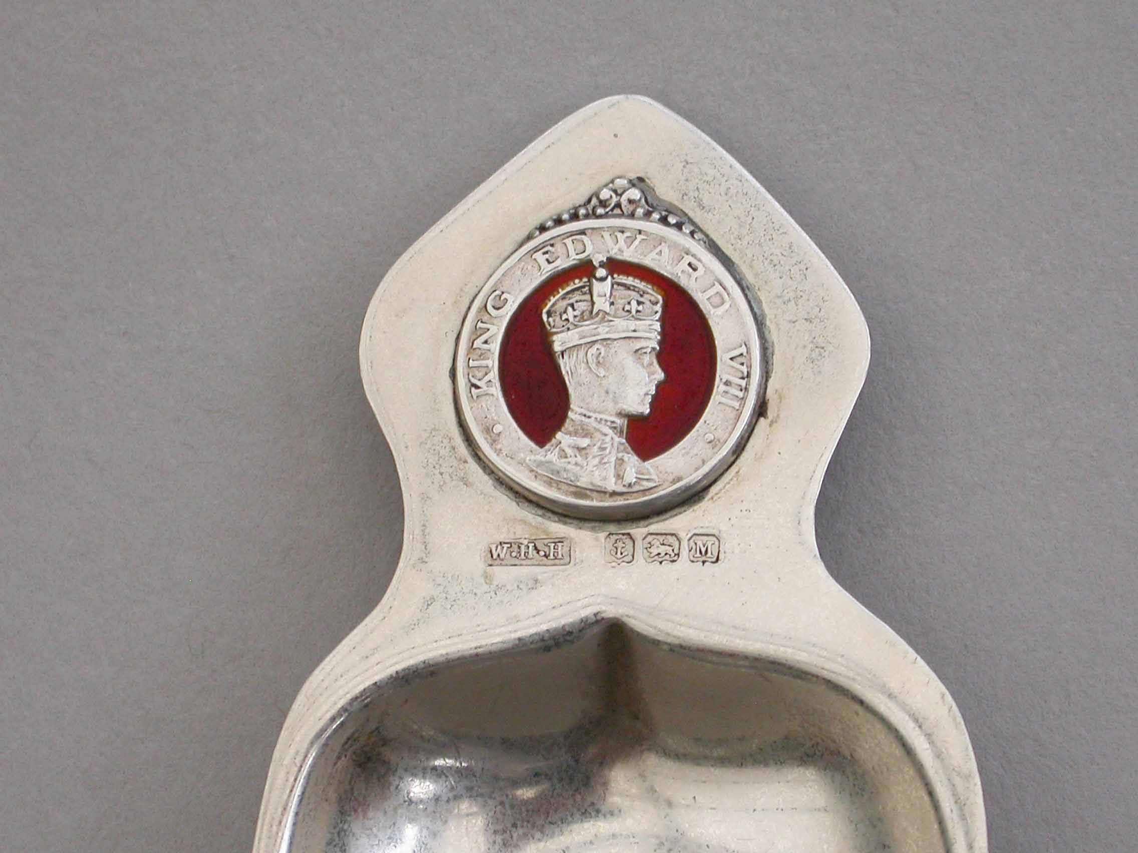 An Art Deco style commemorative silver Caddy Spoon made to celebrate the Coronation of Edward VIII on 12th May 1937, depicting a busts of the future King within a garter belt on a red enamel background.