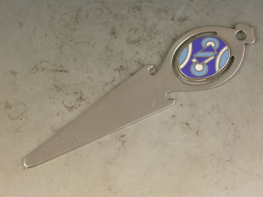 A George V silver Bookmark, the pierced handle with applied enamel disc depicting Art Deco style symbols in blue and white enamels.