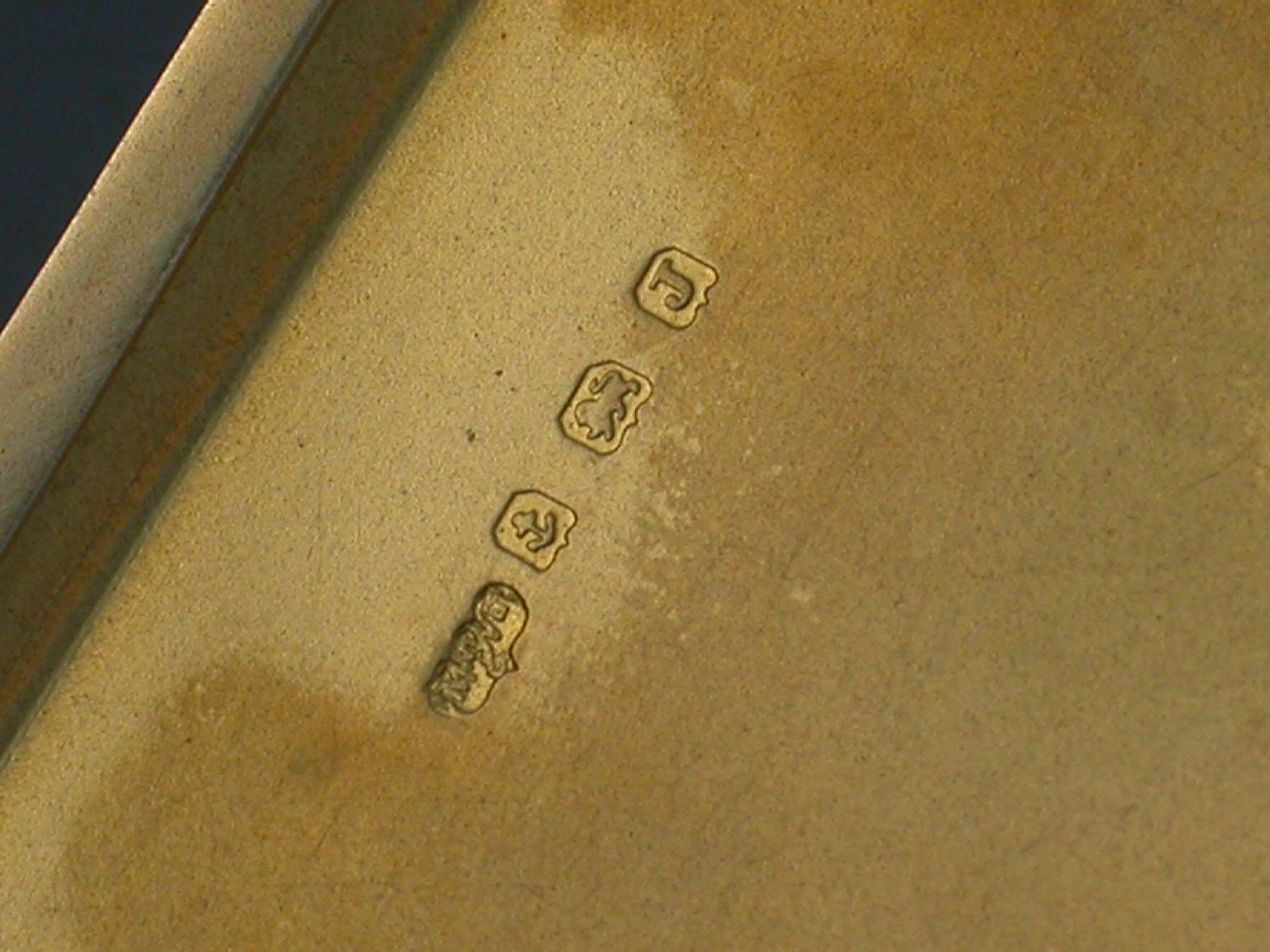 An early 20th century English silver and sage green guilloche enamel Cigarette Case of rectangular form with stepped sides. Engine turned base and silver gilt interior.