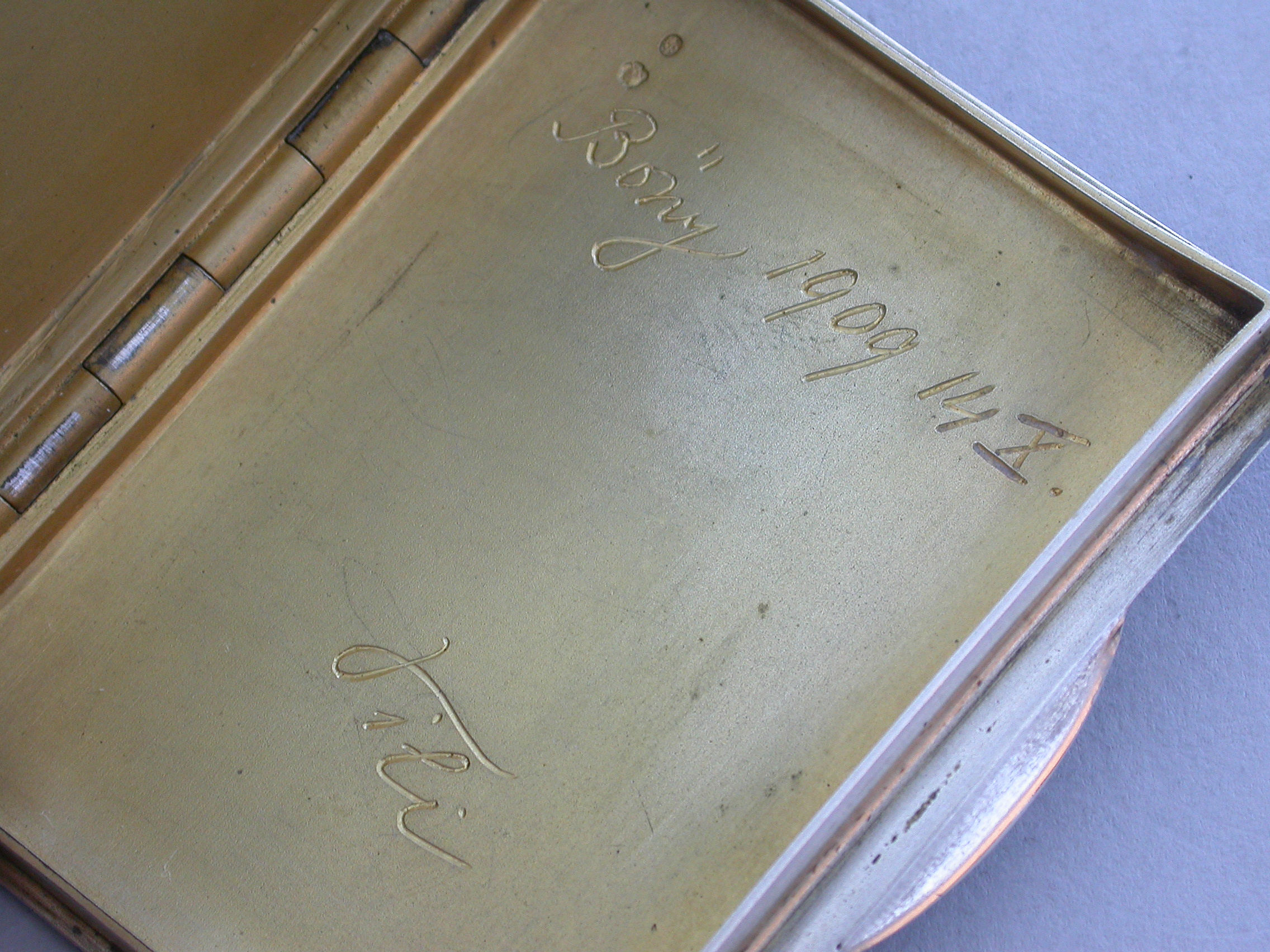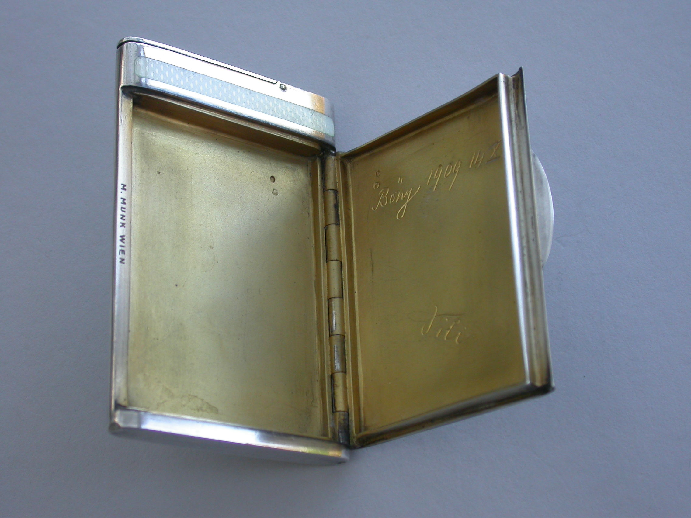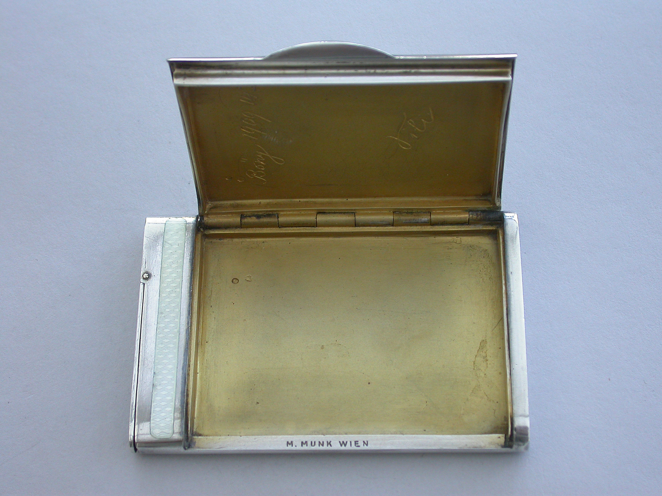 A very fine and heavy quality Art Deco style silver and white guilloche enamel combined Cigarette and Vesta Case, of flat rounded rectangular form with two hinged lids and silver gilt interior. Engraved with presentation inscription - ""Bony 1909 14 X. Sili"". The interior rim stamped with the owners name - M Munk Wein. Possibly the personal property of the famous Austrian Publisher of Art.